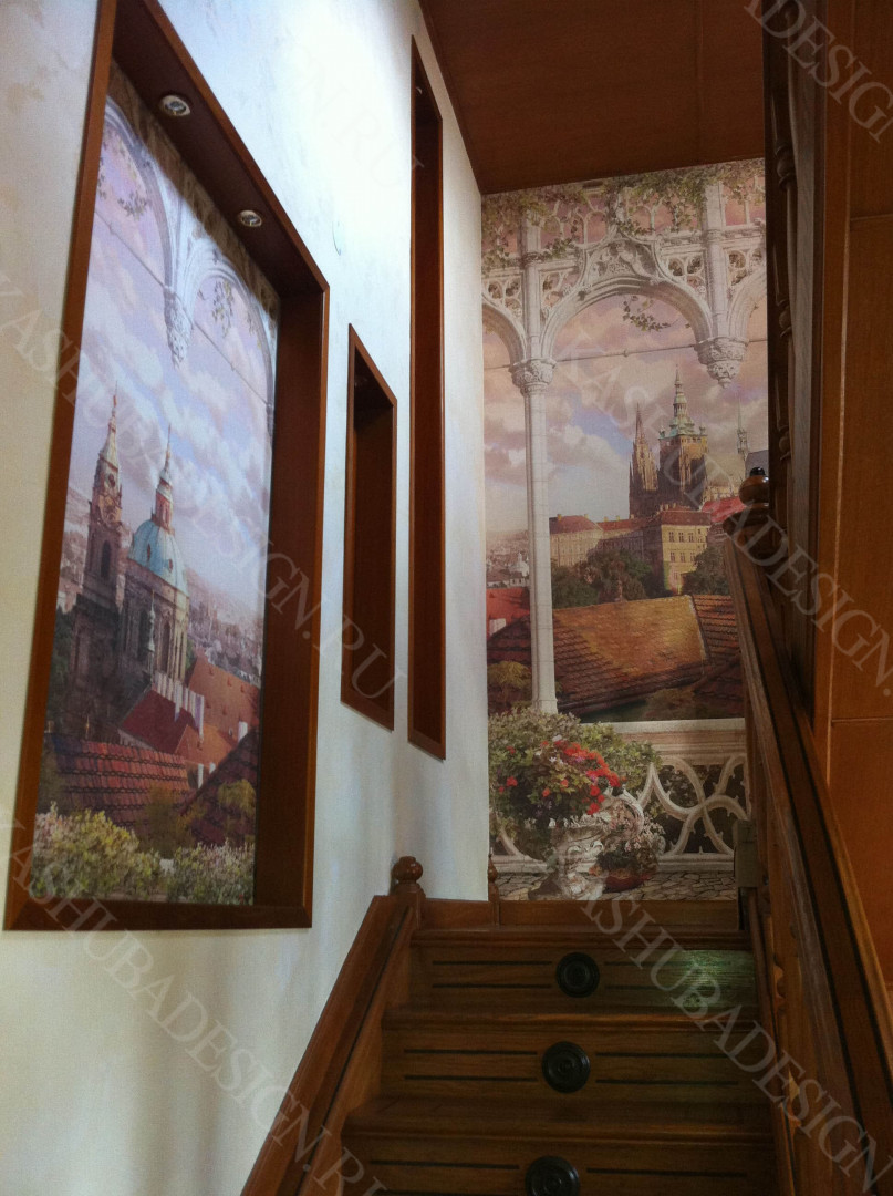Входная группа и лестница на верх красивейшим образом объединены настенной росписью, создающей особый настрой у входящего.