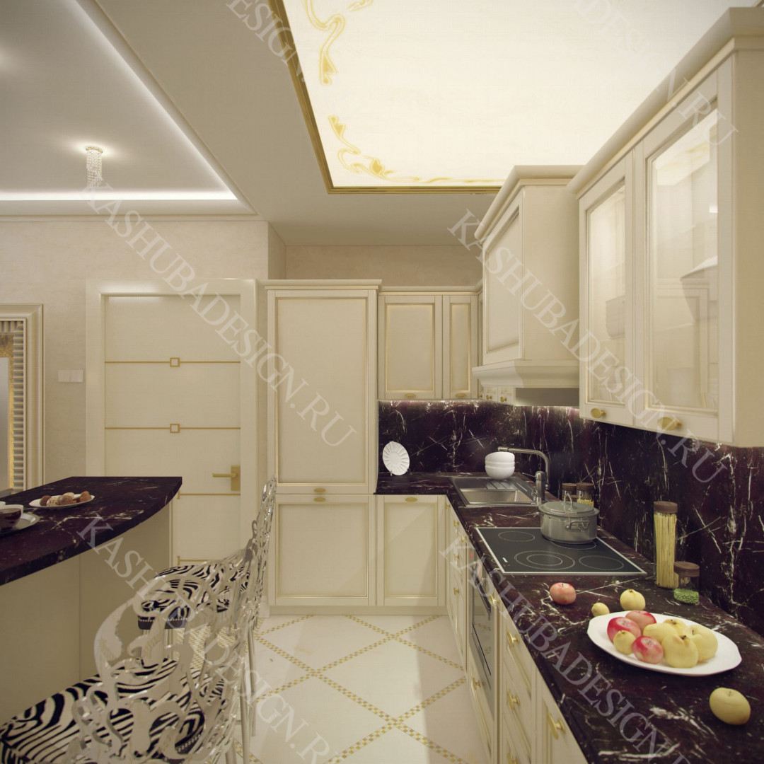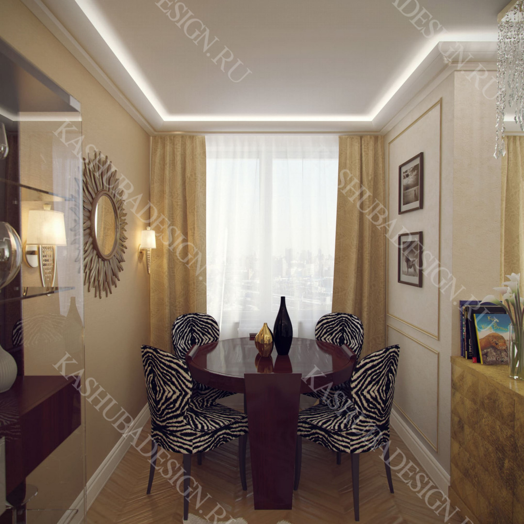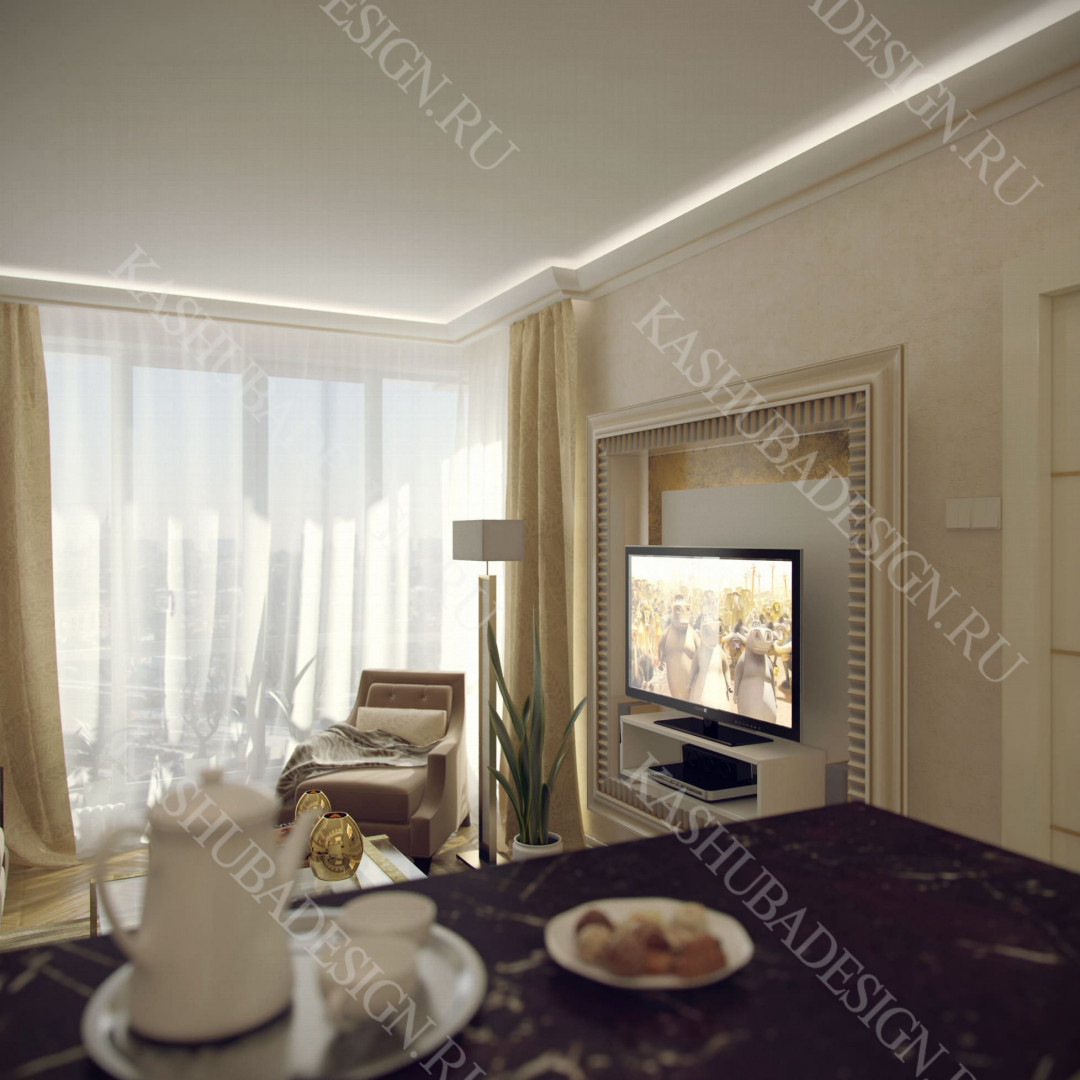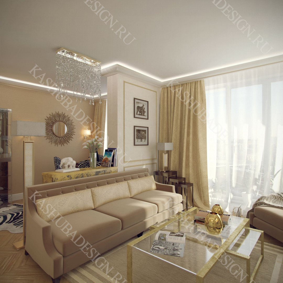 Гостиная, столовая и кухня объединяются в едином пространстве, обладающем легкими элементами декора, конструкциями изящных форм. Самым сложным, по мнению специалистов Международного бюро интерьера и архитектуры «KASHUBA DESIGN», является учёт психологического аспекта жильцов, т.к. одна и та же комфортная обстановка должна способствовать расслаблению (отдыху), поднятию настроения, сохранению работоспособности.