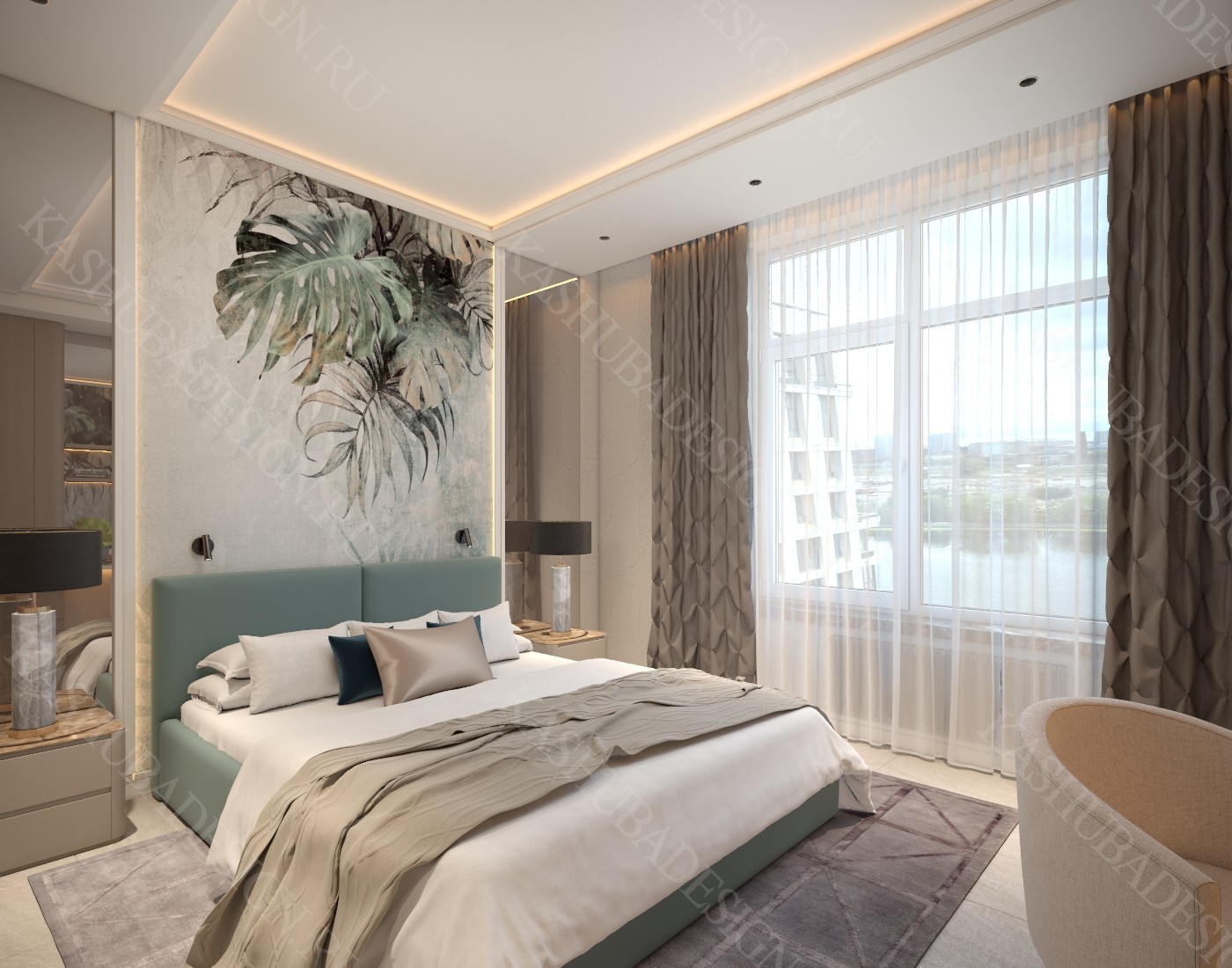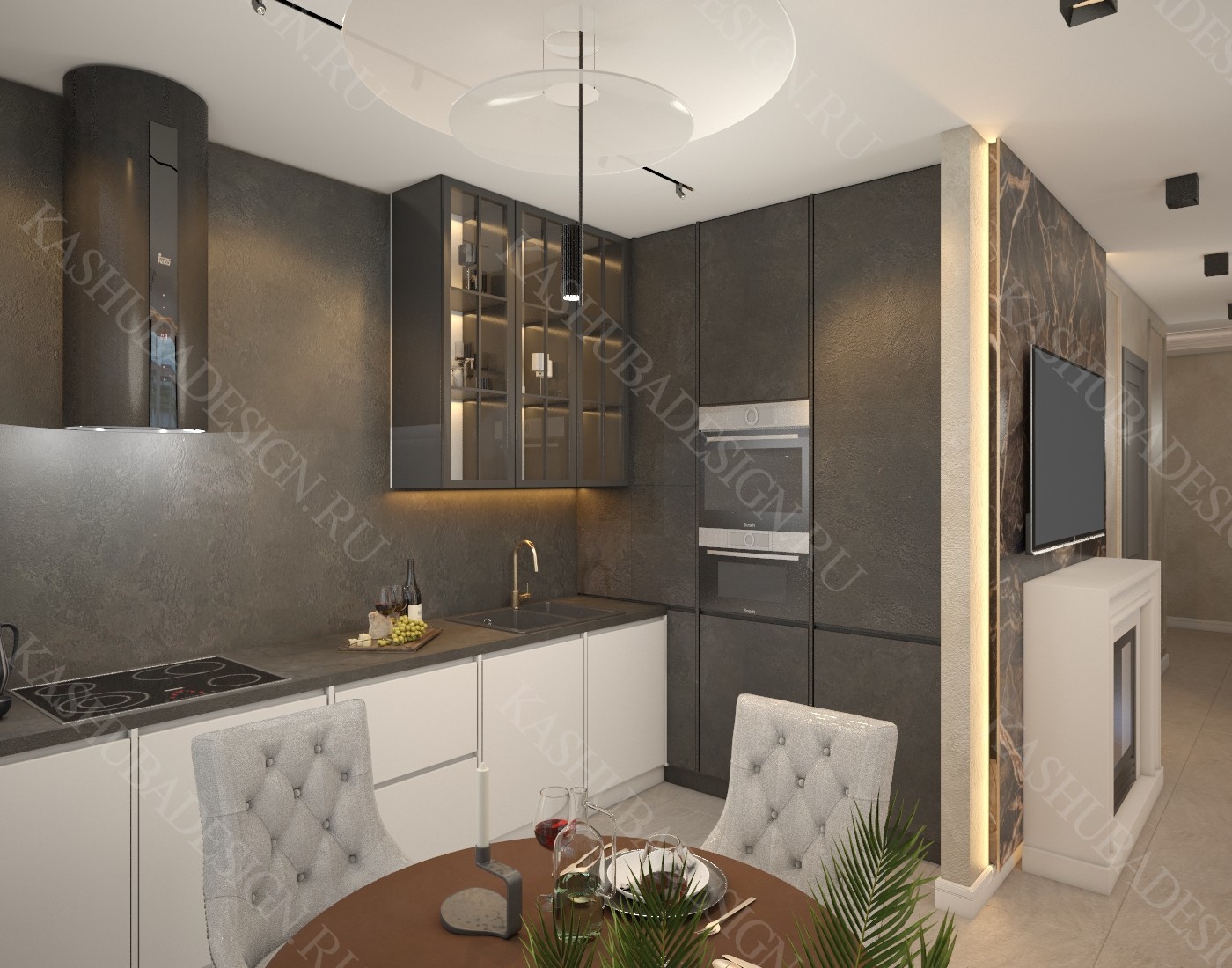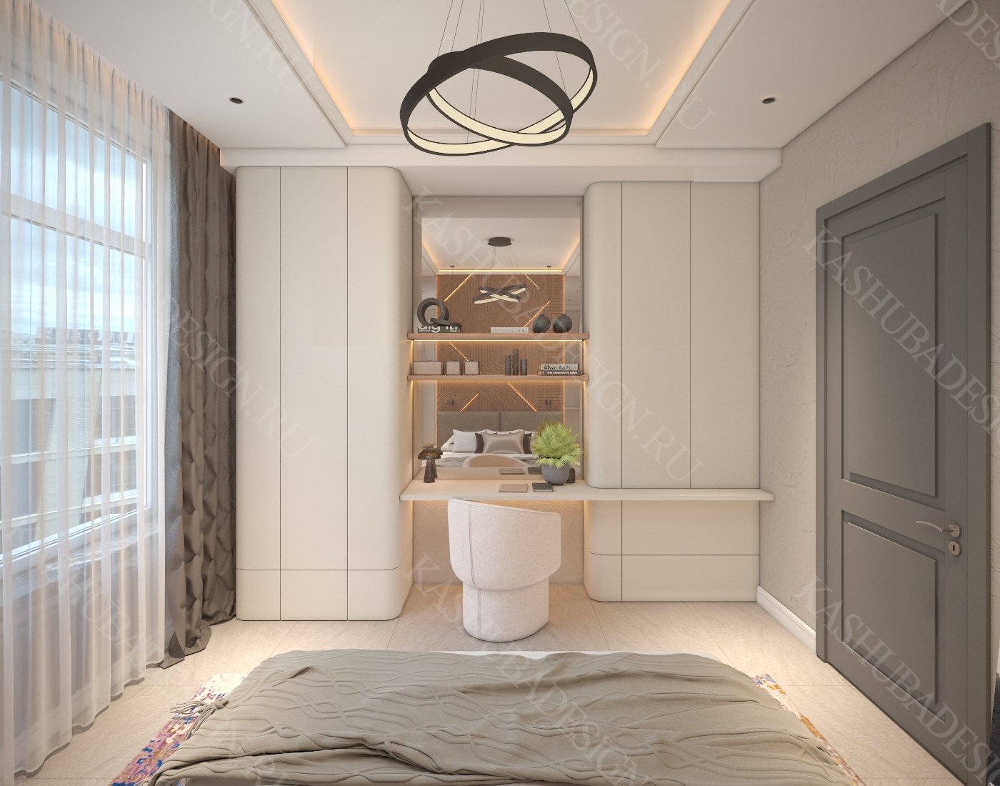 Дизайн-бюро «Kashuba Design» была разработана новая планировка. Планировка квартиры предусматривает входную зону, холл, просторную ванную комнату с отдельностоящей ванной и отдельной душевой, а также с постирочной зоной, спальню, кухню-гостиную с обеденной зоной и с рабочей зоной на лоджии. При небольшой площади квартиры удалось реализовать все пожелания заказчицы.