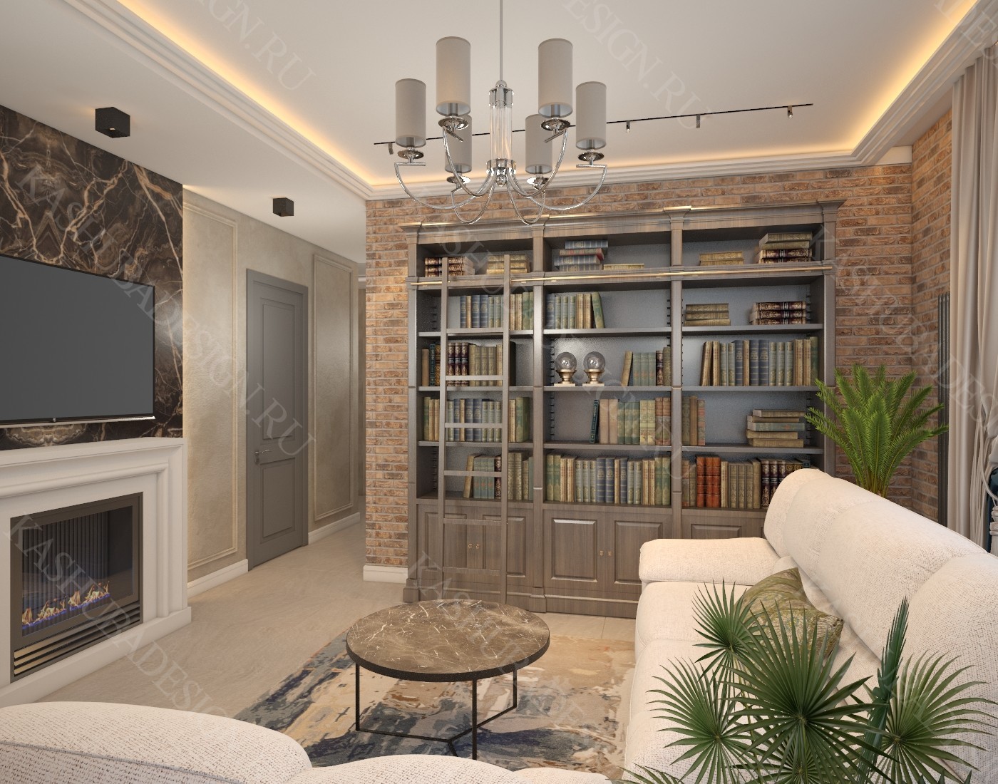 В отделке квартиры преобладают натуральные материалы: по пожеланию заказчицы, на полу везде - керамогранит. На стенах используются декоративные штукатурка, клинкерный кирпич, который придает помещениям уют и тепло, по потолку идет потолочный карниз с подсветкой. В спальне в изголовье кровати применены фрезерованные деревянные панели с подсветкой. Интересным элементом в квартире является мраморная плита на стене за камином и ТВ, которая является акцентом гостиной. В квартире применено много различных видов освещения для создания разных сцен освещения. По цветовой гамме в квартире преобладают спокойные, теплые, натуральные цвета.