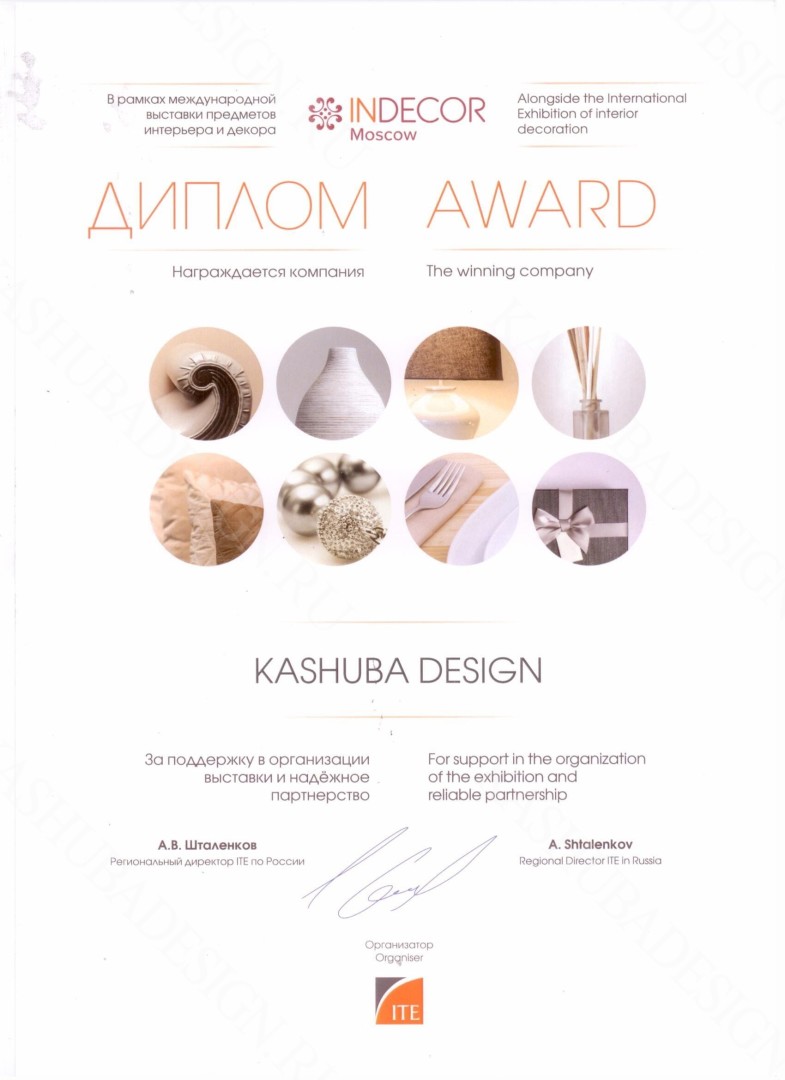 В год своего ХХ -летия бюро «KASHUBA DESIGN» экспонент 5-ой Международной выставки предметов интерьера и декора «InDecorMoscow» (10-13 октября 2018) в МВЦ «Крокус-Экспо». Организатор этого мероприятия – Группа компаний ITE, лидер рынка выставочных услуг России. InDecor Moscow – замечательный выставочный проект формата «бизнес для бизнеса», где демонстрируются стильные дизайнерские предметы интерьера и декора, аксессуары для дома - мебель, посуда, предметы сервировки и украшения стола, светильники, пледы, коврики, парфюмерия для дома, новогодний декор и многое другое, а также отражаются последние тенденции и новинки индустрии дизайна и декорирования помещений. На выставке (павильон 2, зал 9), первый[u2] посетитель стенда нашего бюро получит в подарок золотую наклейку, остальные, по согласованию с редакцией, получат(бесплатно) популярный глянцевый журнал «РRO - интерьер, дизайн и декор» (лето – осень 2018).