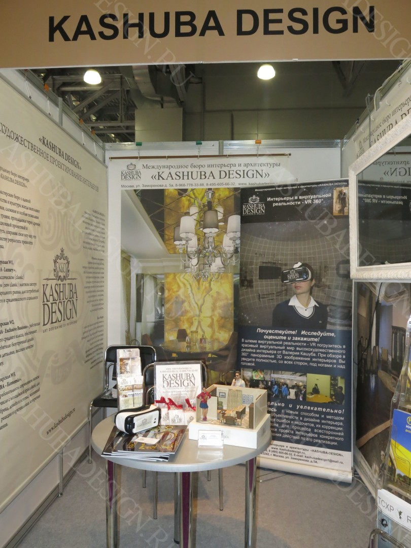 Международное бюро интерьера и архитектуры «KASHUBA DESIGN» на своих стендах от 60 до 9 кв. м. в различных по тематике выставках (8-10 ежегодно) традиционно использует динамическое взаимодействие двух функциональных зон: предметно - экспозиционной и мультимедийной. Имеет место модульность экспонируемых объектов, их изменяемость и сменяемость, включая символику, цветовые сочетания и геометрические формы. На каждой выставке, экспозиция стенда запускает динамический процесс современной жизни, происходит временной скачок из современности, с отголосками прошлого и перспективами для будущего. Примеры созданных эксклюзивных проектов, как самостоятельных систем, несут идеологию мечты, реализованной в дизайне интерьера, в конкретную жизнь. Десятки тысяч посетителей стендов бюро подтверждают выбранное гибкое направление экспонирования и принятый динамичный вектор развития с взаимодействием между собой всех элементов пространства стенда. В систему входит знакомство со специалистами бюро, дизайнерами, архитекторами.