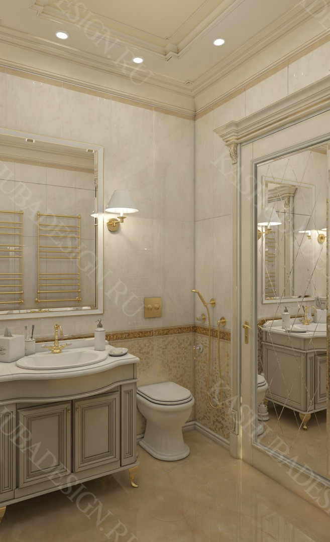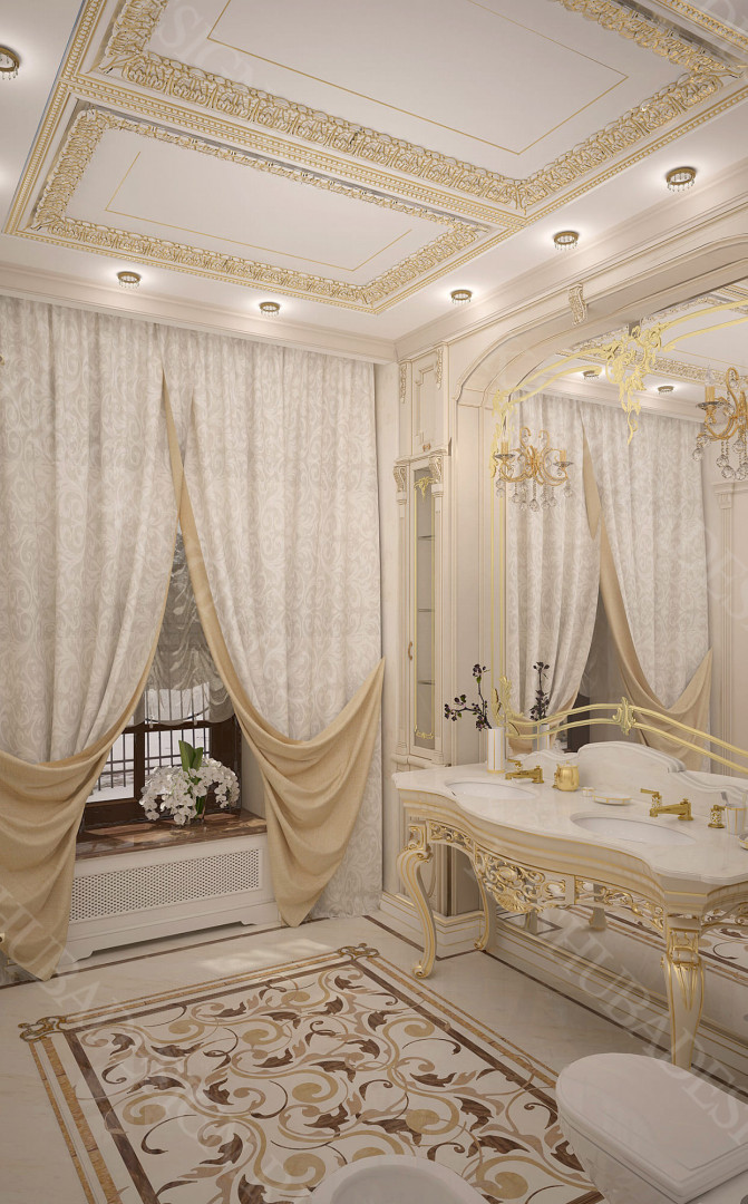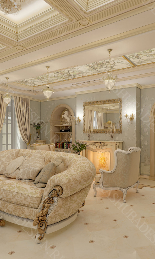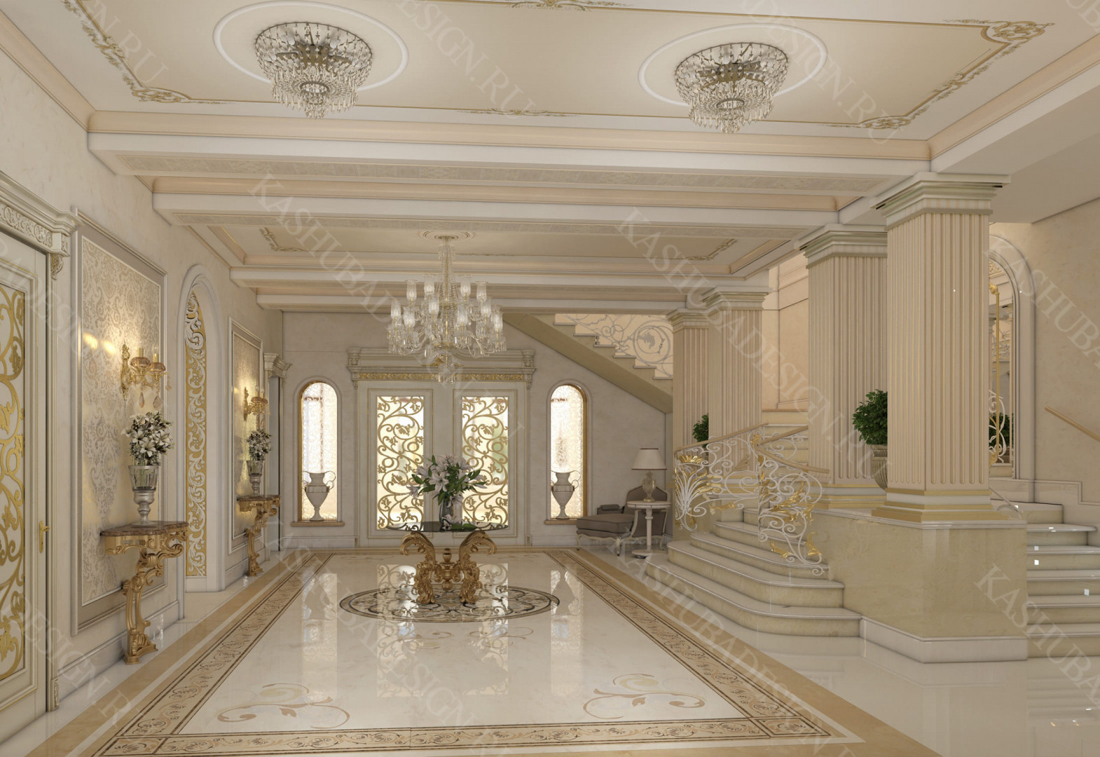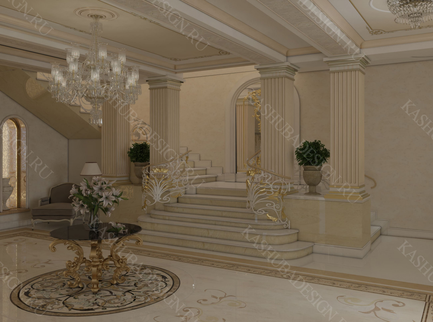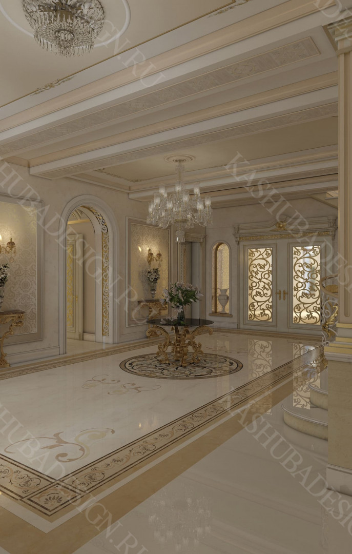 Интерьер первого этажа дома общей площадью 2400 м2. Интерьер выполнен в неоклассическом стиле с различными стилистическими приёмами. Вся площадь 1 этаже выполнена в натуральном камне, в полах предусмотрен подогрев с отступом в местах расположении мебели и столярных изделий. Планировка состоит из большого холла, из которого можно попасть в остальные части первого этажа - гардеробную, гостиную, столовую, кухню, кинотеатр, зимний сад и два санузла. По центру входной группы, на полу расположена большая круглая розетка в классическом стиле из нескольких сортов мрамора. По периметру помещения проходит бордюр, рисунок в котором состоит из элементов розетки. Лестница, ведущая на 2 этаж, тоже отделана мрамором. Стены отделаны декоративной штукатуркой, около арочного проема, ведущего в гостиную, расположены два лепных панно, внутри панно наклеены текстильные обои. Балки на потолке обрамлены лепниной, по периметру потолка проходит тонкая роспись.