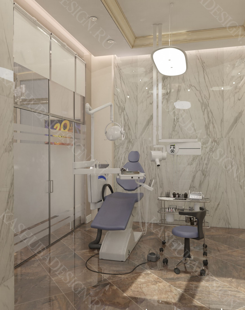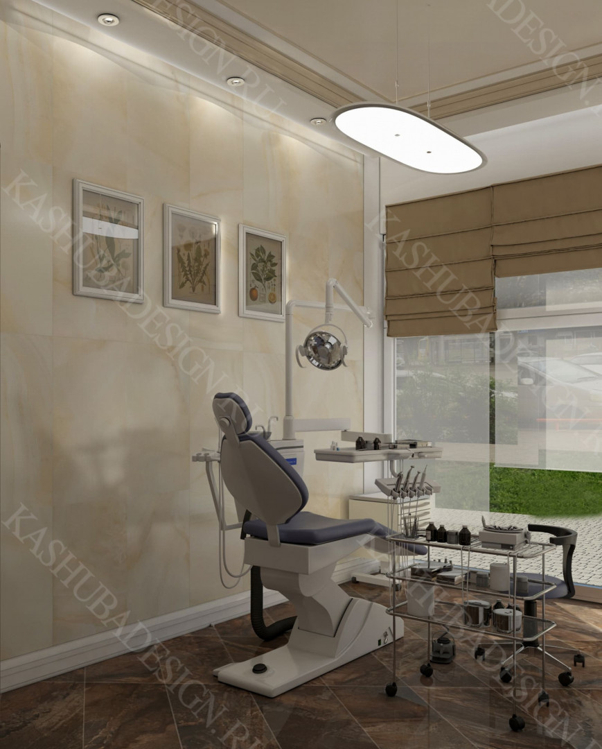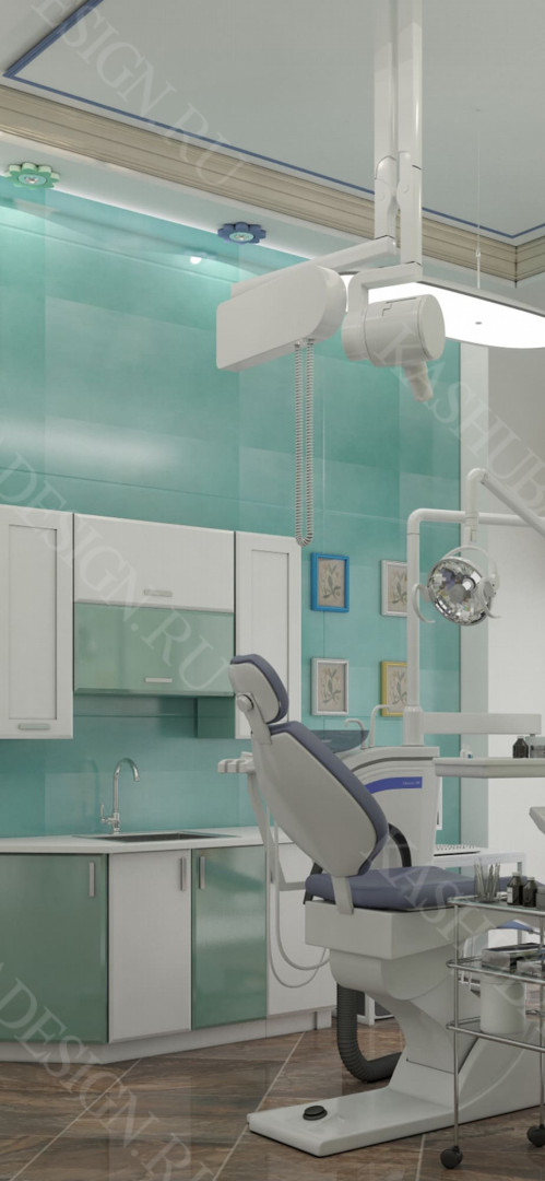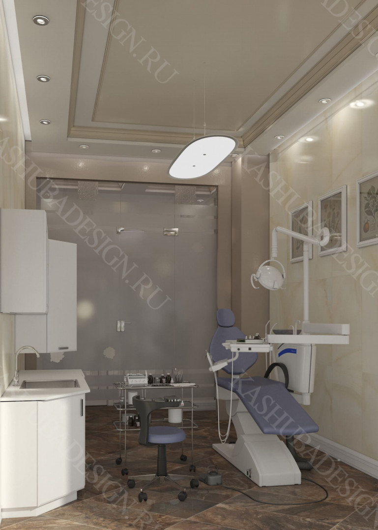 Проект клиники, расположенной в городе Краснодар, общей площадью 150 м2 выполнен в стиле ар-деко. Проект выполнен с соблюдением всех норм и правил для проектирования медицинских учреждений, используемые отделочные материалы моющиеся - на полу лежит керамогранит, стены в стоматологических кабинетах отделаны плиткой, в коридорах и зонах отдыха - моющийся краской и штукатуркой. В кабинете директора клиники стены отделаны обоями.