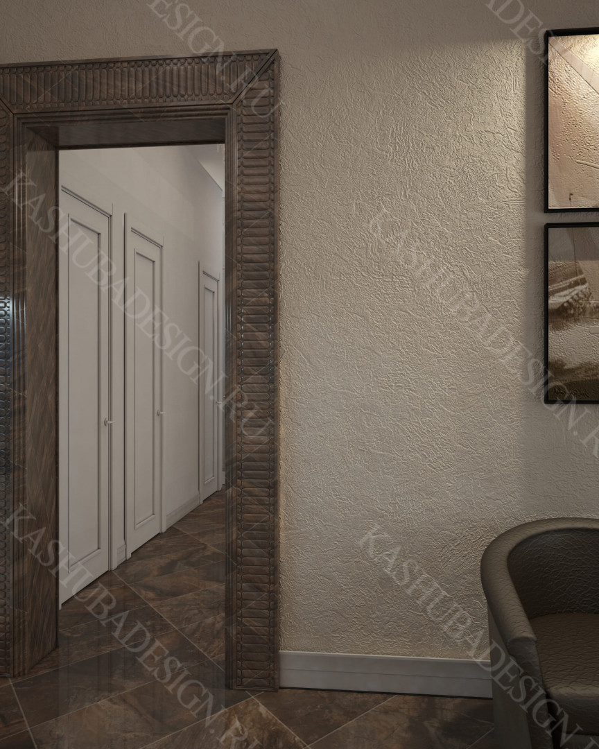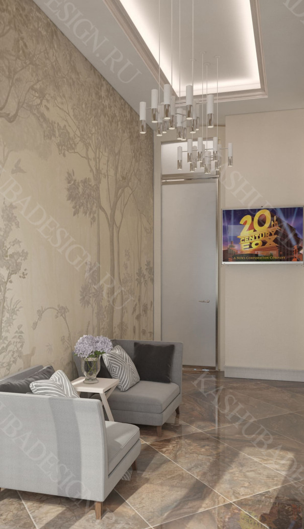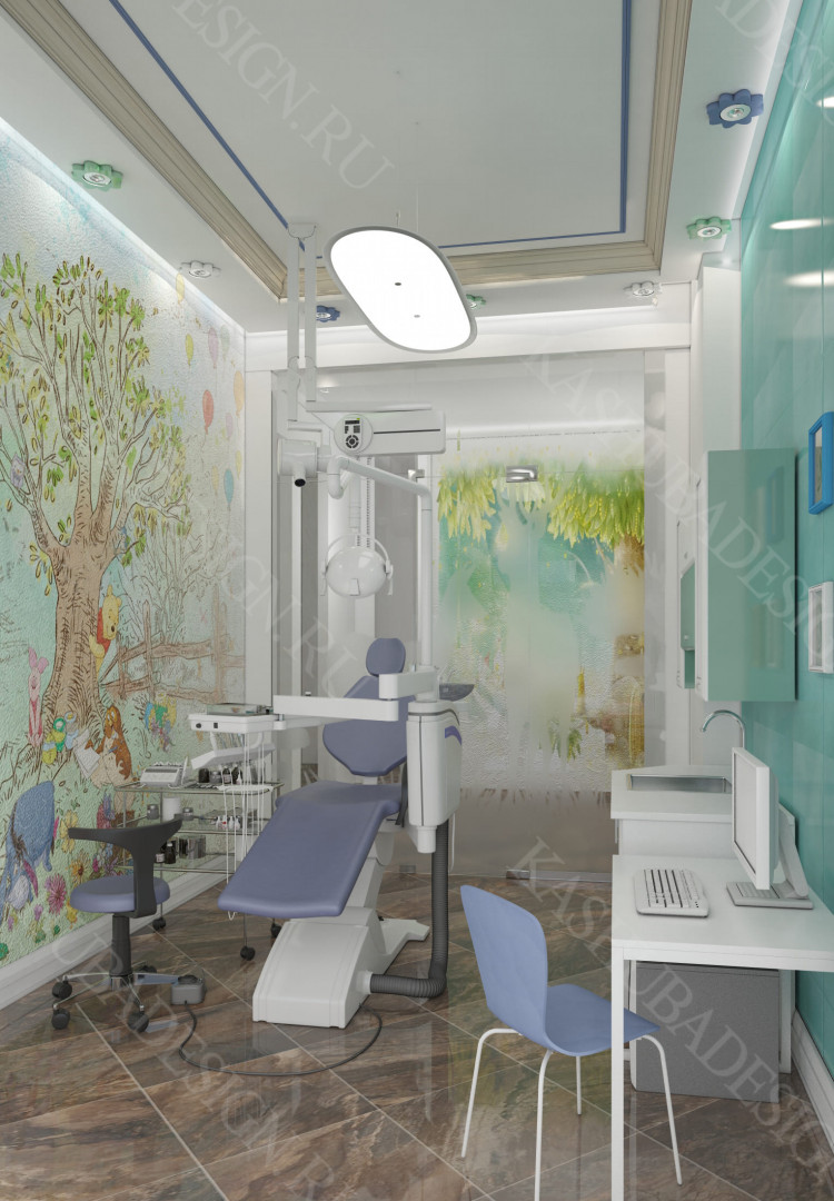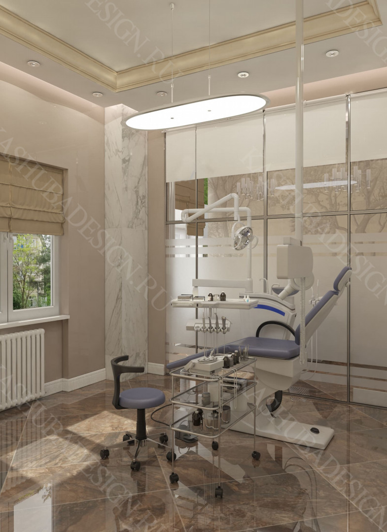 Проект клиники, расположенной в городе Краснодар, общей площадью 150 м2 выполнен в стиле ар-деко. Проект выполнен с соблюдением всех норм и правил для проектирования медицинских учреждений, используемые отделочные материалы моющиеся - на полу лежит керамогранит, стены в стоматологических кабинетах отделаны плиткой, в коридорах и зонах отдыха - моющийся краской и штукатуркой. В кабинете директора клиники стены отделаны обоями.