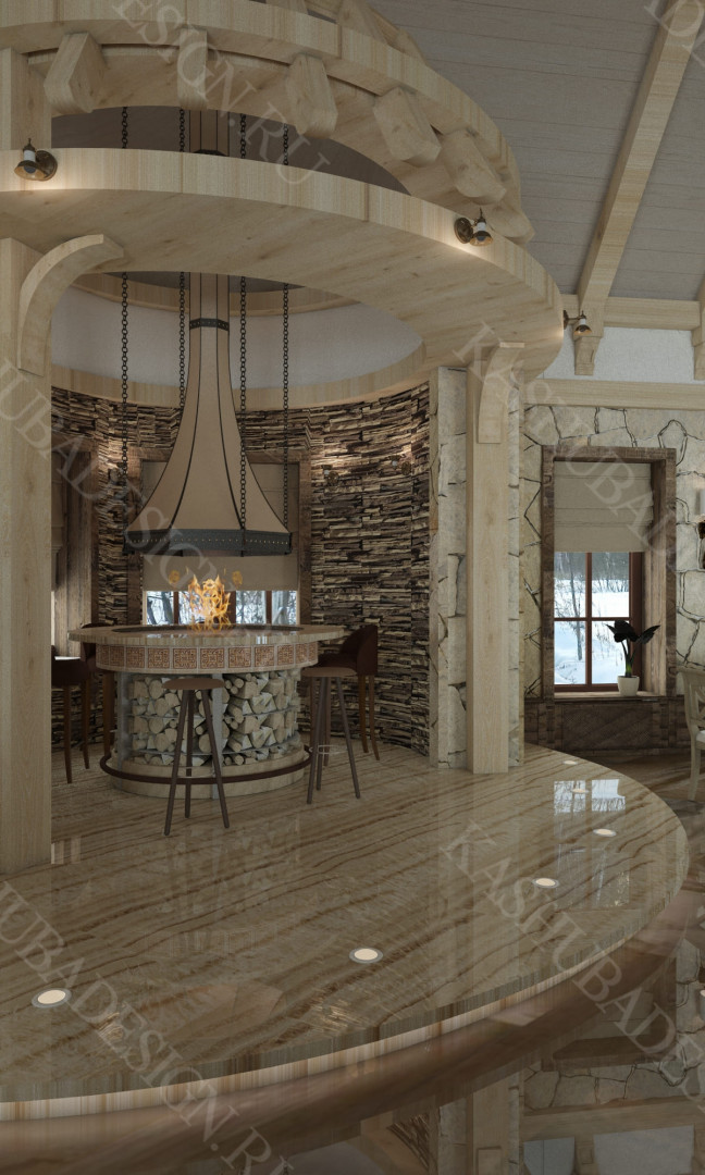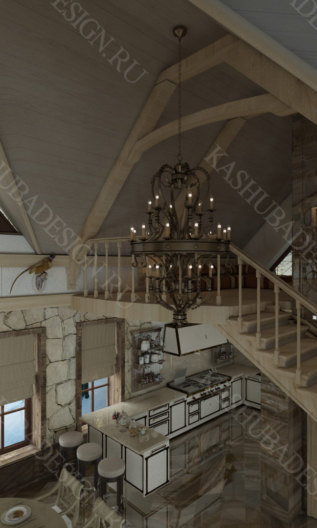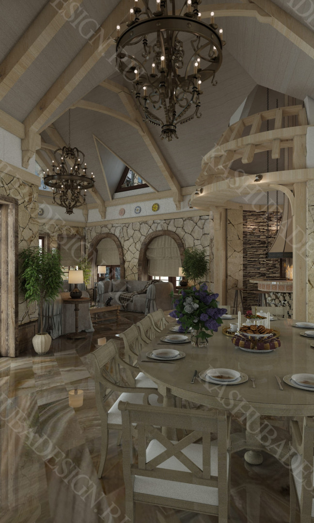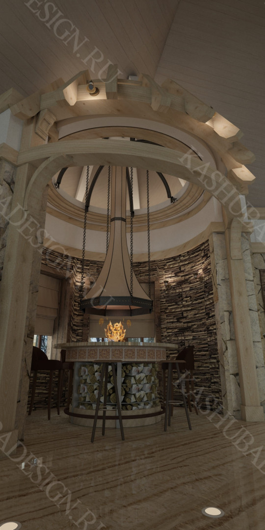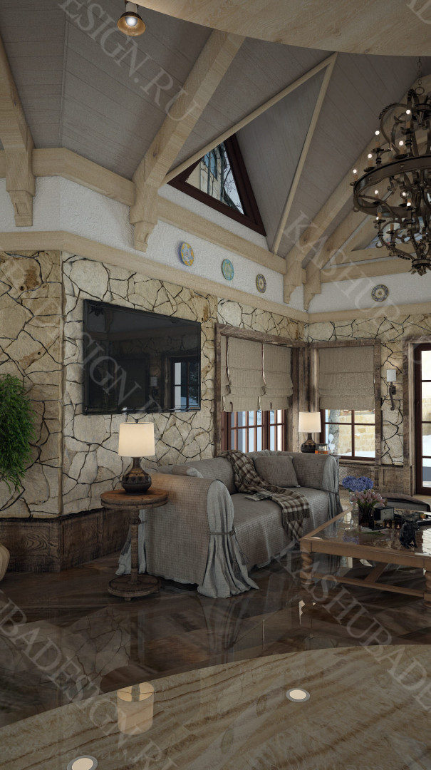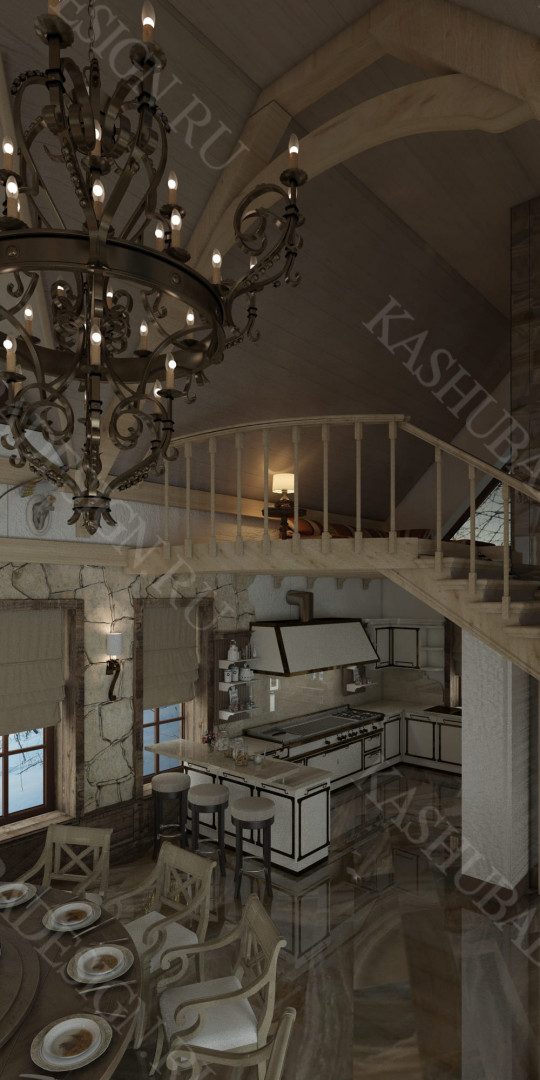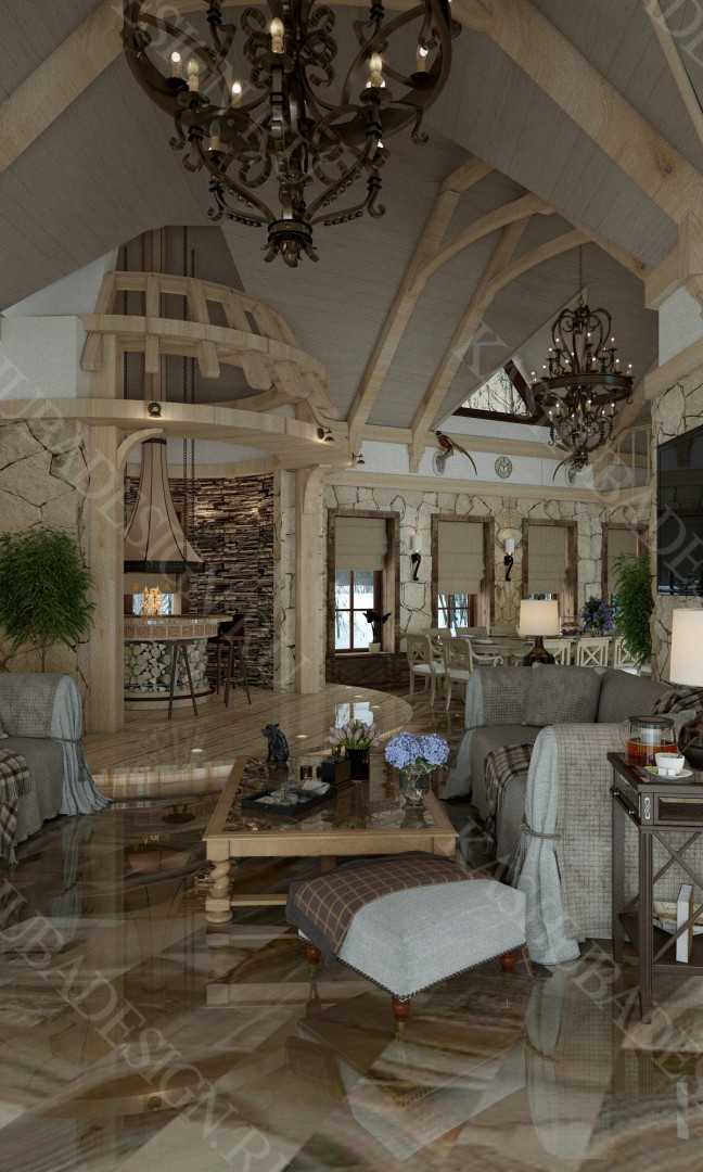 Двухэтажный флигель особняка в Подмосковье и VR 360°. Большой особняк в Подмосковье получил замечательный двухэтажный флигель, общей площадью 350 м 2, не соединенный с основным домом. На первом этаже строение имеет зоны - отдыха и барбекю. Здесь так же расположен: гостевой санузел, гараж и комната охраны. На втором этаже - размещена гостевая спальня, гостевой санузел и помещения для прислуги. Примененные отделочные материалы - потолок обшит вагонкой, используются декоративные деревянные балки, на стенах - грубый камень двух видов и декоративная штукатурка, пол - сочетание двух видов и цветов керамогранита (светлого и темного). Низ стен обшит деревянными панелями в столярном исполнении. Откосы и обрамления окон отделаны деревом. Кованные люстры и бра украшают помещения.