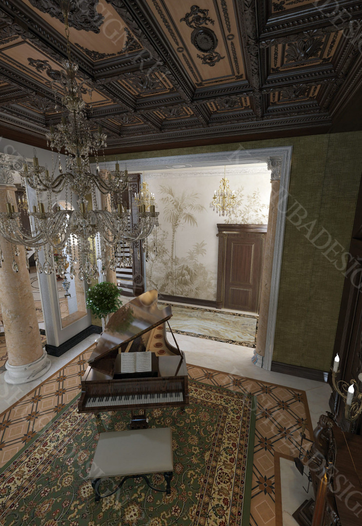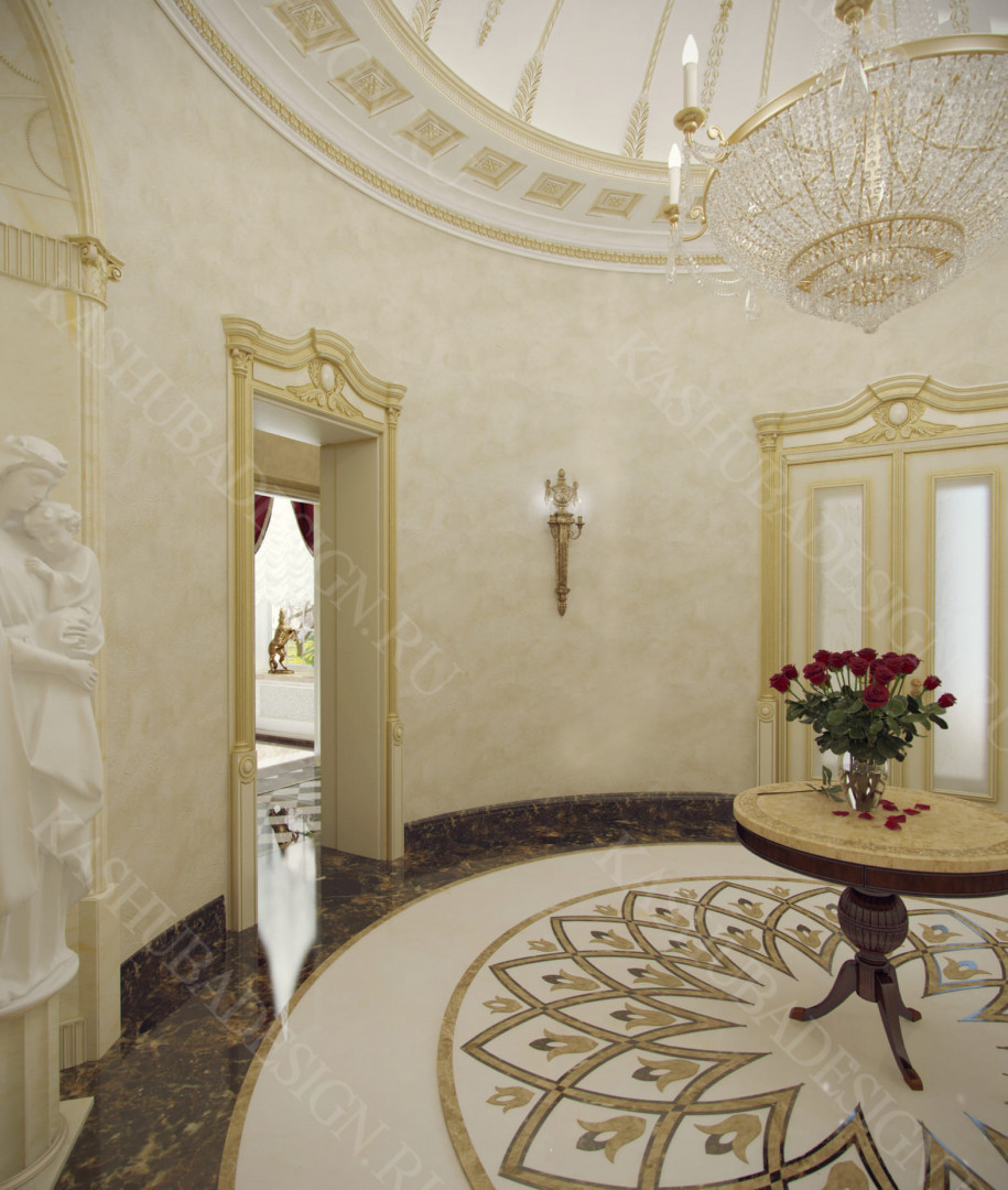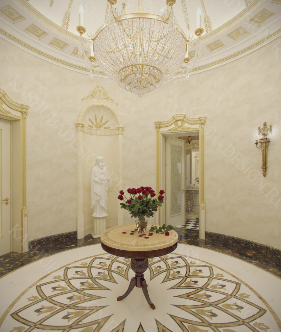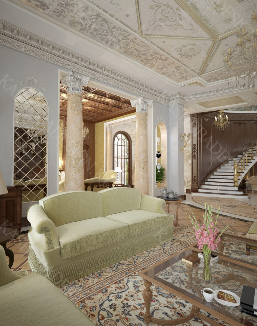 Для всех помещений усадьбы (высота потолков не менее 3-5 метров) характерна красота композиции, дозированное внедрение деталей и упорядоченность декоративного оформления, которые становятся выразительными тональными нюансами, растворяются в глубине пластичного объема, конструктивных решений. За их статичностью в пространстве, скрывается экспрессия прочтения. Очевидно, доминирует стиль - классика, что позволяет отнести роскошные интерьеры особняка к эклектичному дворцовому варианту. Здесь все на месте, все удалось и актуально, удивительно гармонично сочетание черт изящного аристократизма со сдержанным шиком всех входящих в интерьер элементов, предметов, мебели, посуды, осветительных приборов и пр. Если лучшие интерьеры и красивые интерьеры, то в них таится нечто большее, чем изысканность и роскошь.