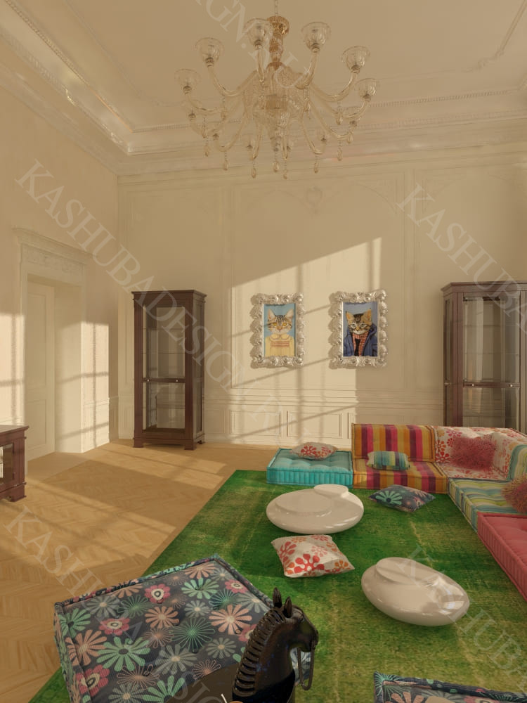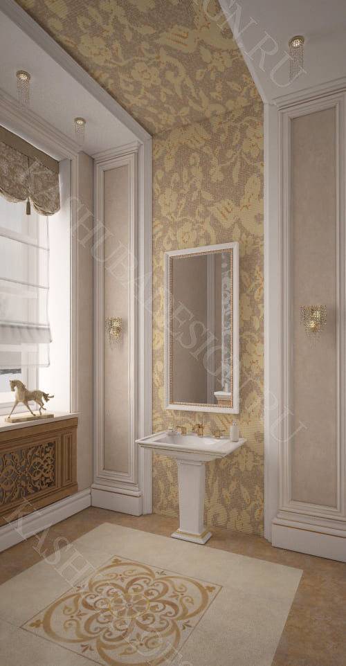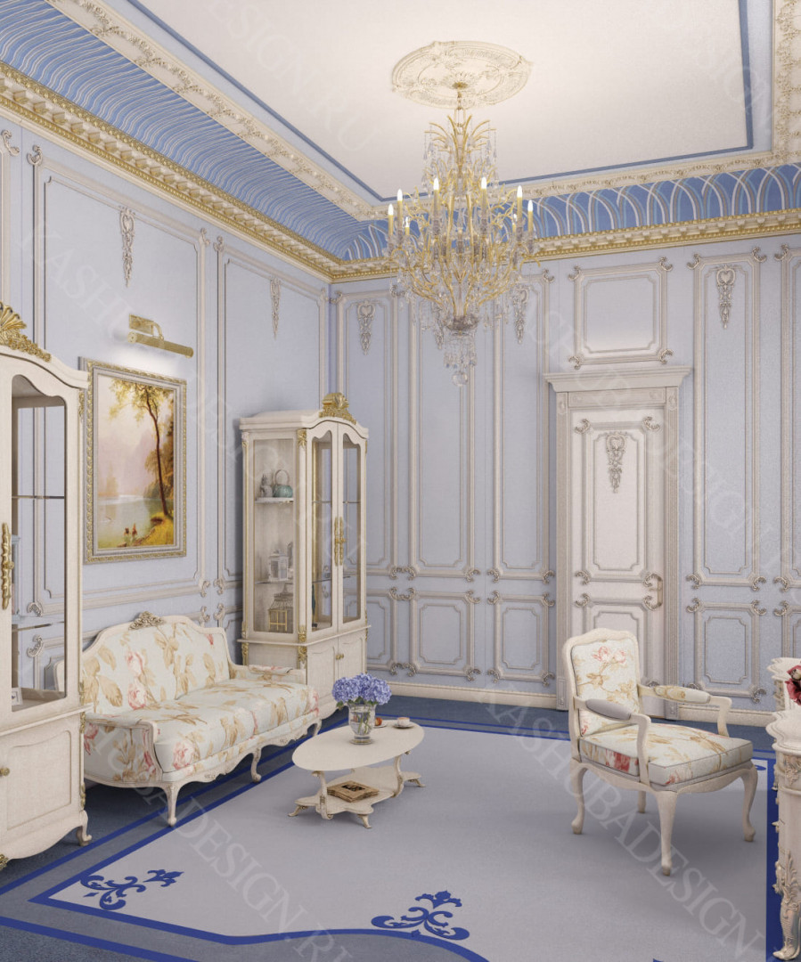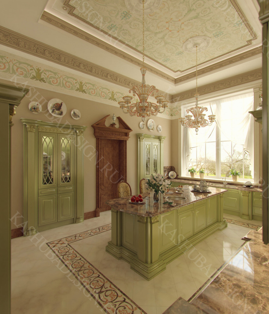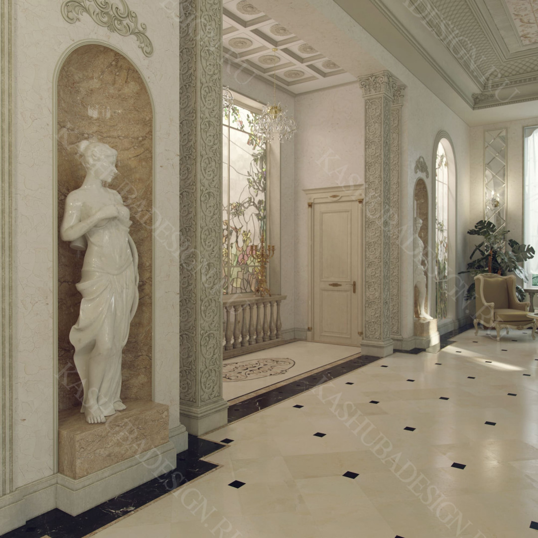 Для всех помещений усадьбы (высота потолков не менее 3-5 метров) характерна красота композиции, дозированное внедрение деталей и упорядоченность декоративного оформления, которые становятся выразительными тональными нюансами, растворяются в глубине пластичного объема, конструктивных решений. За их статичностью в пространстве, скрывается экспрессия прочтения. Очевидно, доминирует стиль - классика, что позволяет отнести роскошные интерьеры особняка к эклектичному дворцовому варианту. Здесь все на месте, все удалось и актуально, удивительно гармонично сочетание черт изящного аристократизма со сдержанным шиком всех входящих в интерьер элементов, предметов, мебели, посуды, осветительных приборов и пр. Если лучшие интерьеры и красивые интерьеры, то в них таится нечто большее, чем изысканность и роскошь.