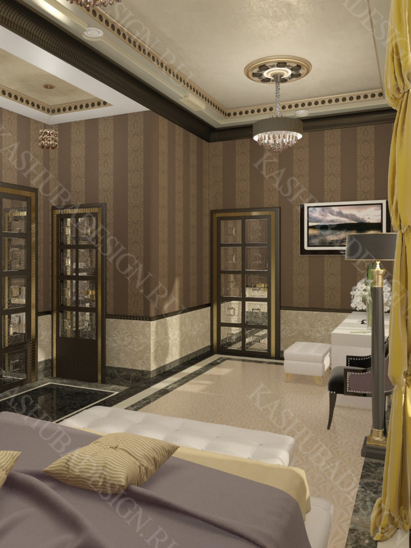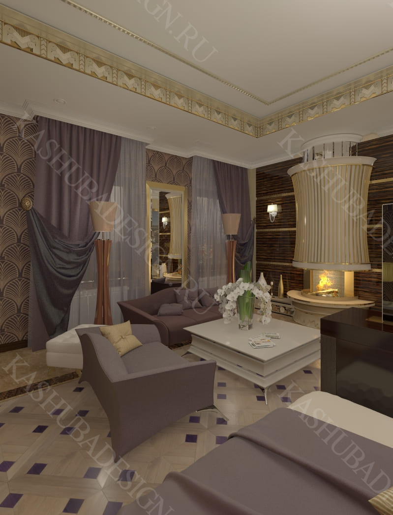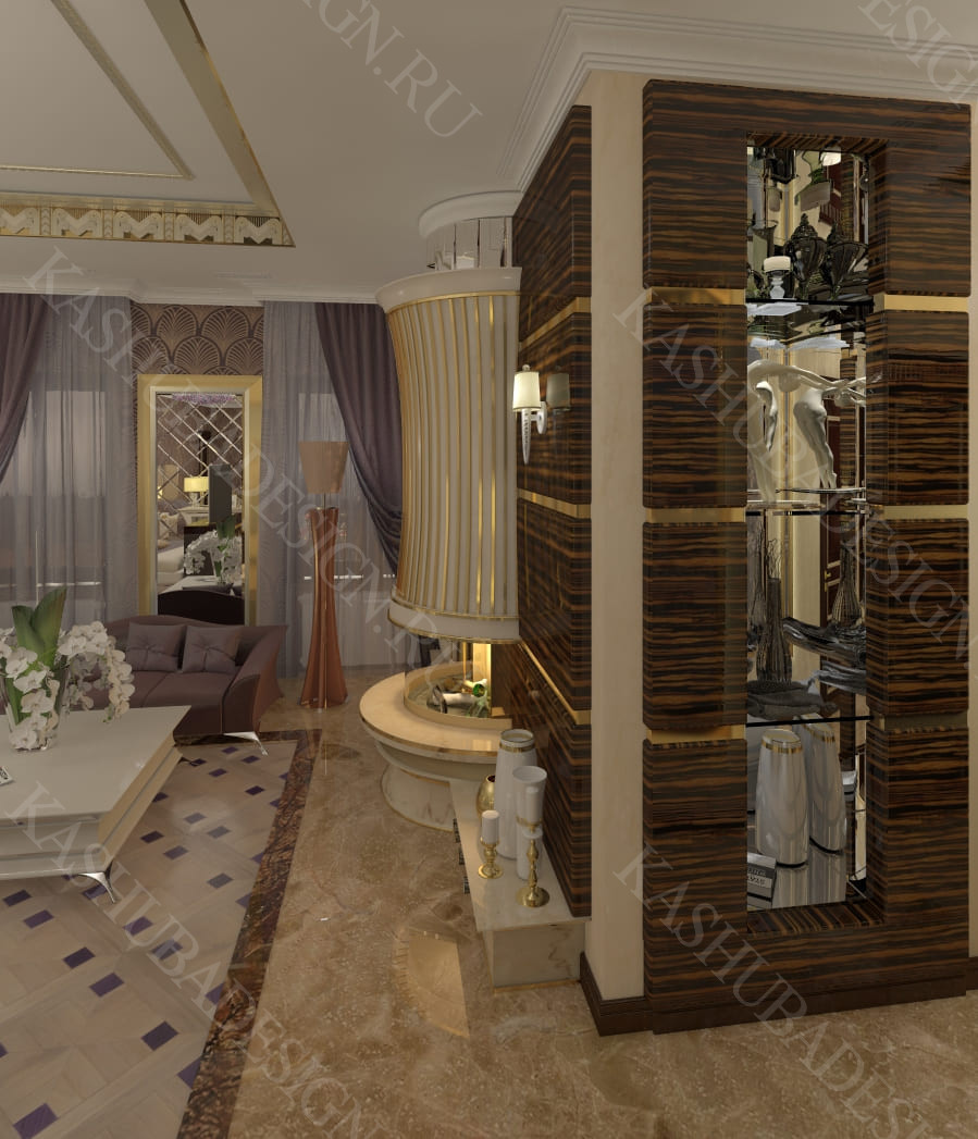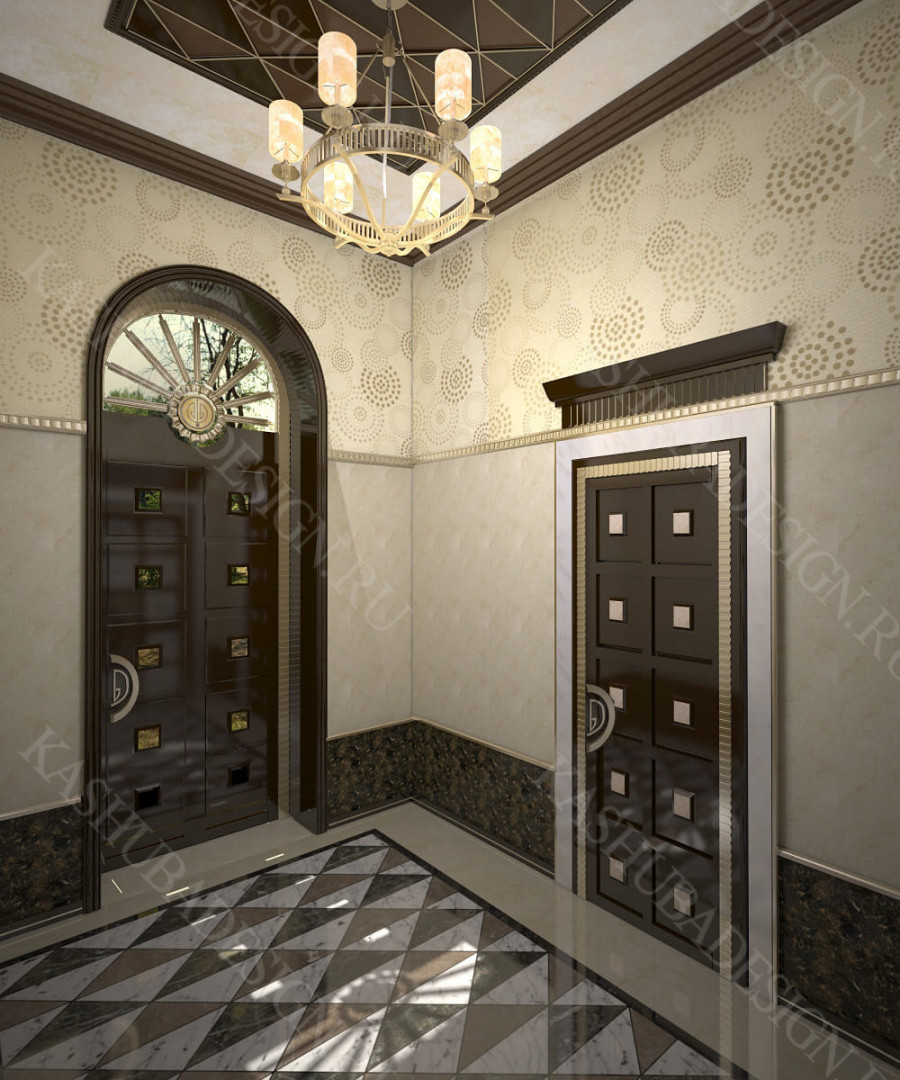 Материальная действительность и порядок форм, множество фигур и элементов, их взаимосвязи и совместное функционирование вызывают очевидные ощущения комфортной действенности. На данном объекте отчетливо видно, что дизайн интерьера - междисциплинарное поле поведения сложных систем. Здесь проявилась синергия, общая энергия, совместная деятельность с креативными заказчиками, сознательно нацеленные на дело, направленные на результат. Объект, дизайн интерьера арт деко, экспонировался Международным бюро интерьера и архитектуры «KASHUBA DESIGN» на международных выставках, вызвал заинтересованность, возможна публикация в профильном журнале.