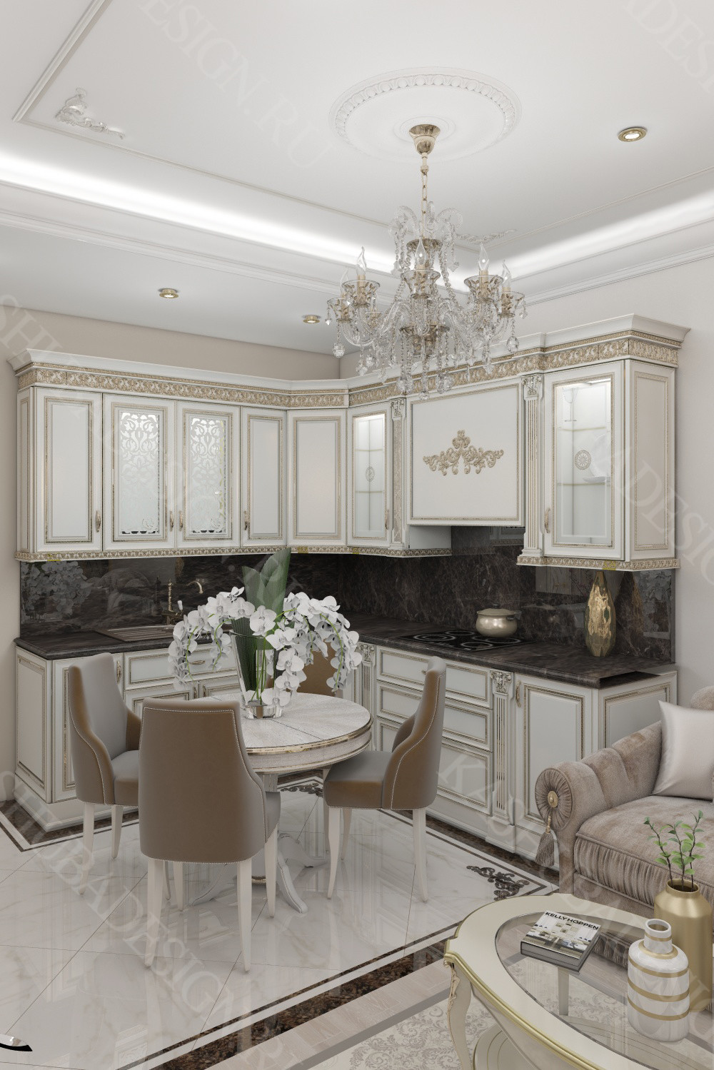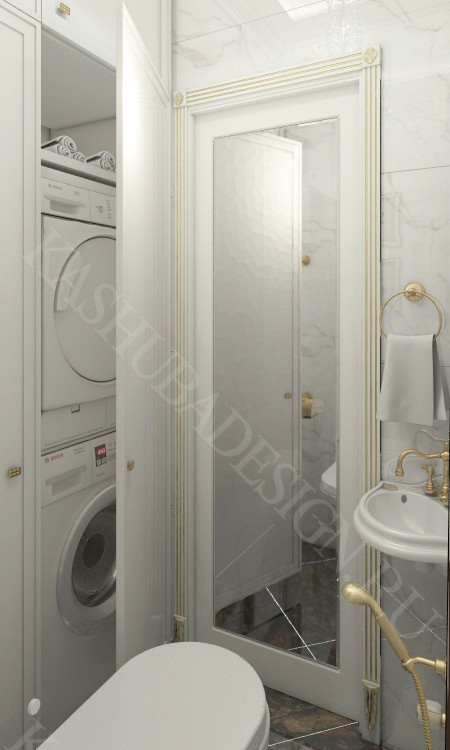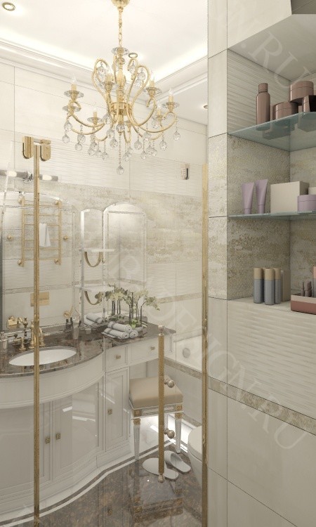 Интерьер данной квартиры площадью 50 м 2 выполнен в неоклассическом стиле. В квартире предусмотрены различные варианты освещения. В отделке используются только натуральные материалы, гипсовый декор по индивидуальному заказу.