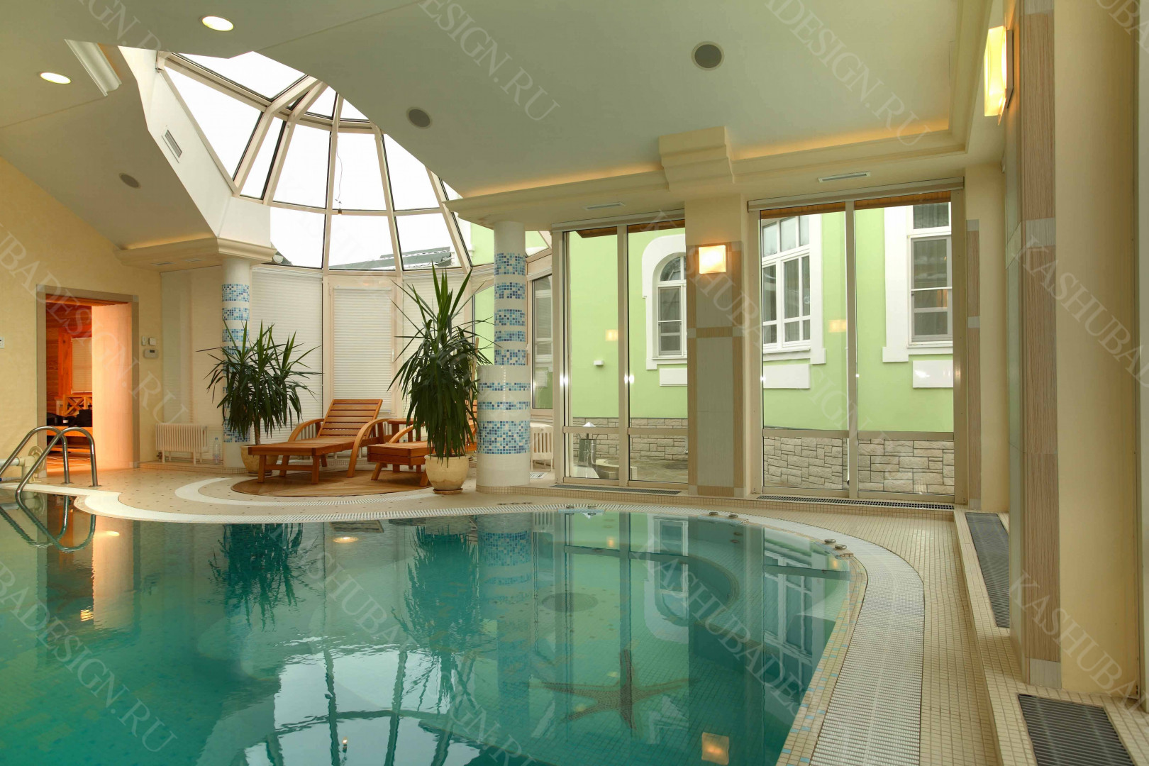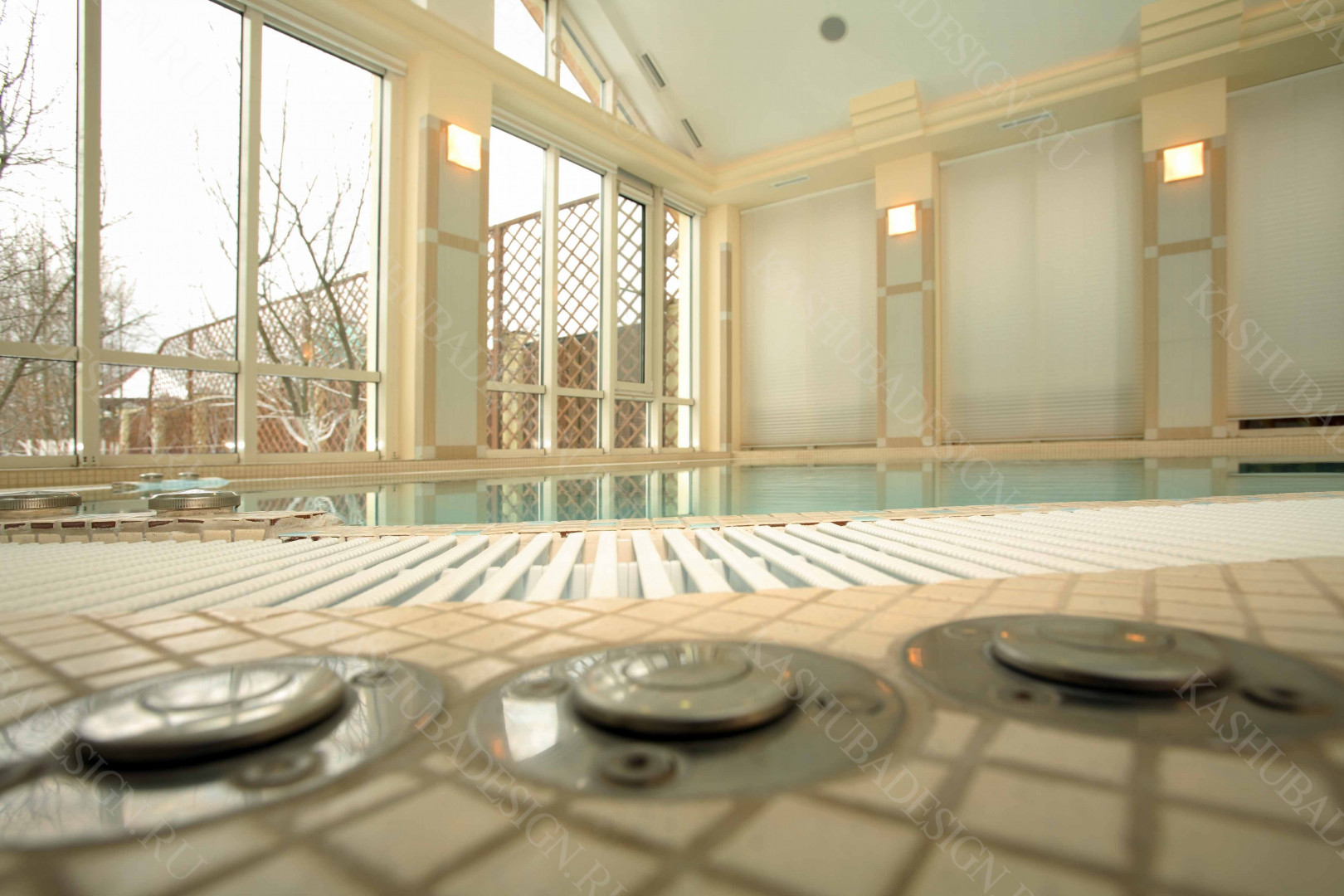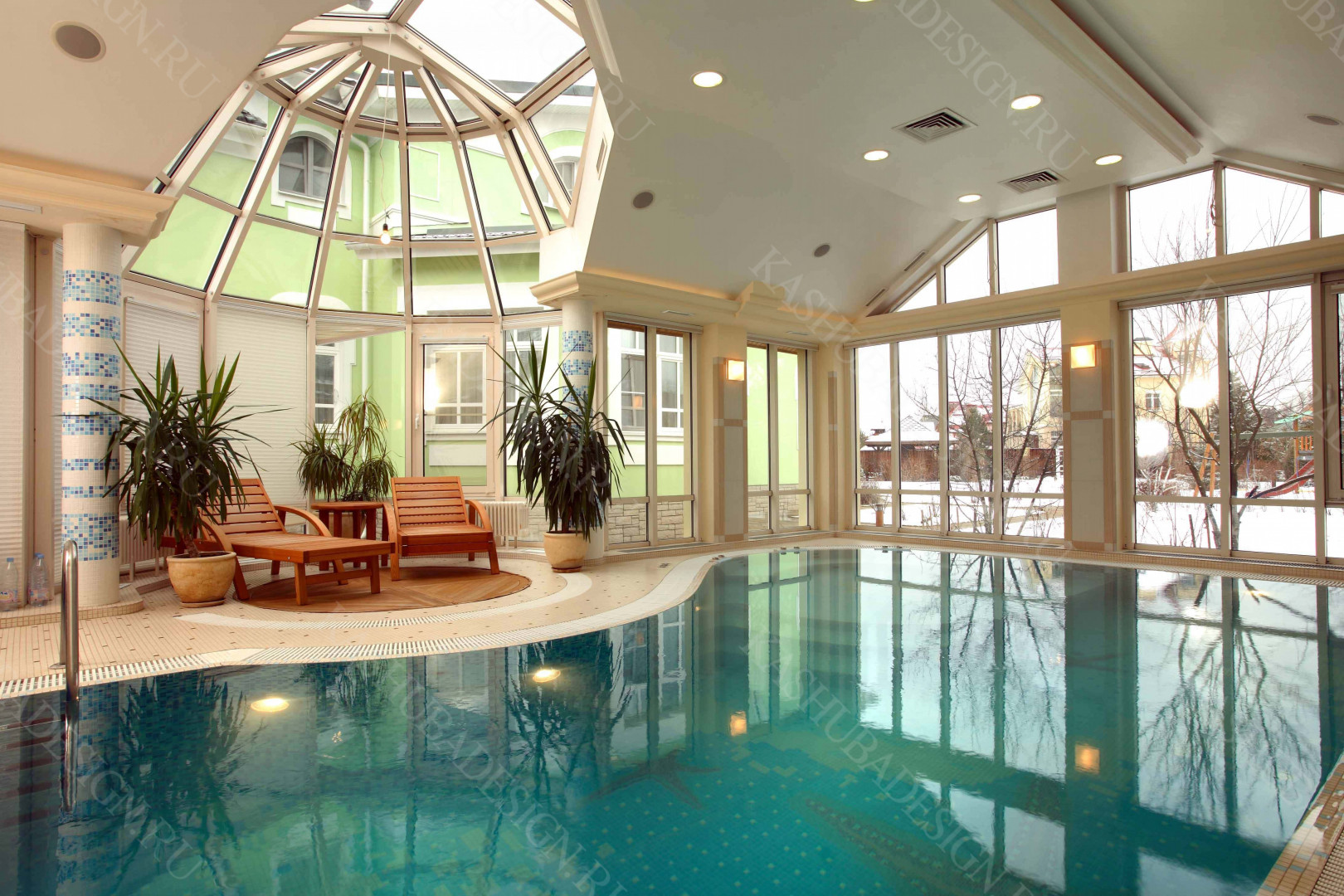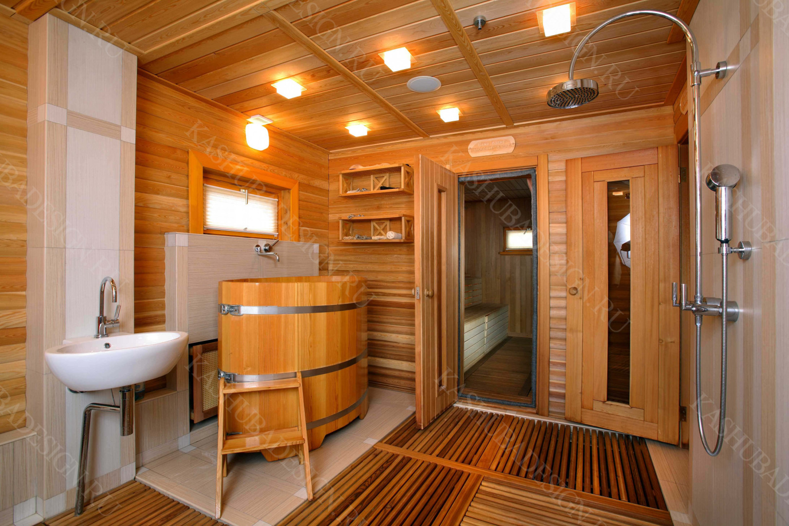 Пристроенная к загородному дому с бассейном, красивое решение Wellness – пространства. Жаль, что все это изысканное стилевое сокровище, выполненное по проекту Международного бюро интерьера и архитектуры «Kashuba Design», не лично наше. Но мы рады за умных владельцев, пригласивших квалифицированных, премиальных дизайнеров, ибо суть не в социальной ориентированности хозяев, поскольку это не роскошь, а обычный подмосковный дом бизнес-класса. Главное - авторская стилевая изысканность, вызывающая у каждого человека желание ощутить себя в этой бане с бассейном.