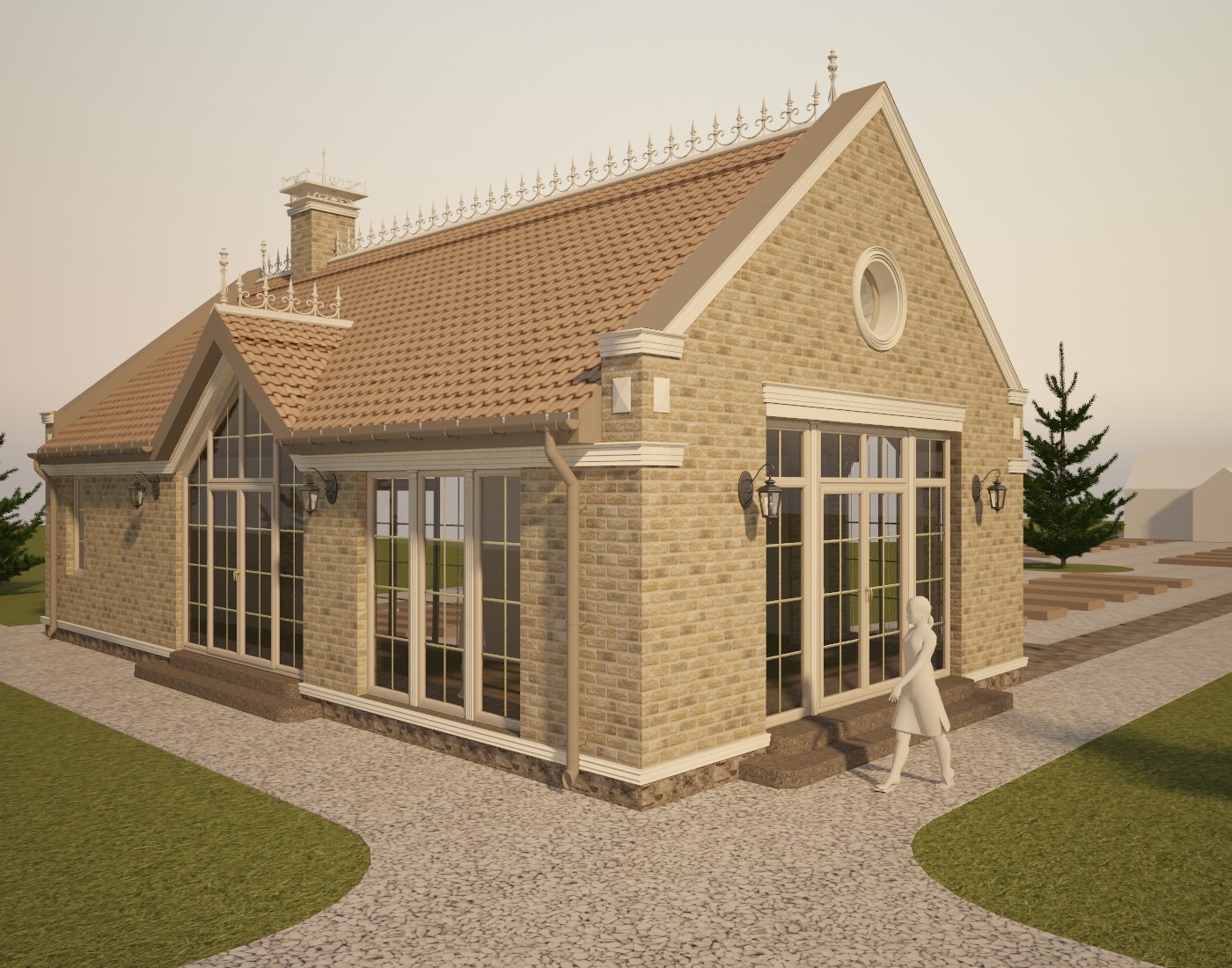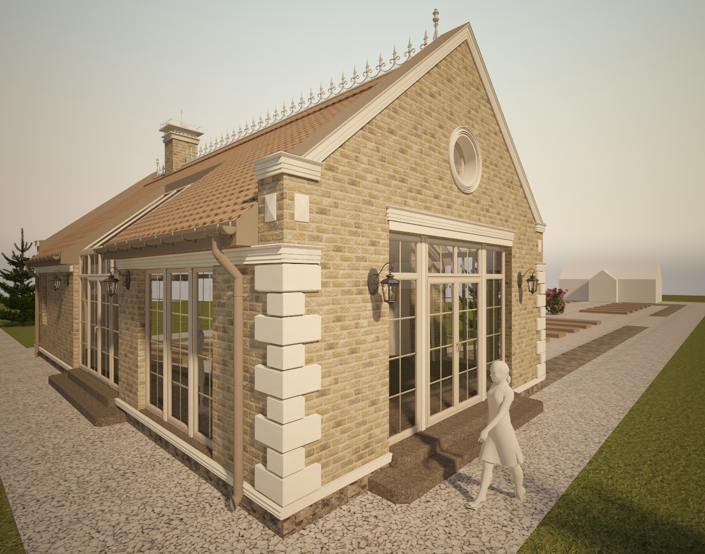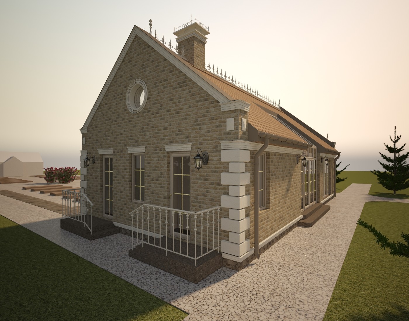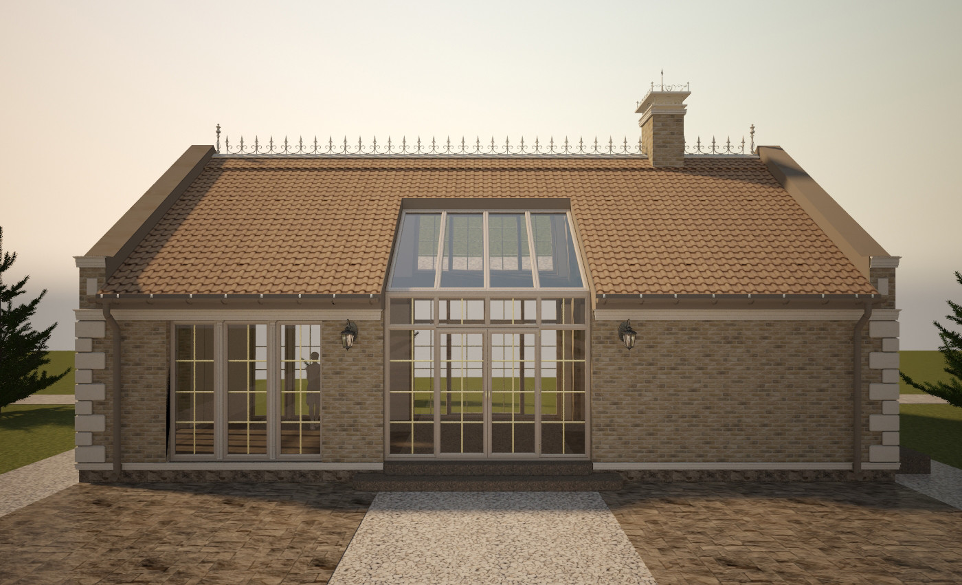 Материал кровли - рядная (цементная или керамическая) черепица типа "Kriastak", изотборных натуральных материалов. Освещение по фасаду - настенные бра и 3 группы дополнительной фасадной подсветки. Проектом предусмотрен кирпичный печной комплекс. Представлено несколько вариантов отделки.