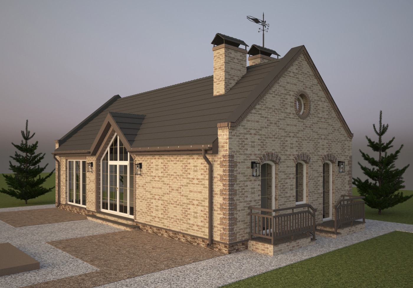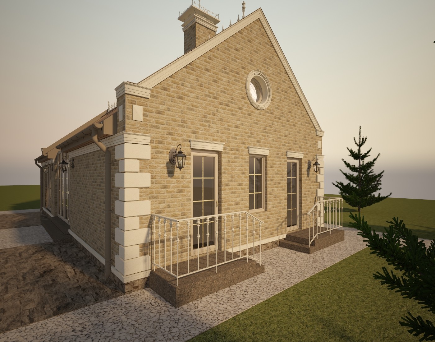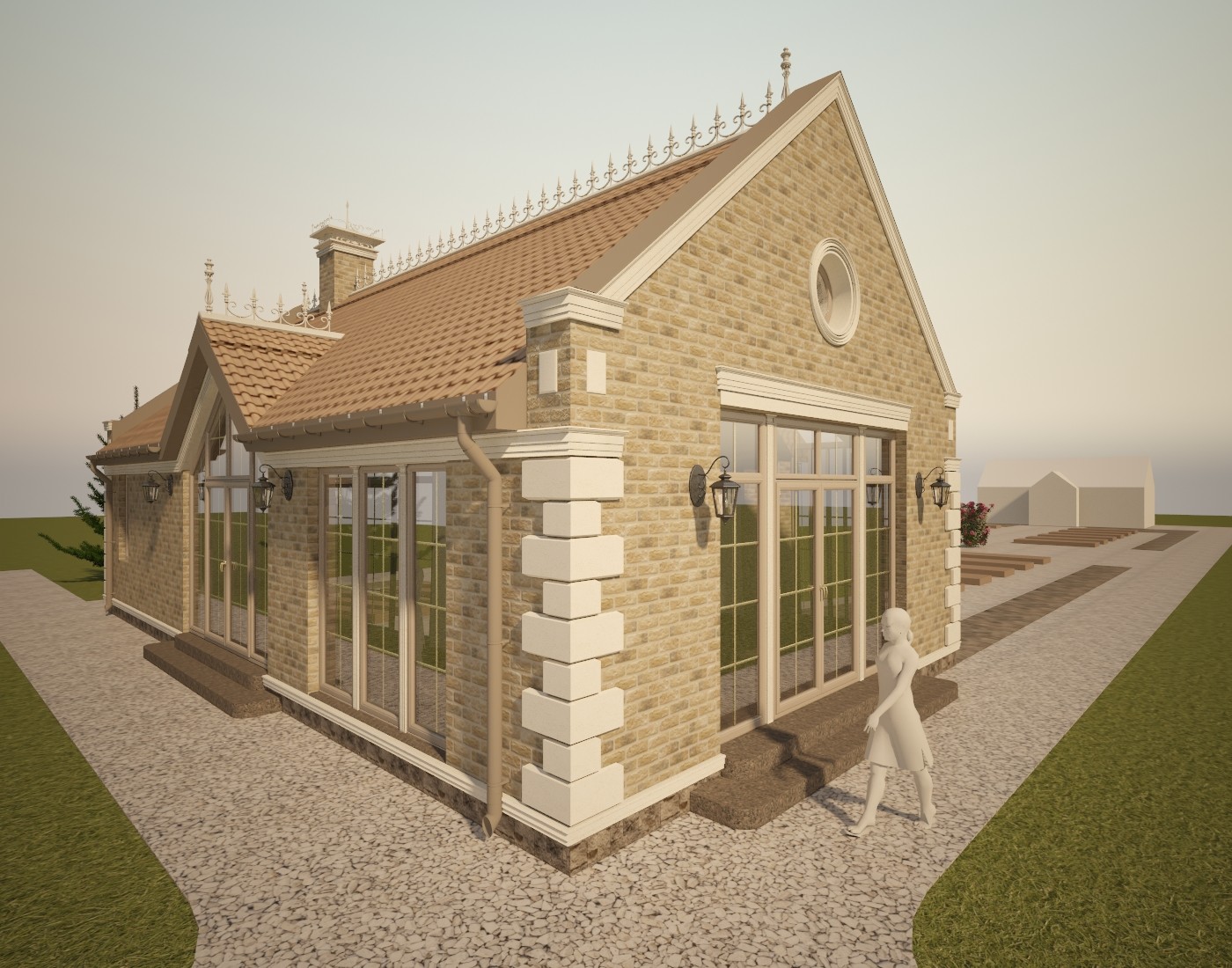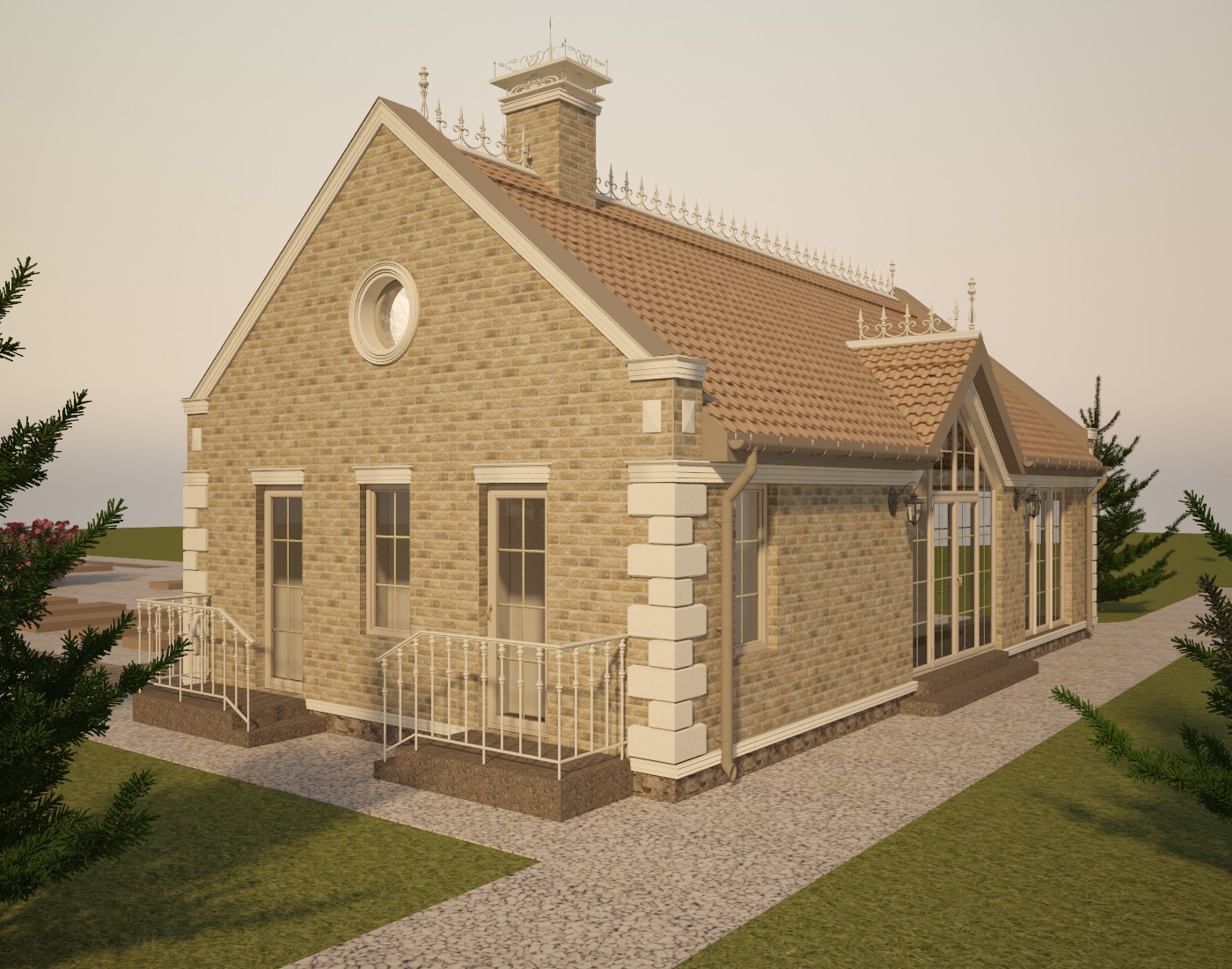 Материал кровли - рядная (цементная или керамическая) черепица типа "Kriastak", изотборных натуральных материалов. Освещение по фасаду - настенные бра и 3 группы дополнительной фасадной подсветки. Проектом предусмотрен кирпичный печной комплекс. Представлено несколько вариантов отделки.