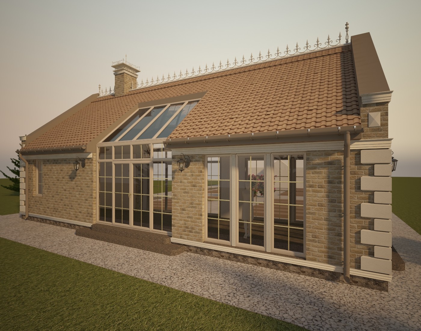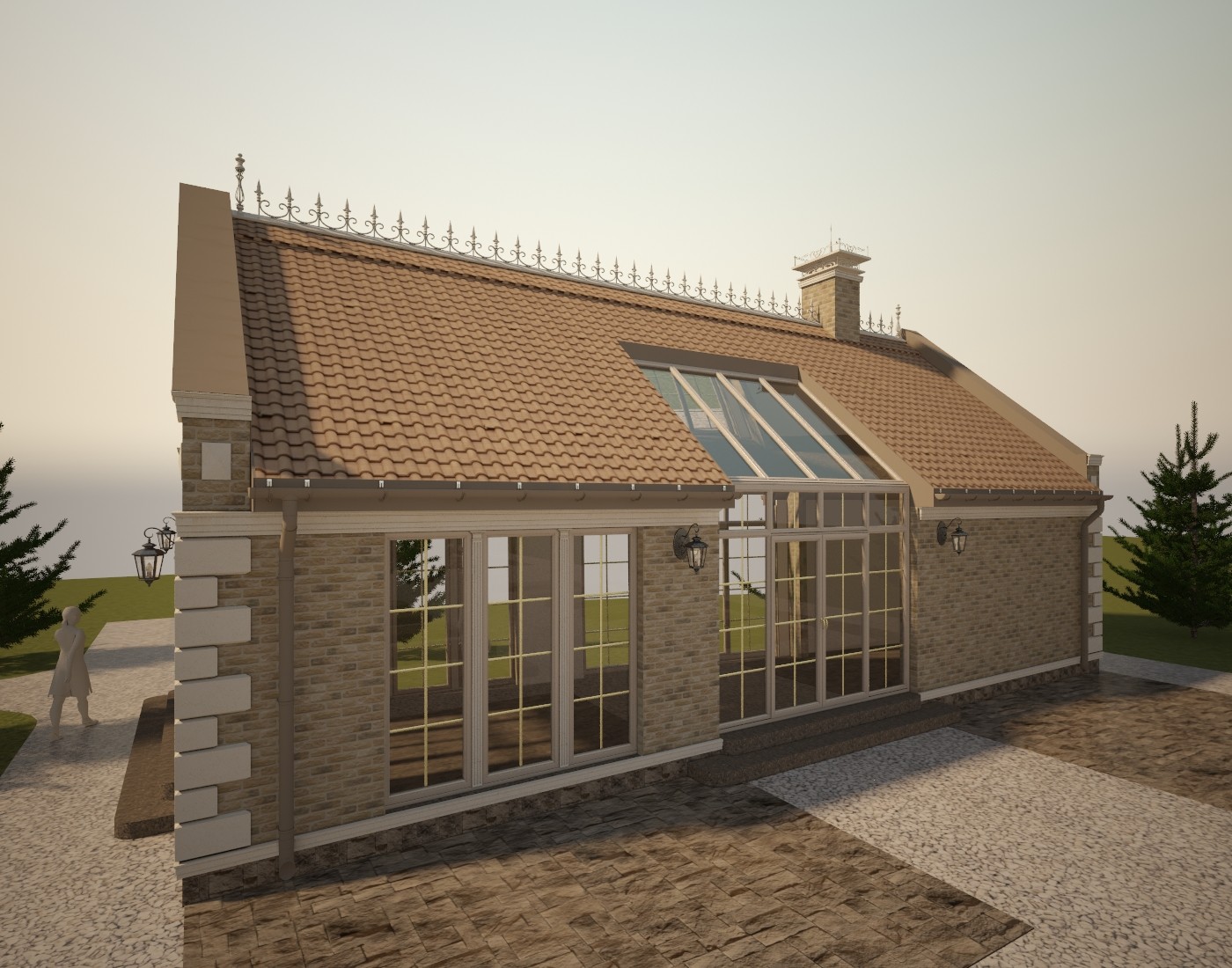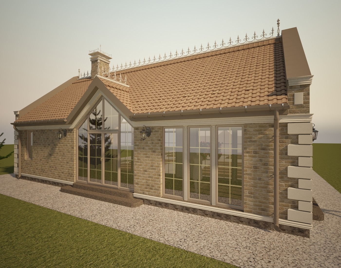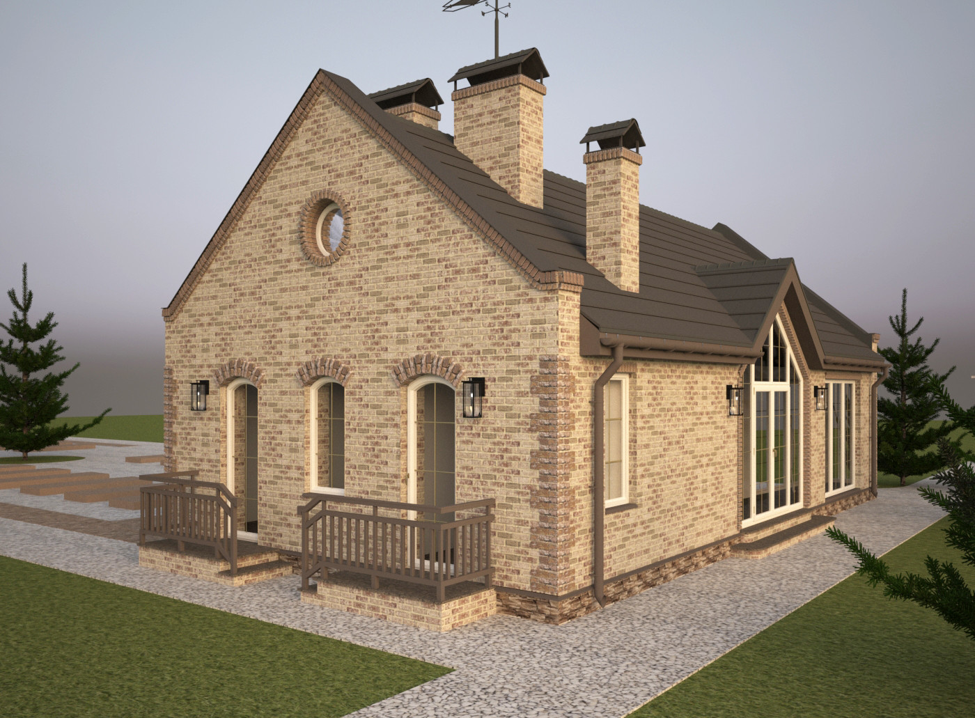 Материал кровли - рядная (цементная или керамическая) черепица типа "Kriastak", изотборных натуральных материалов. Освещение по фасаду - настенные бра и 3 группы дополнительной фасадной подсветки. Проектом предусмотрен кирпичный печной комплекс. Представлено несколько вариантов отделки.