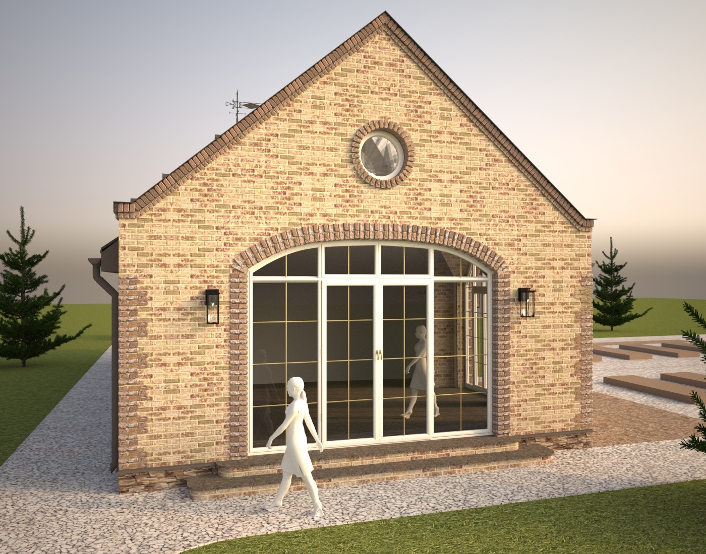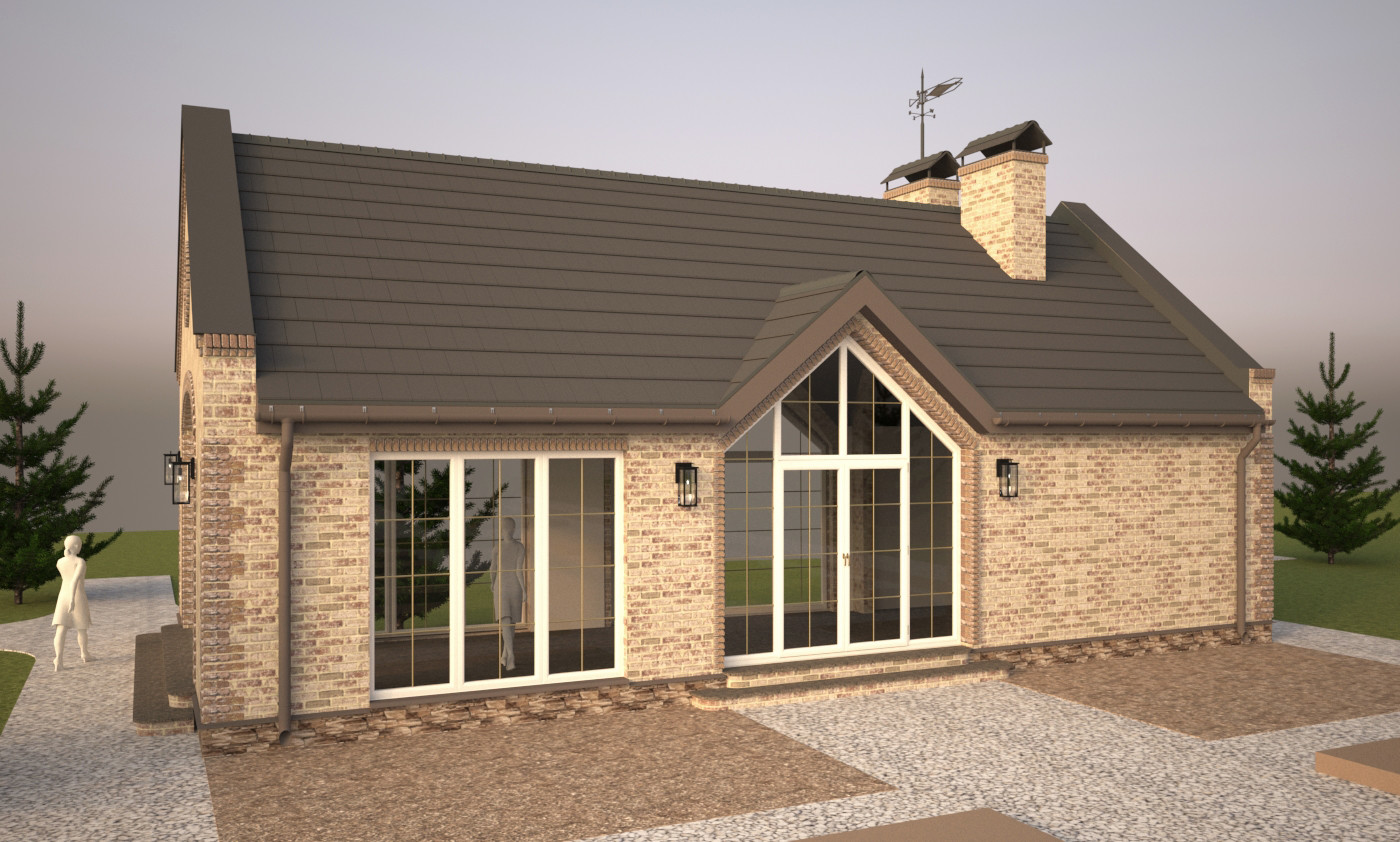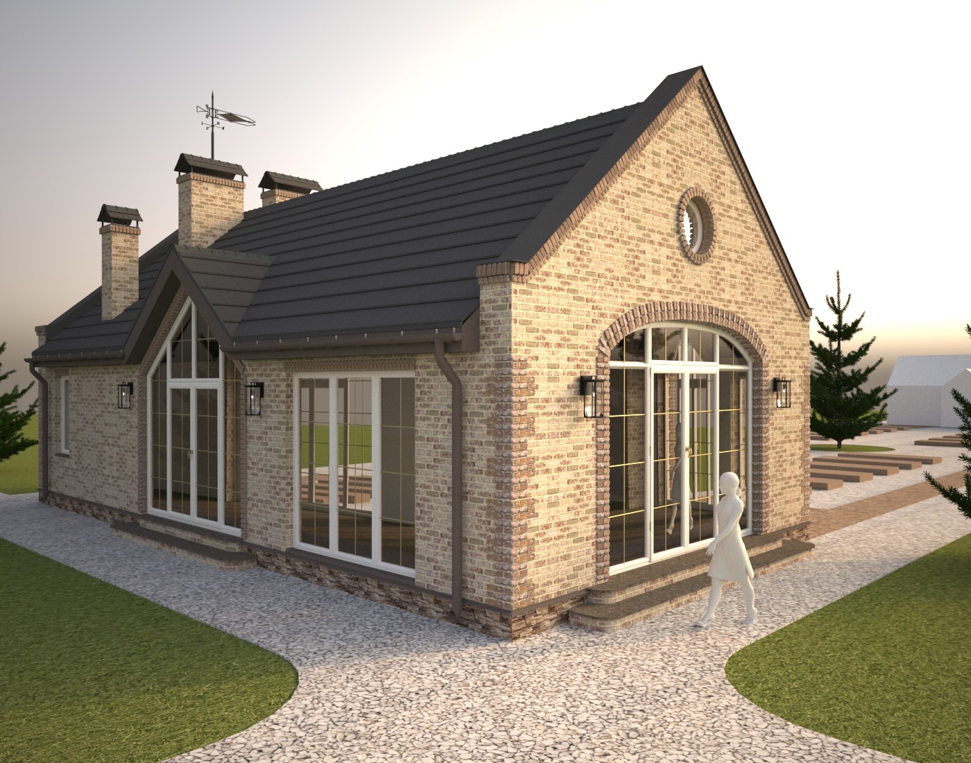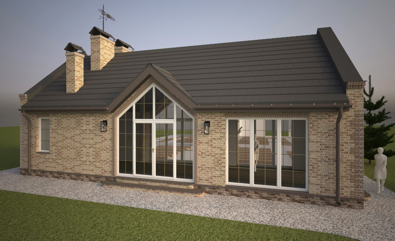 Окна большие, в кухне-гостиной - окна в пол. В торце барбекю большое раздвижное раскладывающееся окно с арочной фрамугой. Главный вход с треугольными окнами повторяет форму теплицы, которая расположена напротив.