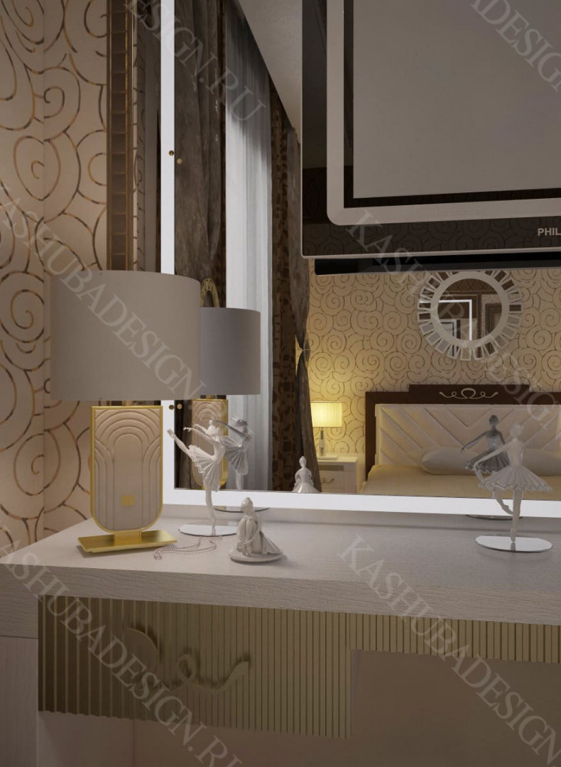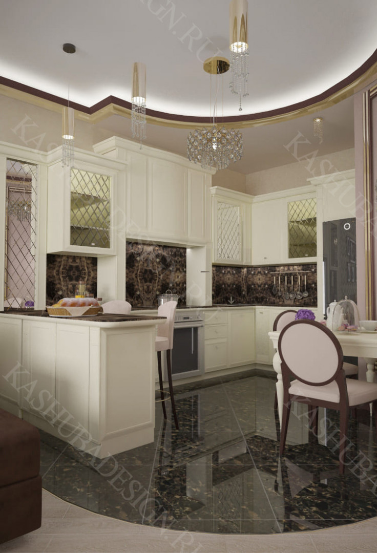 Международное бюро интерьера и архитектуры «KASHUBA DESIGN» постоянно стремится к созданию новых ценностей в искусстве дизайна интерьера, объединяя инновации из различных направлений и используя собственные технологии для улучшения жизнедеятельности людей. Квартира в стиле - ар деко, состоит из кухни, объединенной с гостиной, детской комнаты, хозяйской спальни, имеет два санузла и гардеробную. Объединение кухни и обеденной зоны с интегрированной коммуникацией, сохраняет семейные традиции и ценности.