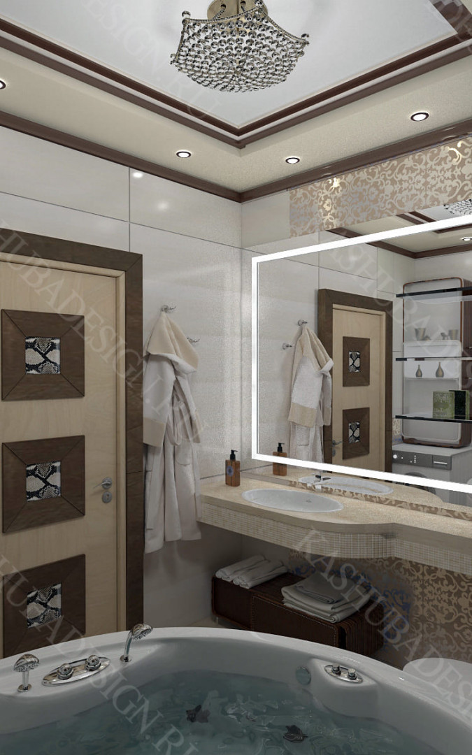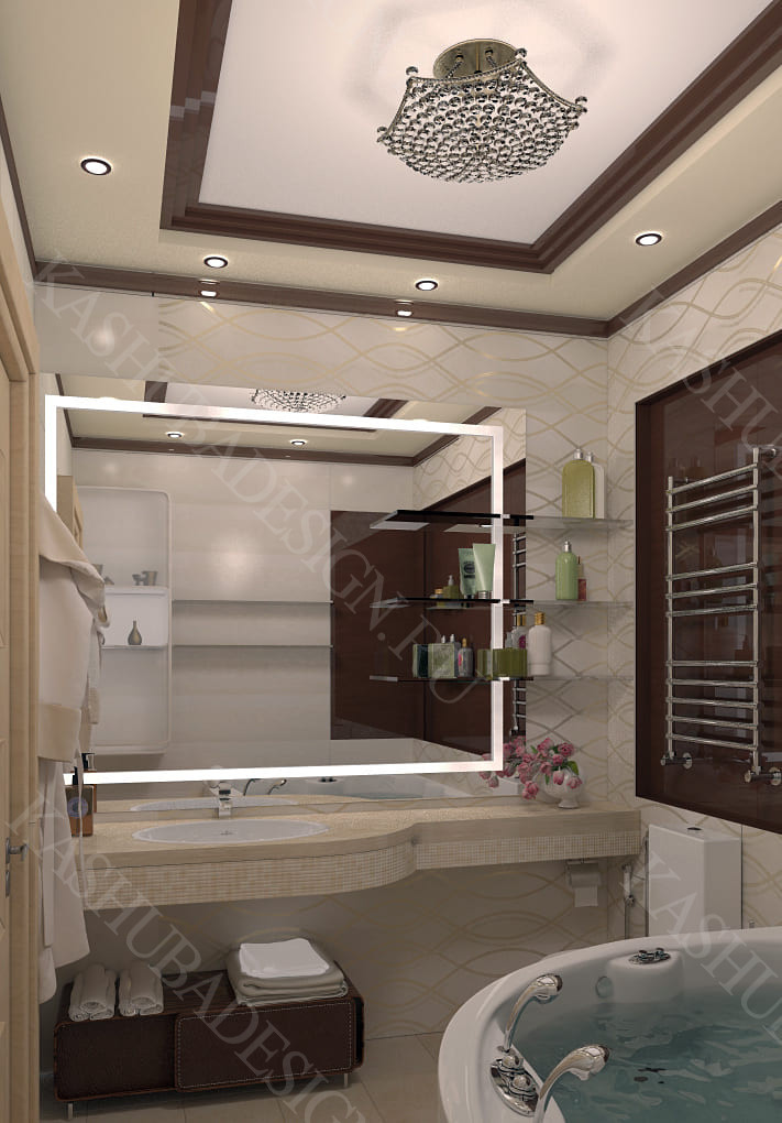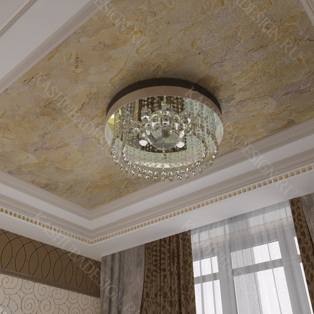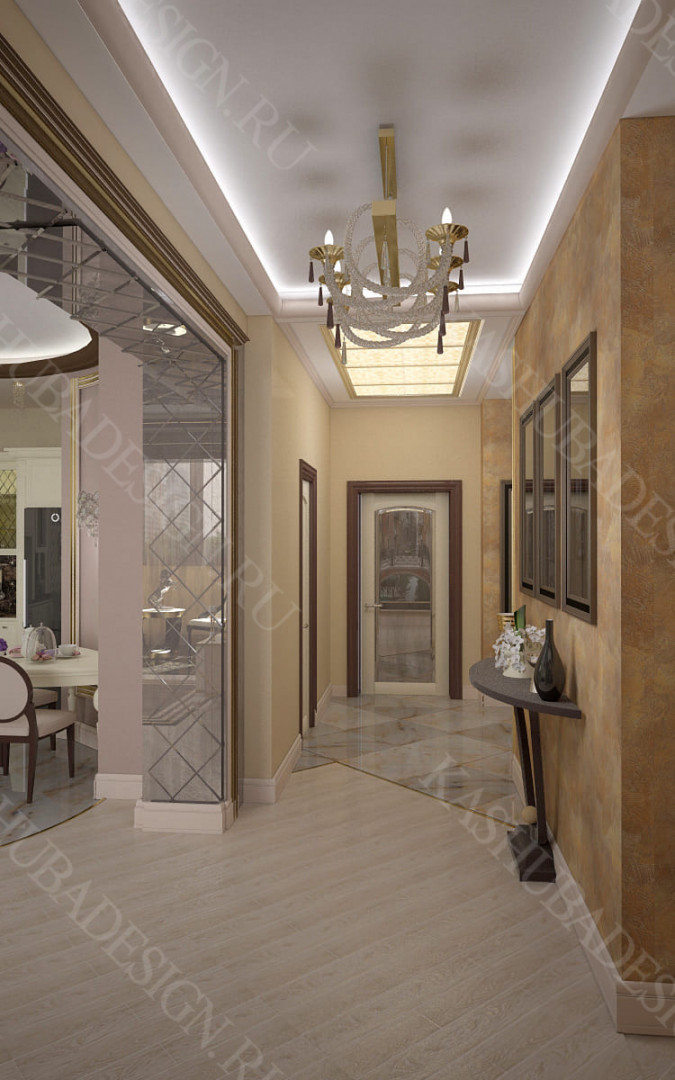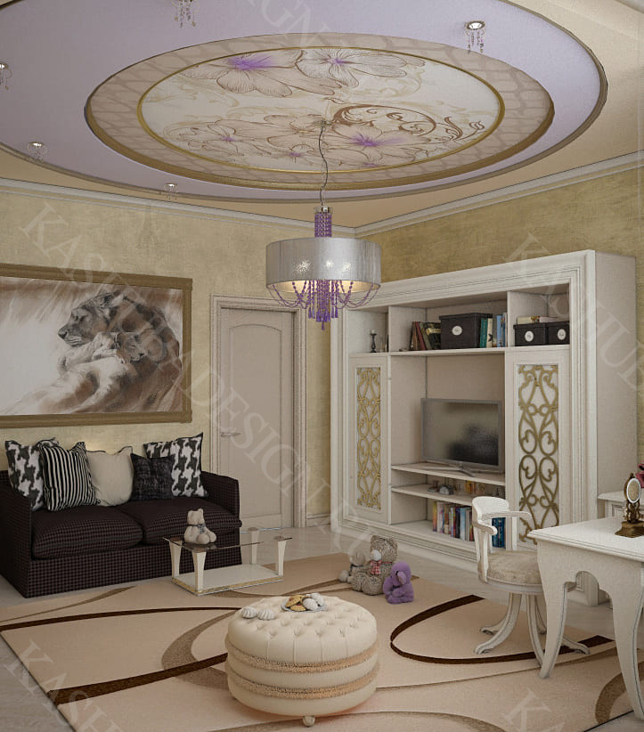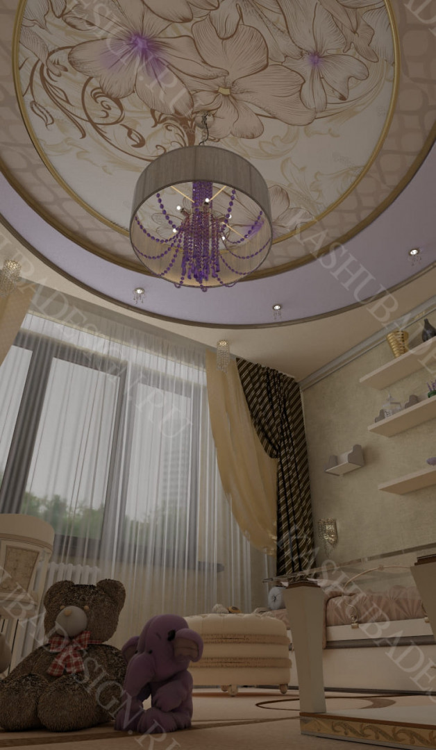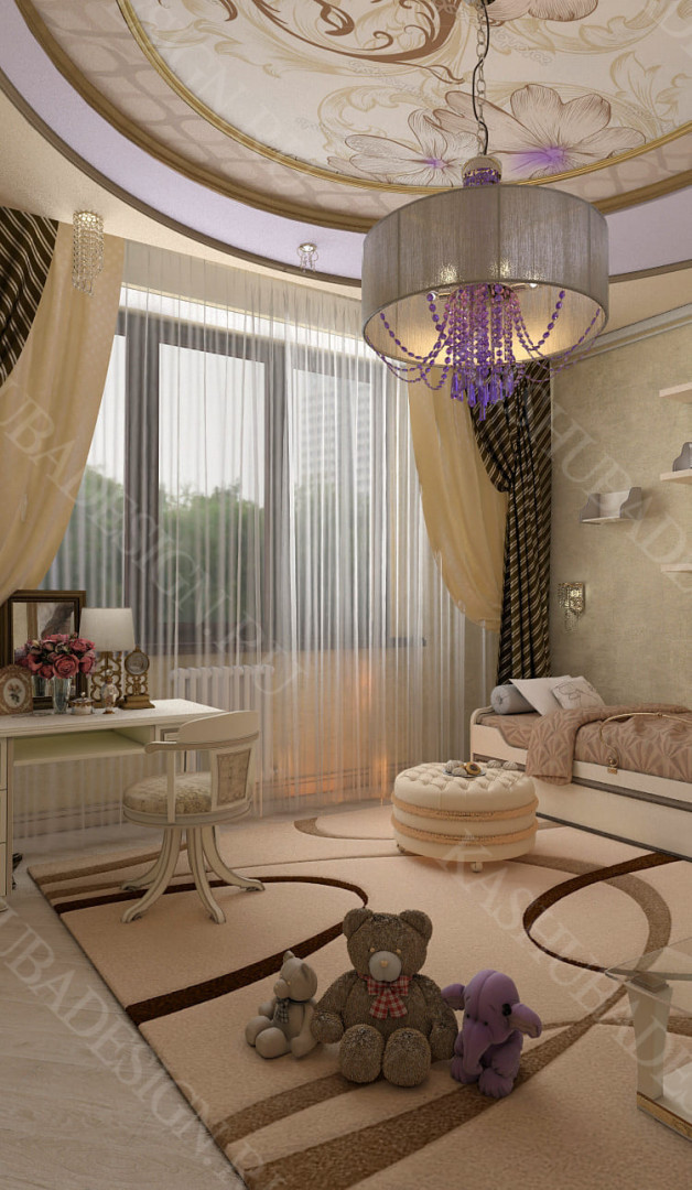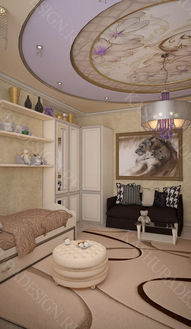Портал, ведущий из прихожей в гостиную, обрамлен лепниной с декорированием. Стены в гостиной отделаны декоративной штукатуркой со вставками двух панно из обоев, а на потолке расположено тонированное под бронзу зеркало с фацетами, зрительно увеличивающее его высоту. Потолок в хозяйской спальне отделан гипсовой лепниной с декорированием, его центральная часть выделена декоративной штукатуркой, а на стенах – красивые обои.Напольные покрытия в зоне прихожей и кухни - керамогранит, но в спальне, детской и гостиной - паркетная доска. Детская комната для девочки сделана в бежево-фиолетовых тонах, на потолке фреска с изображением цветов. В проектах квартир давно занимается использованием электронных систем в создании безопасных, комфортных и практичных условий для жизнедеятельности.