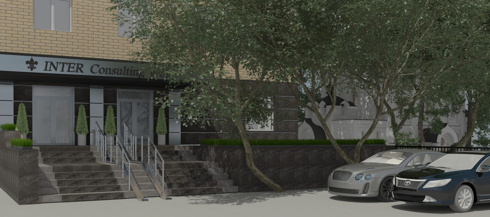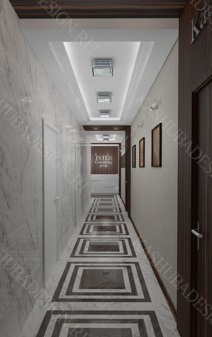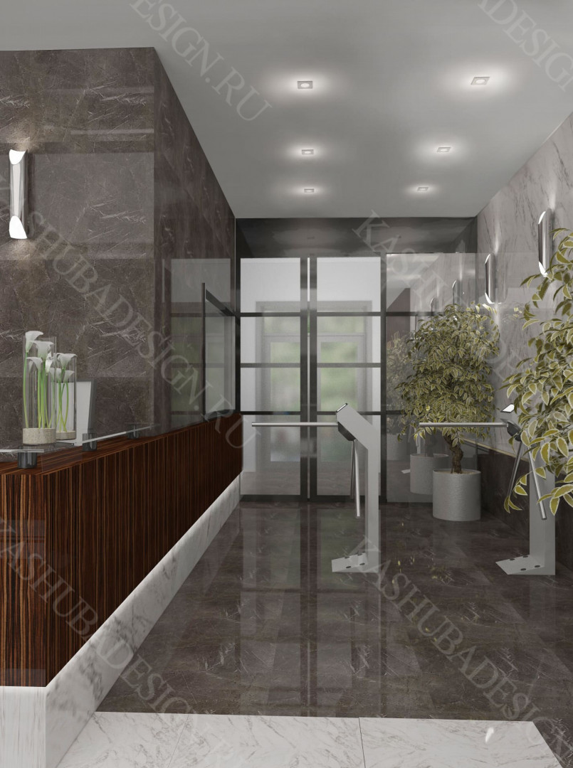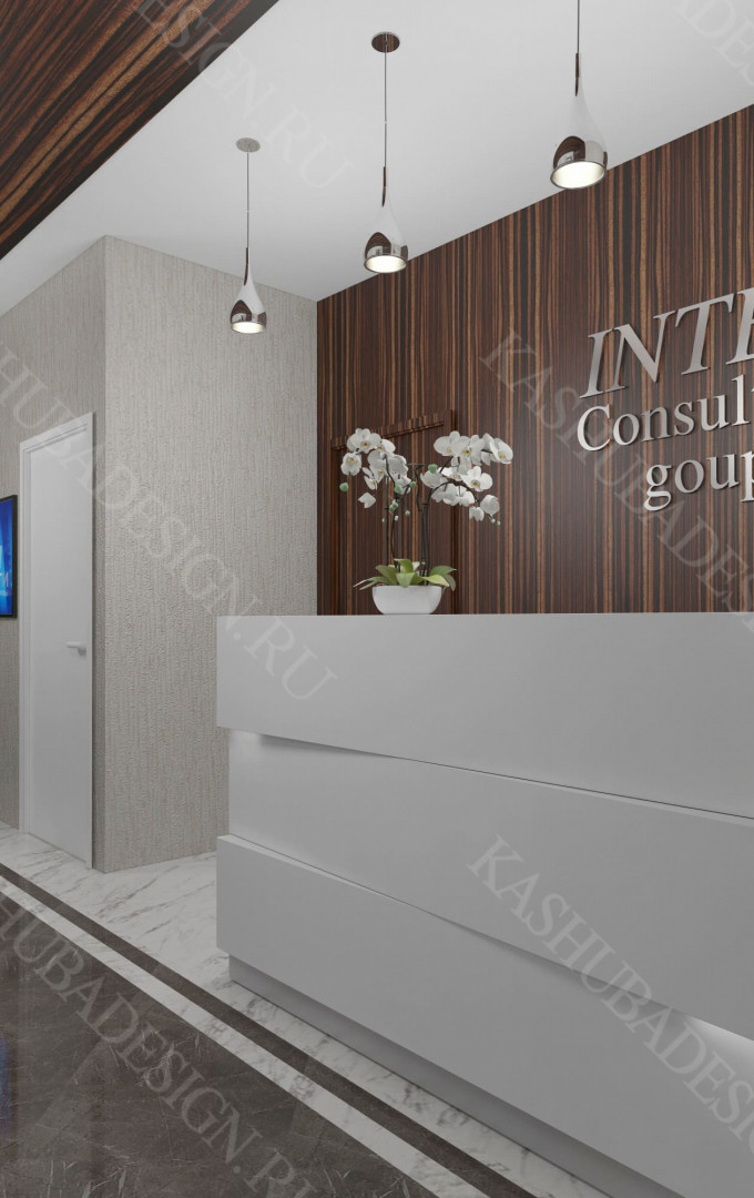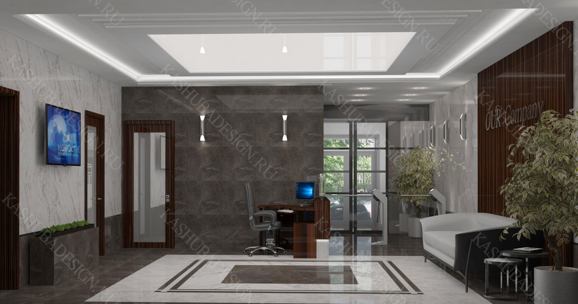 Дизайнеры бюро "KASHUBA DESIGN" разработали блок интерьеров для офиса в центре Москвы общей площадью 370 кв.м. В число этих интерьеров вошли: холл 1-го этажа с проходной, холл 2 этажа с коридорами и приемной, кабинеты руководителей, переговорная и санузлы. Простые в реализации и практичные в эксплуатации, эти интерьеры стали прекрасным воплощением стильного дизайна в пространстве офисного здания. Практически монохромный интерьер решен за счет белых и серых (мраморных) и коричневых (деревянных) плоскостей, которые создают композиционную основу всех помещений. Глянцевые поверхности увеличивают пространство и придают солидность интерьерам. Много внимания дизайнеры уделили свету, используя самые различные технические приемы: помимо традиционных бра, люстр, точечных встроенных светильников и светодиодных закарнизных подсветок, в холле первого этажа спроектирован натяжной белый потолок с подсветкой, который своим мягким рассеянным светом охватывает всё пространство входной группы. В санузлах используются зеркала со встроенной подсветкой, в кабинетах подсветки встроены в деревянные конструкции полок, в холле 2-го этажа подсветка проведена по периметру потолка, создавая визуальный эффект парящего потолка. Также в разработку был взят и фасад здания, выполнены несколько вариантов отделки уличной входной группы. Предусмотрены парковочные места, а лестницы оборудованы необходимыми перилами и пандусами, запроектированы зоны озеленения.