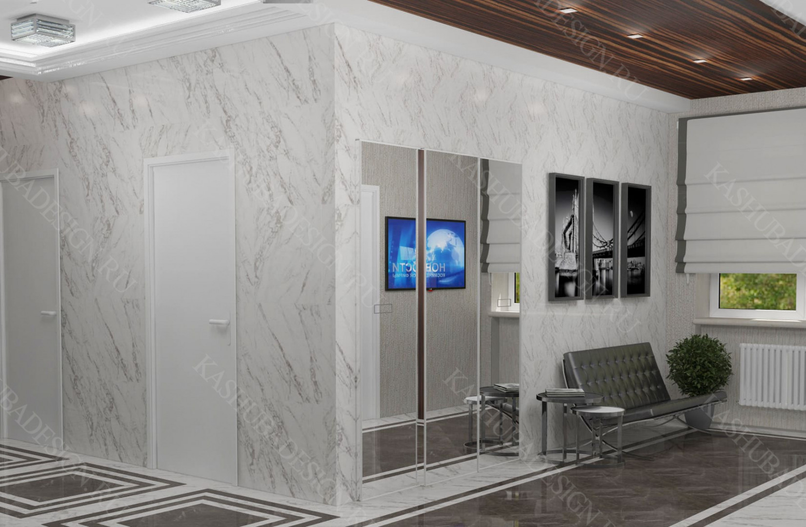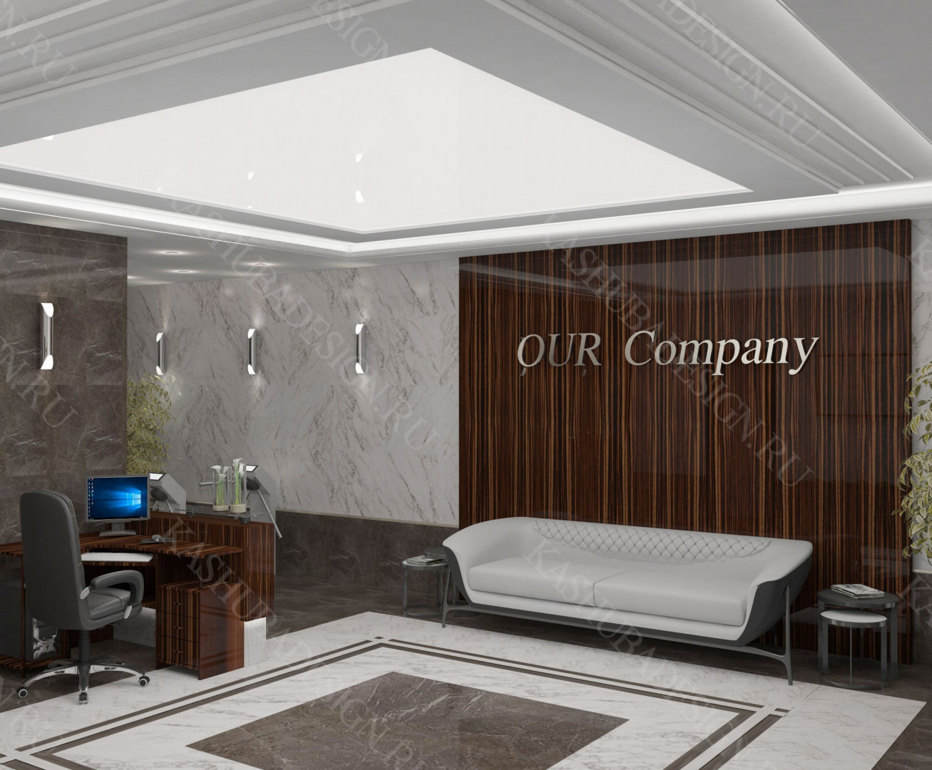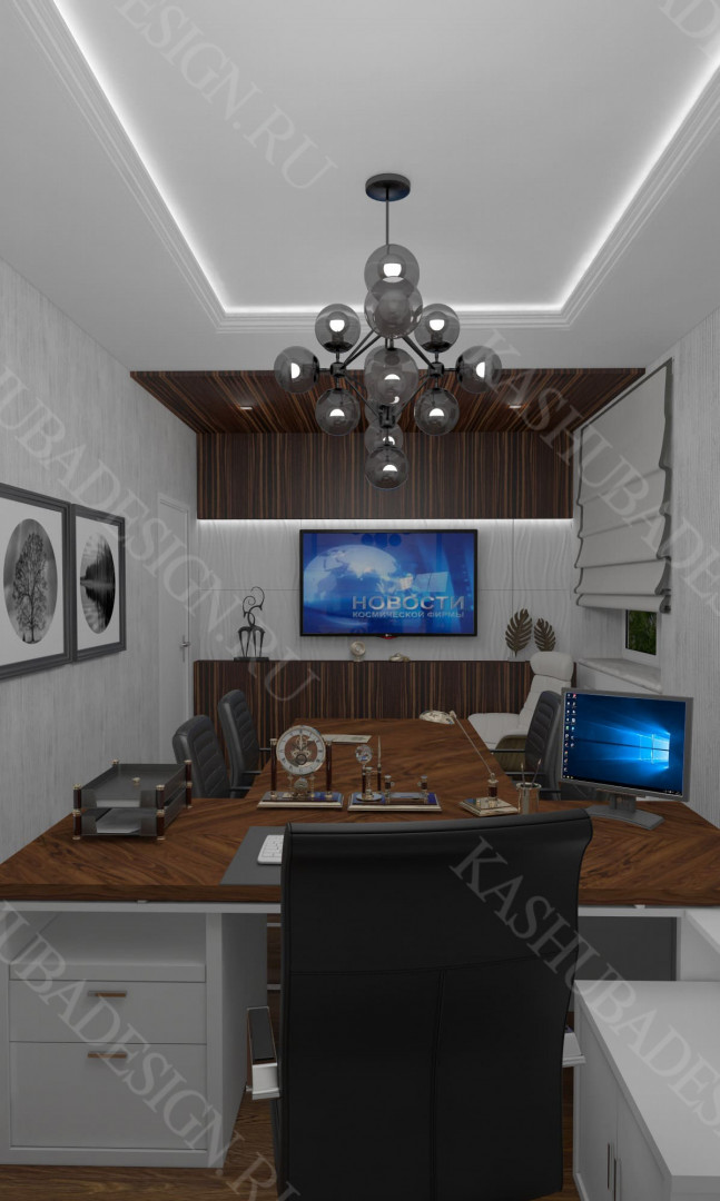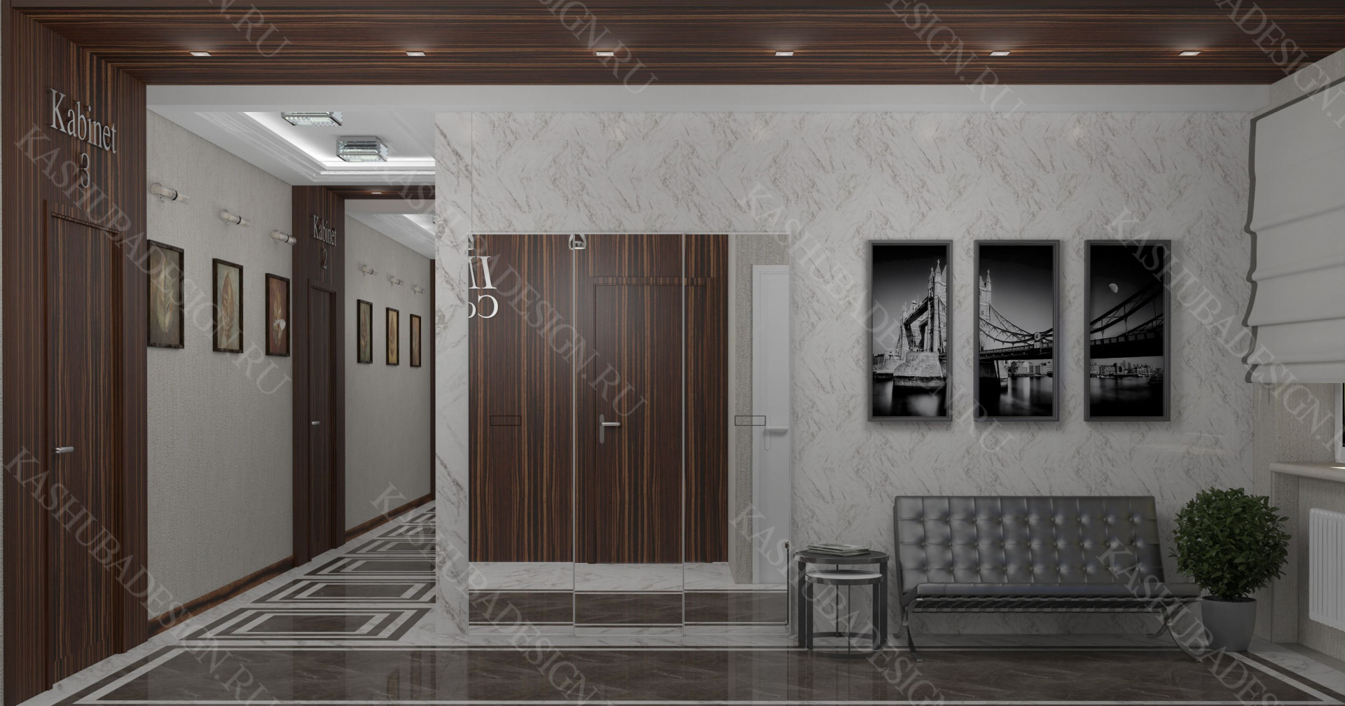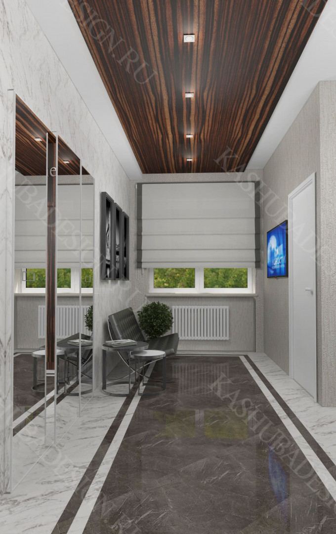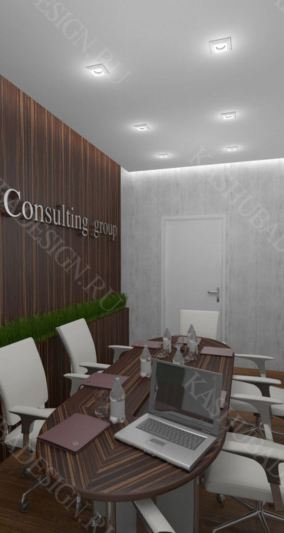 Дизайнеры бюро "KASHUBA DESIGN" разработали блок интерьеров для офиса в центре Москвы общей площадью 370 кв.м. В число этих интерьеров вошли: холл 1-го этажа с проходной, холл 2 этажа с коридорами и приемной, кабинеты руководителей, переговорная и санузлы. Простые в реализации и практичные в эксплуатации, эти интерьеры стали прекрасным воплощением стильного дизайна в пространстве офисного здания. Практически монохромный интерьер решен за счет белых и серых (мраморных) и коричневых (деревянных) плоскостей, которые создают композиционную основу всех помещений. Глянцевые поверхности увеличивают пространство и придают солидность интерьерам. Много внимания дизайнеры уделили свету, используя самые различные технические приемы: помимо традиционных бра, люстр, точечных встроенных светильников и светодиодных закарнизных подсветок, в холле первого этажа спроектирован натяжной белый потолок с подсветкой, который своим мягким рассеянным светом охватывает всё пространство входной группы. В санузлах используются зеркала со встроенной подсветкой, в кабинетах подсветки встроены в деревянные конструкции полок, в холле 2-го этажа подсветка проведена по периметру потолка, создавая визуальный эффект парящего потолка. Также в разработку был взят и фасад здания, выполнены несколько вариантов отделки уличной входной группы. Предусмотрены парковочные места, а лестницы оборудованы необходимыми перилами и пандусами, запроектированы зоны озеленения.