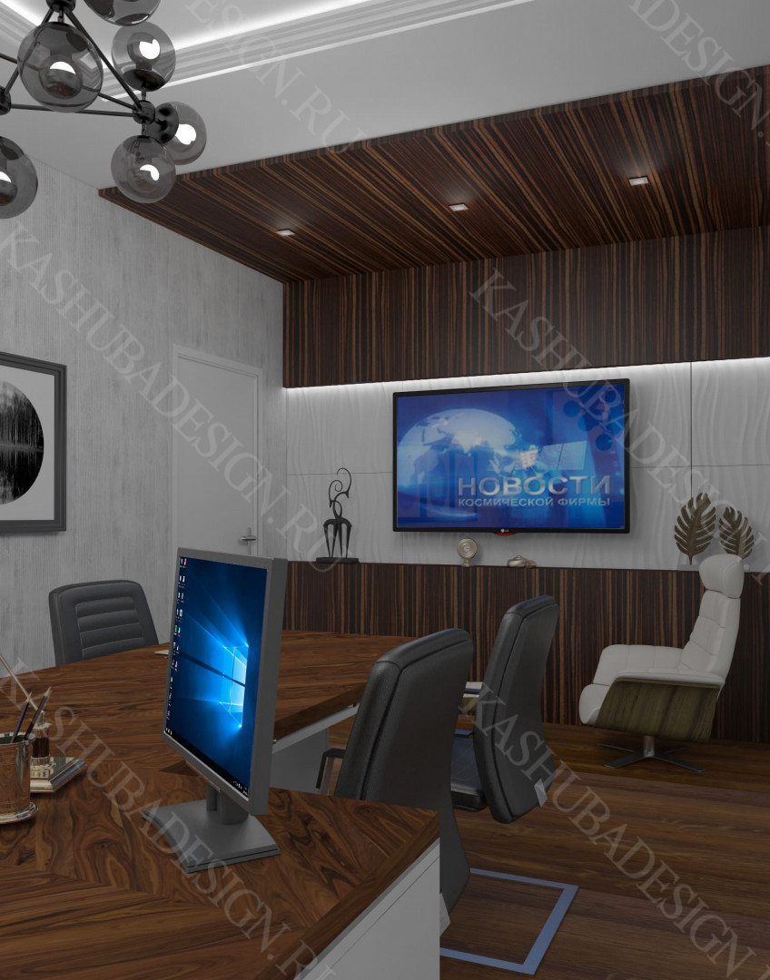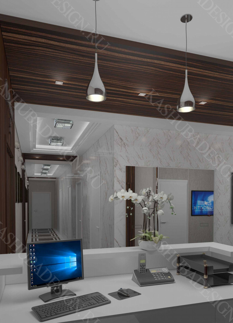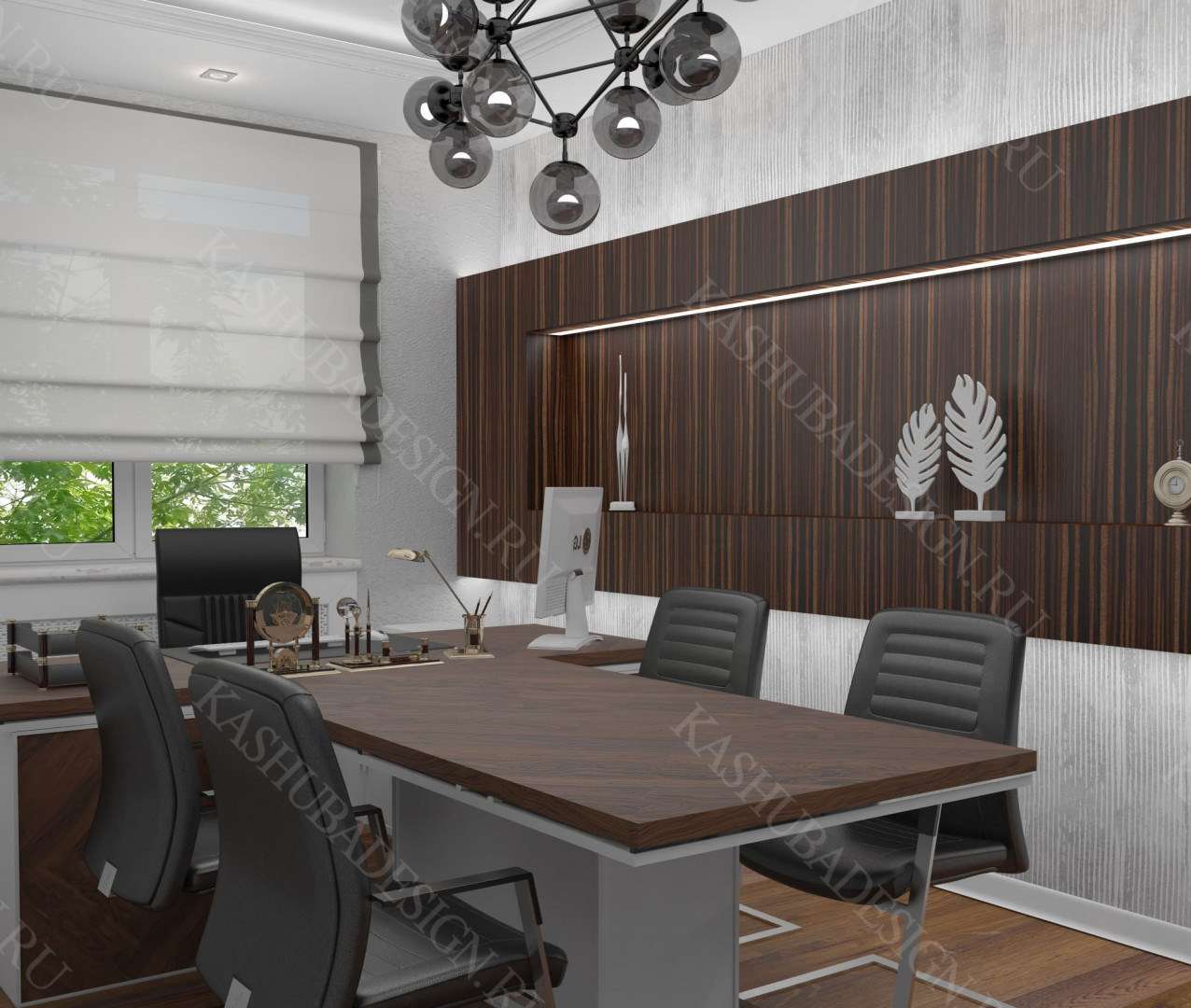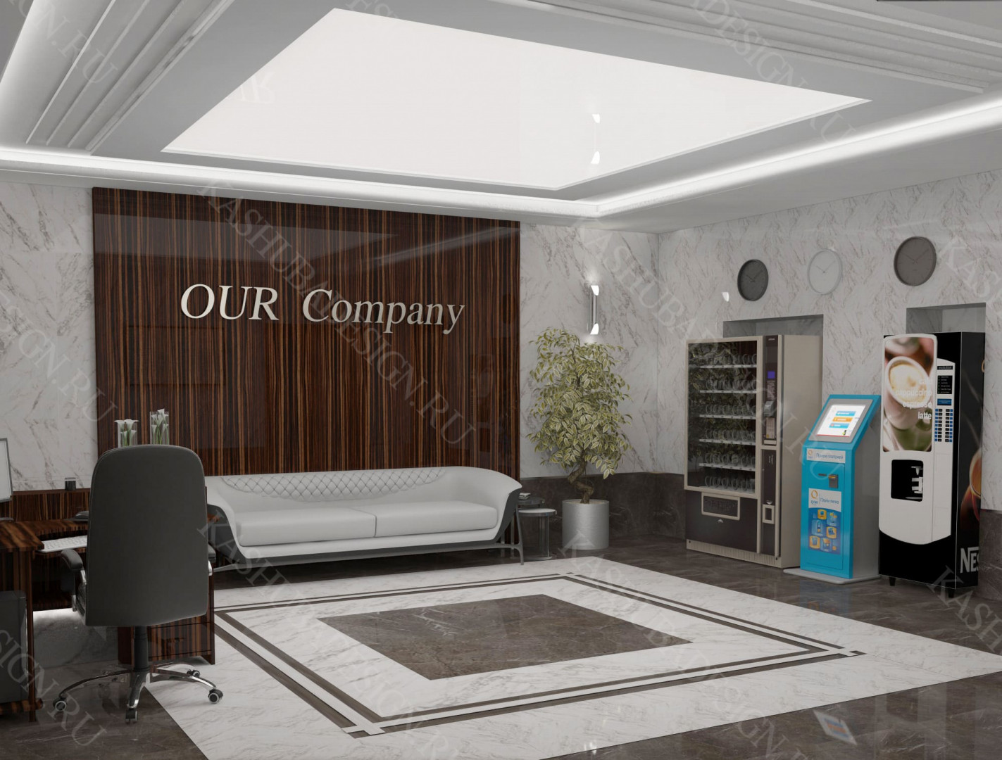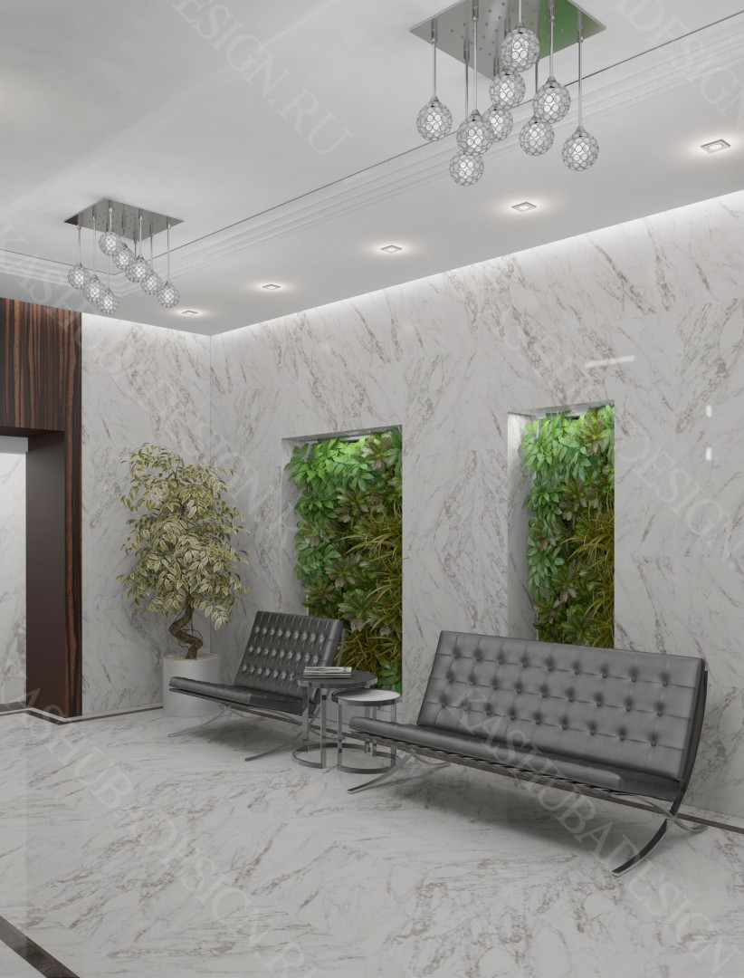 Дизайнеры бюро "KASHUBA DESIGN" разработали блок интерьеров для офиса в центре Москвы общей площадью 370 кв.м. В число этих интерьеров вошли: холл 1-го этажа с проходной, холл 2 этажа с коридорами и приемной, кабинеты руководителей, переговорная и санузлы. Простые в реализации и практичные в эксплуатации, эти интерьеры стали прекрасным воплощением стильного дизайна в пространстве офисного здания. Практически монохромный интерьер решен за счет белых и серых (мраморных) и коричневых (деревянных) плоскостей, которые создают композиционную основу всех помещений. Глянцевые поверхности увеличивают пространство и придают солидность интерьерам. Много внимания дизайнеры уделили свету, используя самые различные технические приемы: помимо традиционных бра, люстр, точечных встроенных светильников и светодиодных закарнизных подсветок, в холле первого этажа спроектирован натяжной белый потолок с подсветкой, который своим мягким рассеянным светом охватывает всё пространство входной группы. В санузлах используются зеркала со встроенной подсветкой, в кабинетах подсветки встроены в деревянные конструкции полок, в холле 2-го этажа подсветка проведена по периметру потолка, создавая визуальный эффект парящего потолка. Также в разработку был взят и фасад здания, выполнены несколько вариантов отделки уличной входной группы. Предусмотрены парковочные места, а лестницы оборудованы необходимыми перилами и пандусами, запроектированы зоны озеленения.