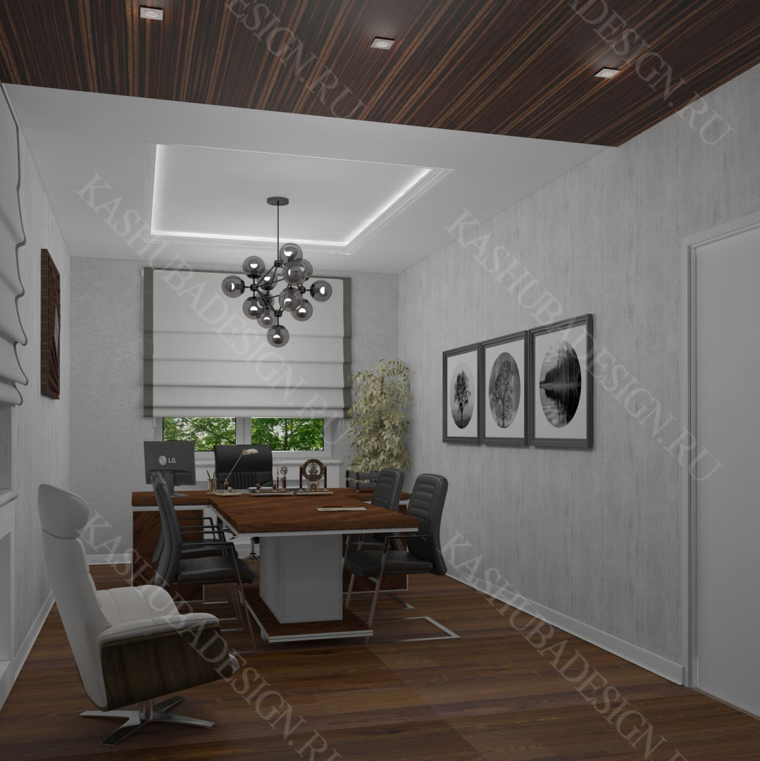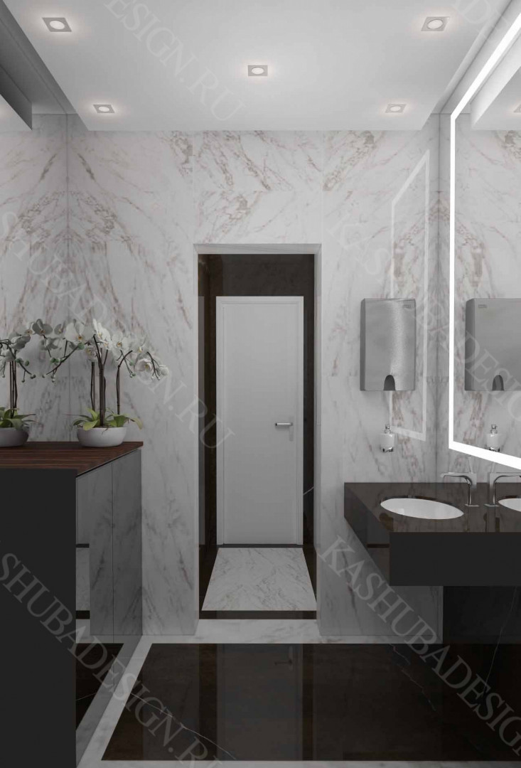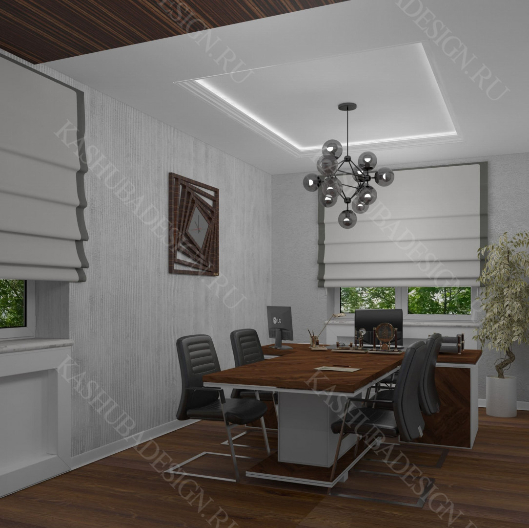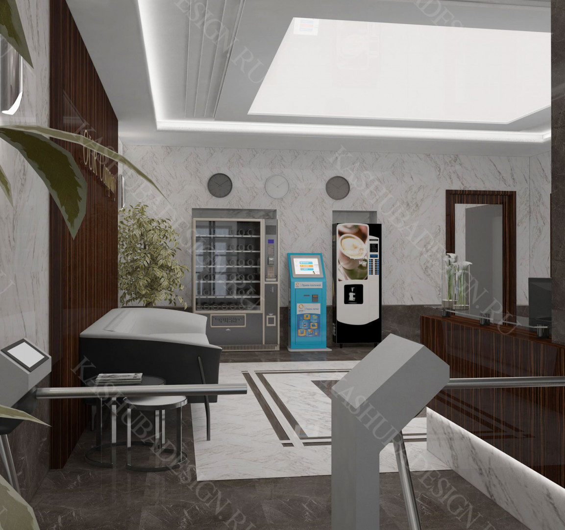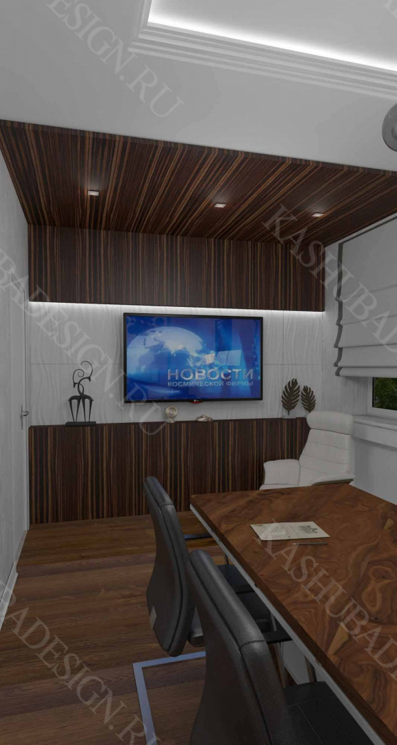 Дизайнеры бюро "KASHUBA DESIGN" разработали блок интерьеров для офиса в центре Москвы общей площадью 370 кв.м. В число этих интерьеров вошли: холл 1-го этажа с проходной, холл 2 этажа с коридорами и приемной, кабинеты руководителей, переговорная и санузлы. Простые в реализации и практичные в эксплуатации, эти интерьеры стали прекрасным воплощением стильного дизайна в пространстве офисного здания. Практически монохромный интерьер решен за счет белых и серых (мраморных) и коричневых (деревянных) плоскостей, которые создают композиционную основу всех помещений. Глянцевые поверхности увеличивают пространство и придают солидность интерьерам. Много внимания дизайнеры уделили свету, используя самые различные технические приемы: помимо традиционных бра, люстр, точечных встроенных светильников и светодиодных закарнизных подсветок, в холле первого этажа спроектирован натяжной белый потолок с подсветкой, который своим мягким рассеянным светом охватывает всё пространство входной группы. В санузлах используются зеркала со встроенной подсветкой, в кабинетах подсветки встроены в деревянные конструкции полок, в холле 2-го этажа подсветка проведена по периметру потолка, создавая визуальный эффект парящего потолка. Также в разработку был взят и фасад здания, выполнены несколько вариантов отделки уличной входной группы. Предусмотрены парковочные места, а лестницы оборудованы необходимыми перилами и пандусами, запроектированы зоны озеленения.