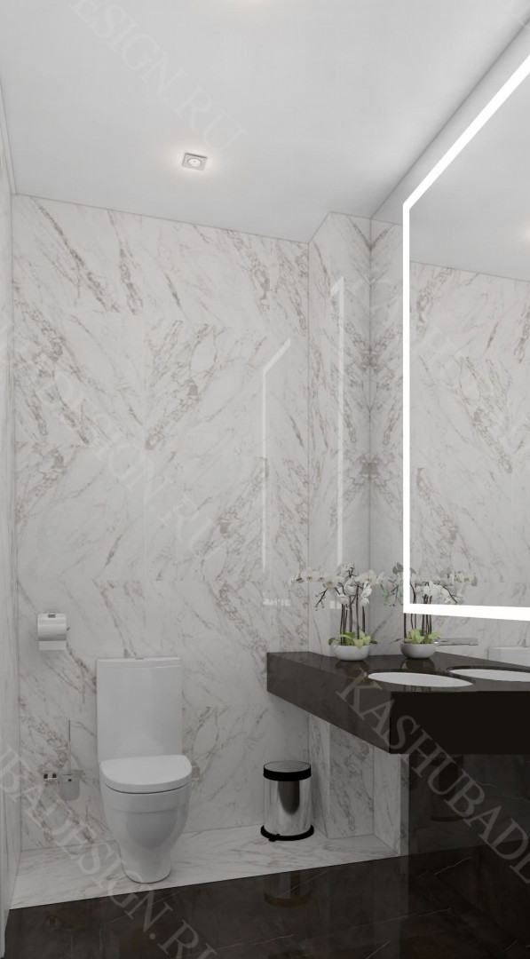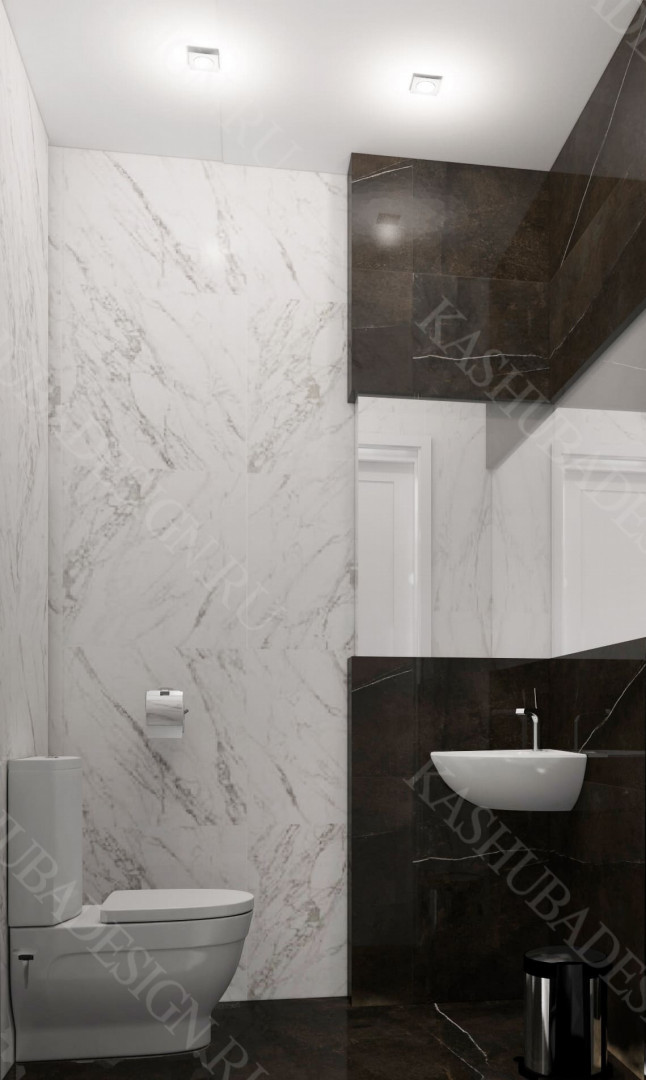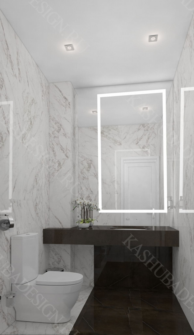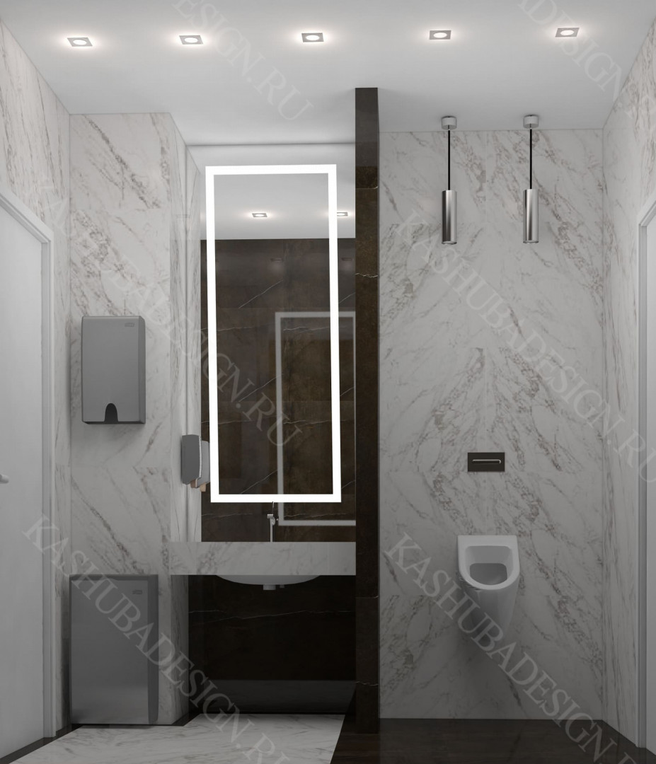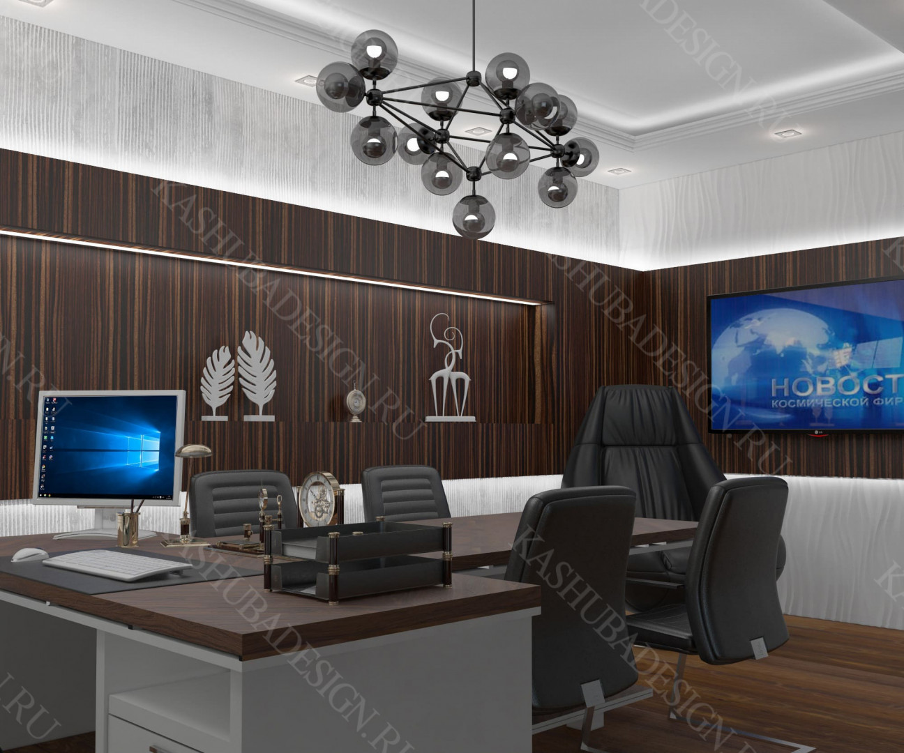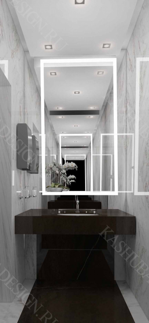 Дизайнеры бюро "KASHUBA DESIGN" разработали блок интерьеров для офиса в центре Москвы общей площадью 370 кв.м. В число этих интерьеров вошли: холл 1-го этажа с проходной, холл 2 этажа с коридорами и приемной, кабинеты руководителей, переговорная и санузлы. Простые в реализации и практичные в эксплуатации, эти интерьеры стали прекрасным воплощением стильного дизайна в пространстве офисного здания. Практически монохромный интерьер решен за счет белых и серых (мраморных) и коричневых (деревянных) плоскостей, которые создают композиционную основу всех помещений. Глянцевые поверхности увеличивают пространство и придают солидность интерьерам. Много внимания дизайнеры уделили свету, используя самые различные технические приемы: помимо традиционных бра, люстр, точечных встроенных светильников и светодиодных закарнизных подсветок, в холле первого этажа спроектирован натяжной белый потолок с подсветкой, который своим мягким рассеянным светом охватывает всё пространство входной группы. В санузлах используются зеркала со встроенной подсветкой, в кабинетах подсветки встроены в деревянные конструкции полок, в холле 2-го этажа подсветка проведена по периметру потолка, создавая визуальный эффект парящего потолка. Также в разработку был взят и фасад здания, выполнены несколько вариантов отделки уличной входной группы. Предусмотрены парковочные места, а лестницы оборудованы необходимыми перилами и пандусами, запроектированы зоны озеленения.