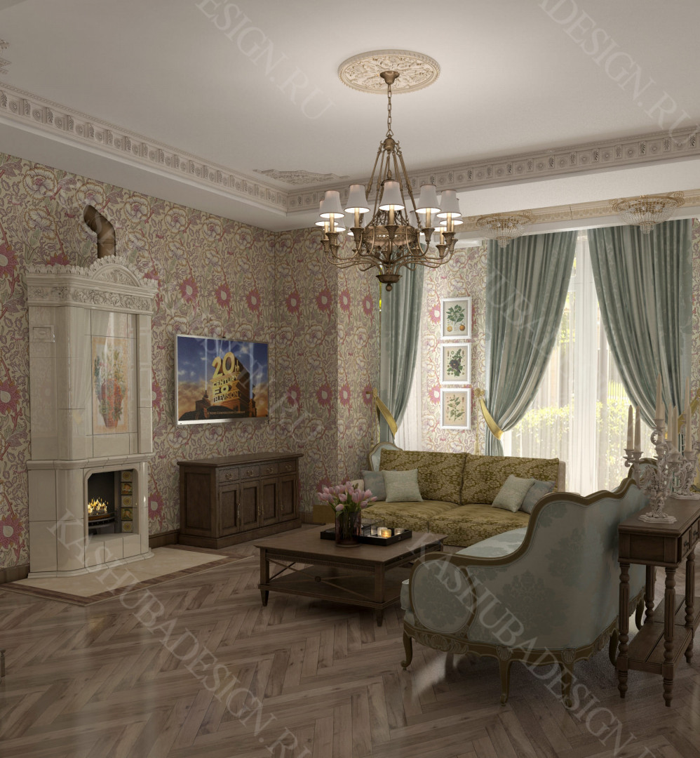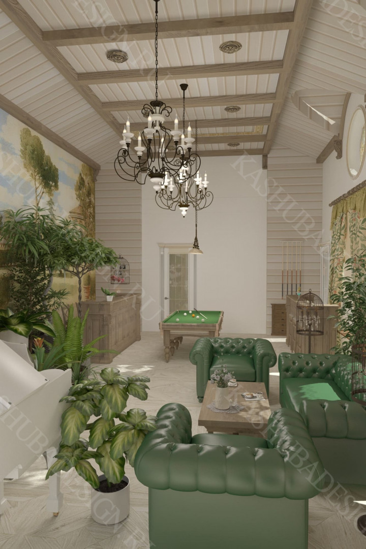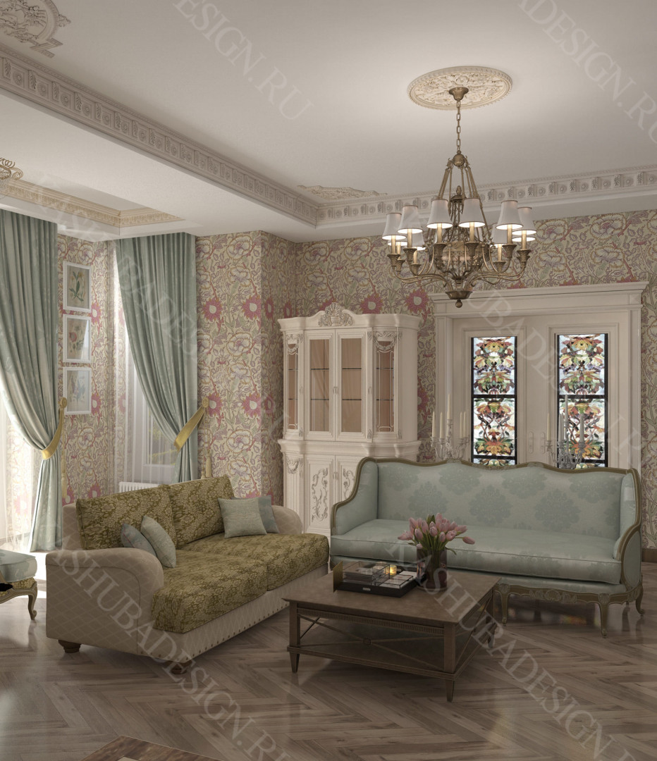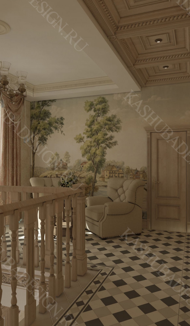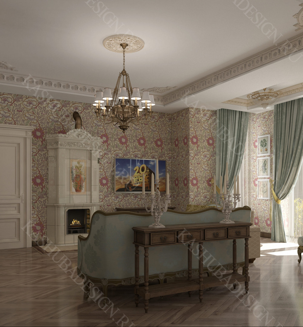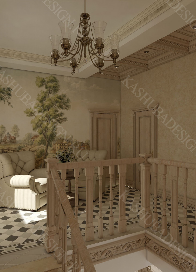 Дом в Подмосковье, общей площадью 402 м2, с отдельно стоящим гаражом на две машины, и участком площадью 3500 м2 выполнен в классическом стиле с элементами русского стиля. По планировке, состоит из двух этажей и холодного чердака. На первом этаже находится бассейн, сауна, санузел, просторный зимний сад с бильярдным столом, домашним кинотеатром и электроялем, гостиная с изразцовым камином, кухня, гостевая спальня с санузлом и постирочная. На втором этаже располагается хозяйская часть дома, состоящая из большой спальни, кабинета, гардеробной и санузла, детская часть - детская комната с санузлом и гардеробной и гостевая спальня. Из холла 2 этажа на холодный чердак ведет люк с выдвижной лестницей с электроприводом. На чердаке размещается оборудование приточно-вытяжной системы вентиляции. В отделке преобладают натуральные материалы, дерево, мрамор, гипсовая лепнина. Пол на 1 этаже дома выложен керамогранитом с подогревом.
