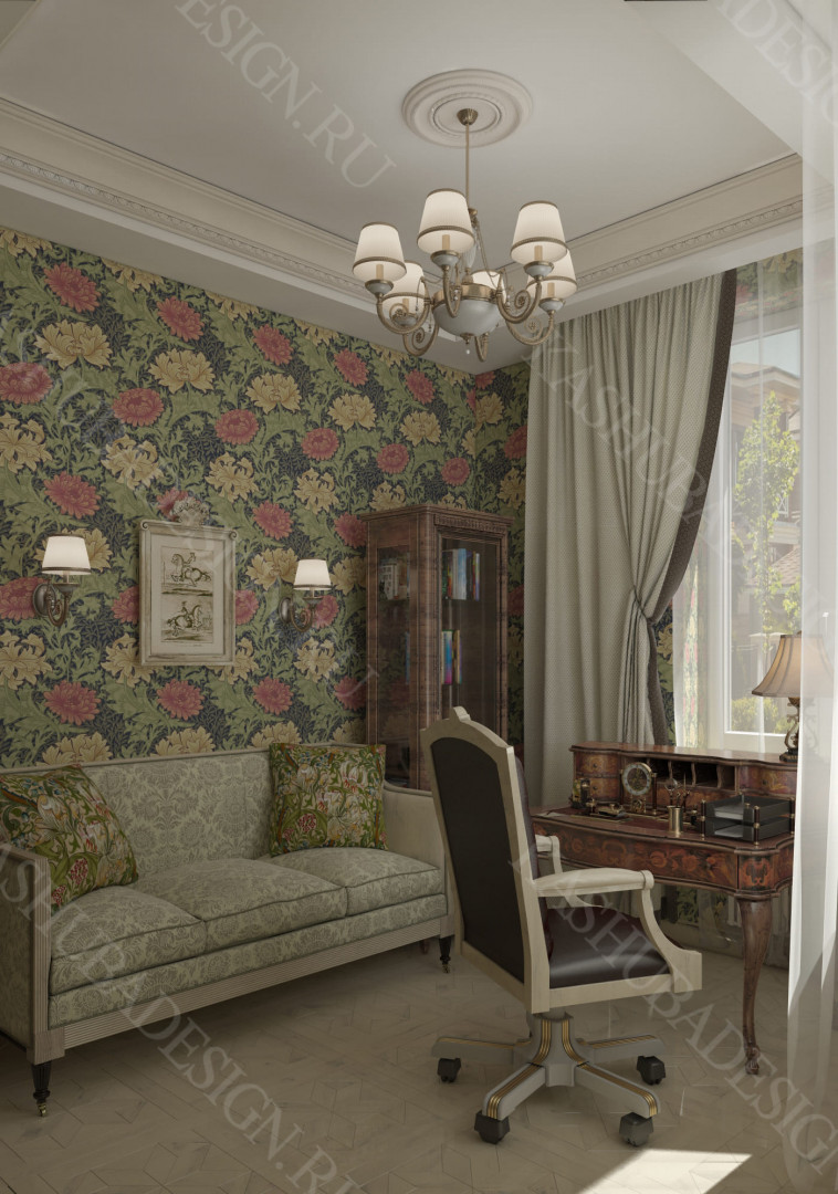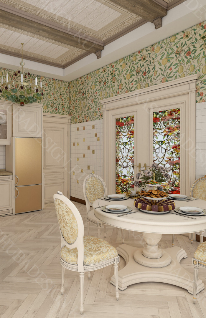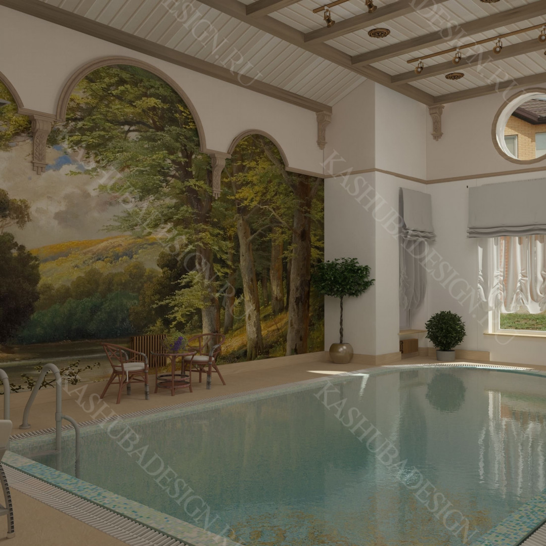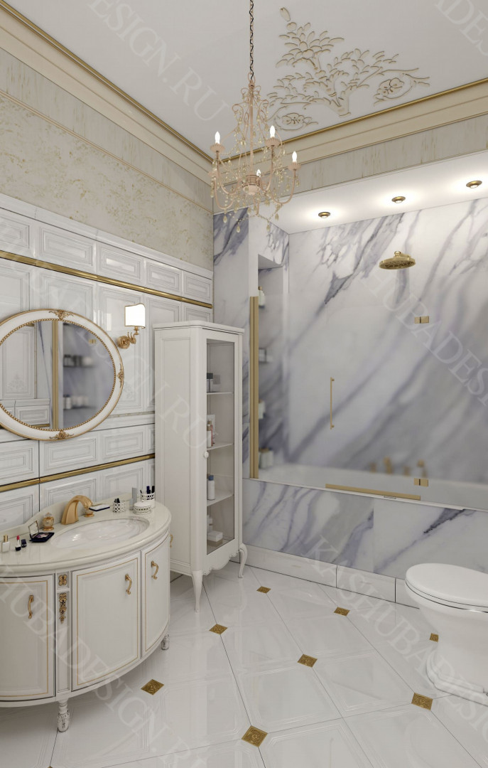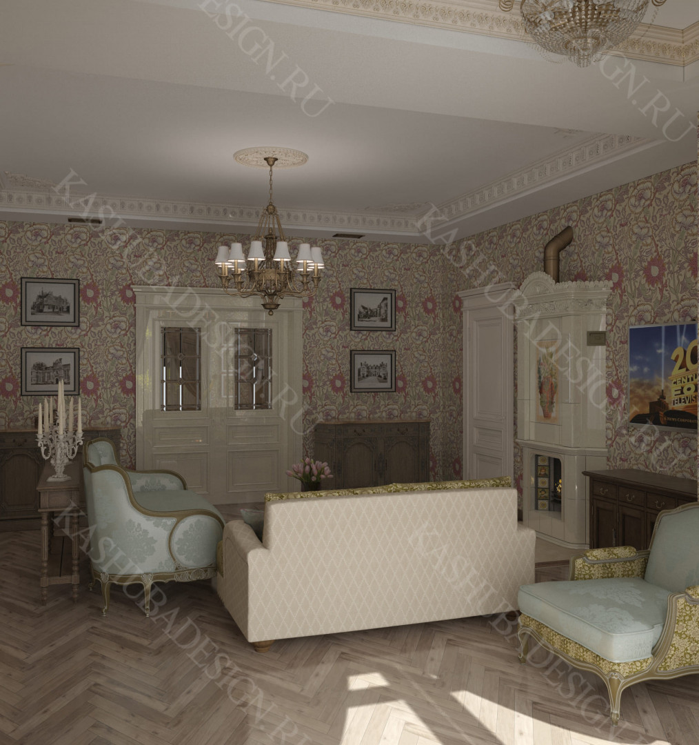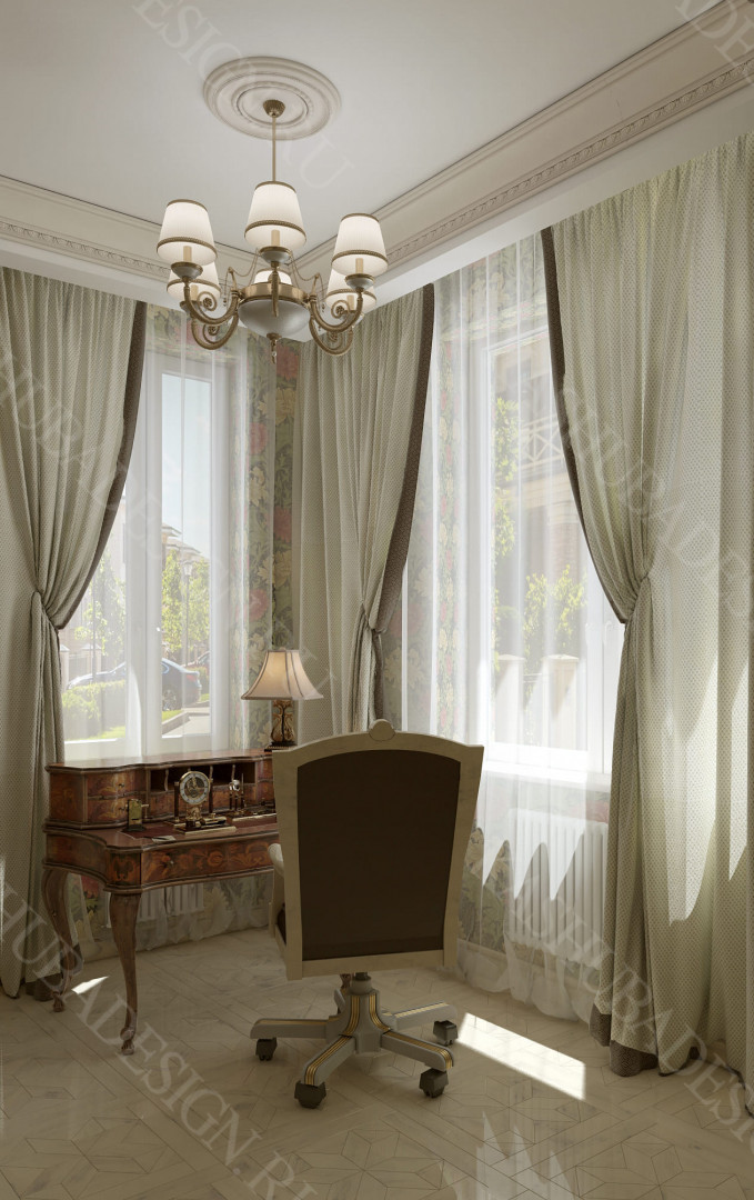 Дом в Подмосковье, общей площадью 402 м2, с отдельно стоящим гаражом на две машины, и участком площадью 3500 м2 выполнен в классическом стиле с элементами русского стиля. По планировке, состоит из двух этажей и холодного чердака. На первом этаже находится бассейн, сауна, санузел, просторный зимний сад с бильярдным столом, домашним кинотеатром и электроялем, гостиная с изразцовым камином, кухня, гостевая спальня с санузлом и постирочная. На втором этаже располагается хозяйская часть дома, состоящая из большой спальни, кабинета, гардеробной и санузла, детская часть - детская комната с санузлом и гардеробной и гостевая спальня. Из холла 2 этажа на холодный чердак ведет люк с выдвижной лестницей с электроприводом. На чердаке размещается оборудование приточно-вытяжной системы вентиляции. В отделке преобладают натуральные материалы, дерево, мрамор, гипсовая лепнина. Пол на 1 этаже дома выложен керамогранитом с подогревом.