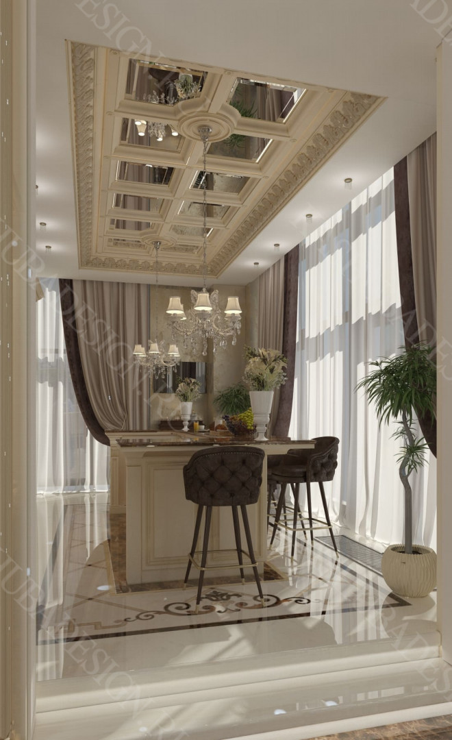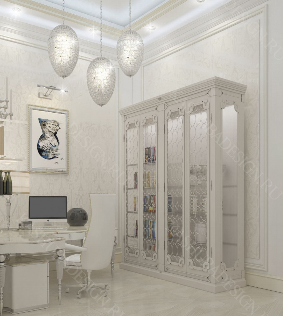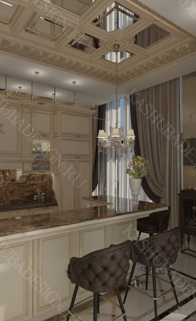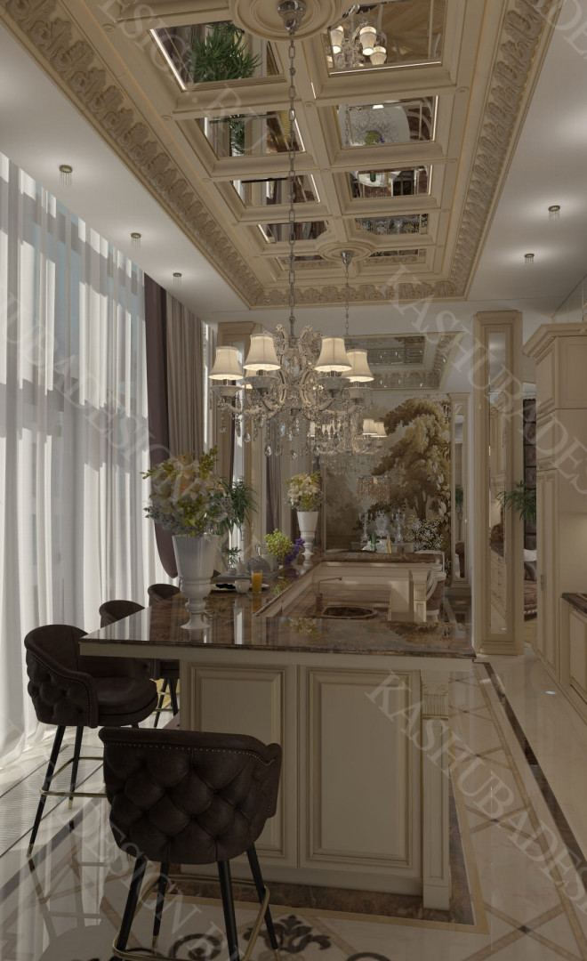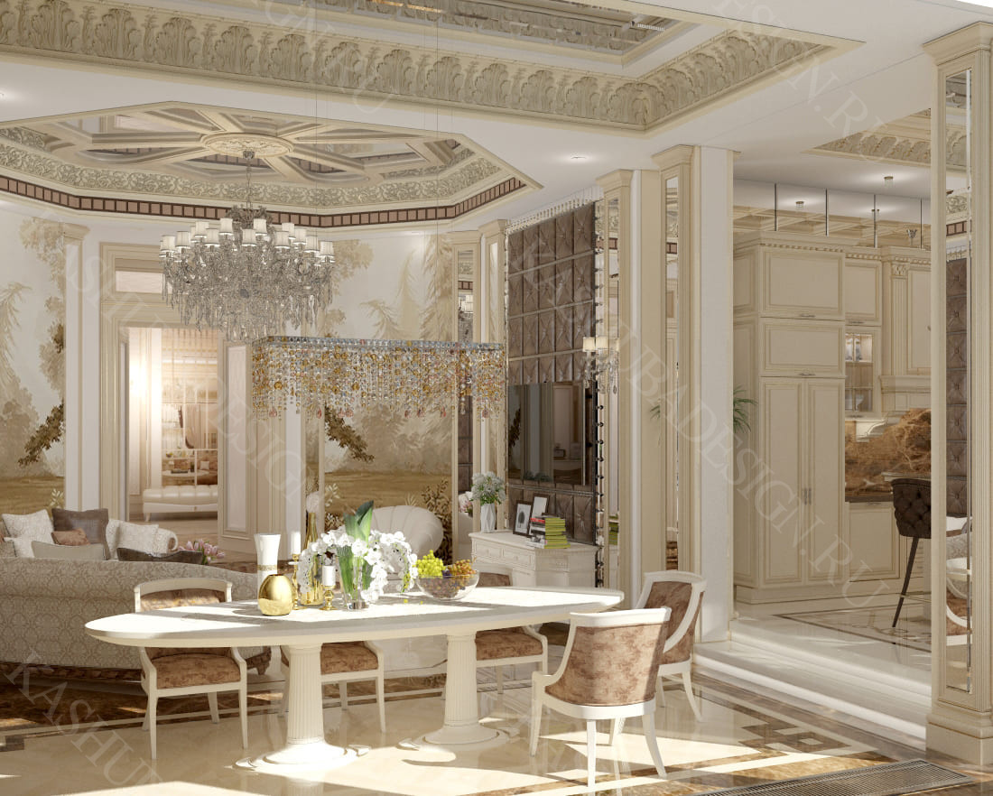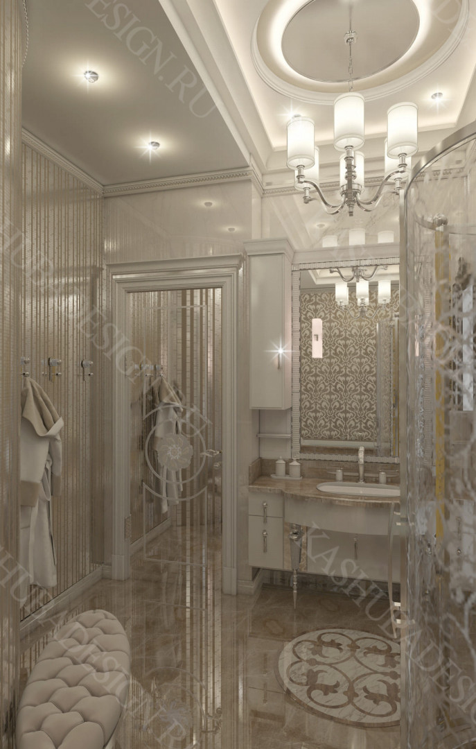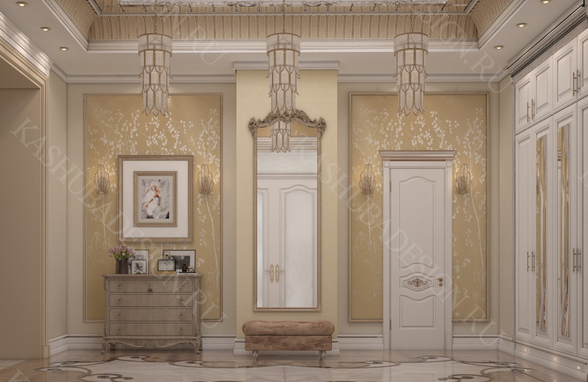 Из проекта квартиры в центре Москвы представляем: входную зону, гостиную-столовую и кухню, выполненные в едином классическом стиле, с элементами ар-деко. Кабинет также выполнен в этом стиле, но с элементами восточного стиля. Проект объединяет в единое целое сложные творческие поиски, развивающие богатый внутренний мир заказчика. Цветовая гамма объекта светлая, бежевая, с небольшими акцентами темно-коричневого цвета в элементах потолка, пола и текстиле. Напольное покрытие - мрамор, со вставкой паркета в зоне гостиной. Для зрительного увеличения объема помещений, применены элементы из тонированного зеркала - зеркальные дверцы шкафа и потолок в прихожей, декоративное обрамление телевизора в гостиной, отделка стены на кухне. Высота потолков позволила использовать длинные и объёмные люстры, придающие интерьеру парадность. Освещение помещений осуществляется за счет большого светового витража в технике Тиффани на потолке, люстры, и двух бра. Почти вдоль всех стен расположены шкафы из темного дерева для хранения книг, а возле окна расположен небольшой кожаный диван. Внутренние взаимосвязи предметов усиливают здоровый эффект красоты, комфорта и безопасности эксклюзивных интерьеров. Будет важна их ясная зрительская узнаваемость и запоминаемость.