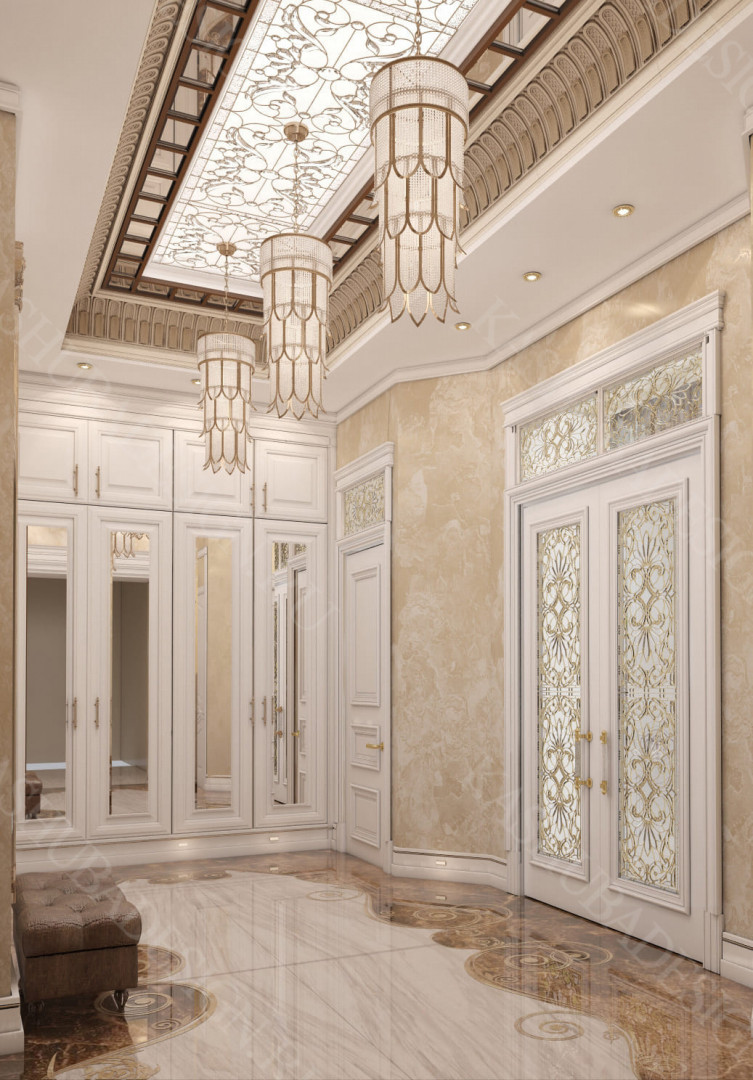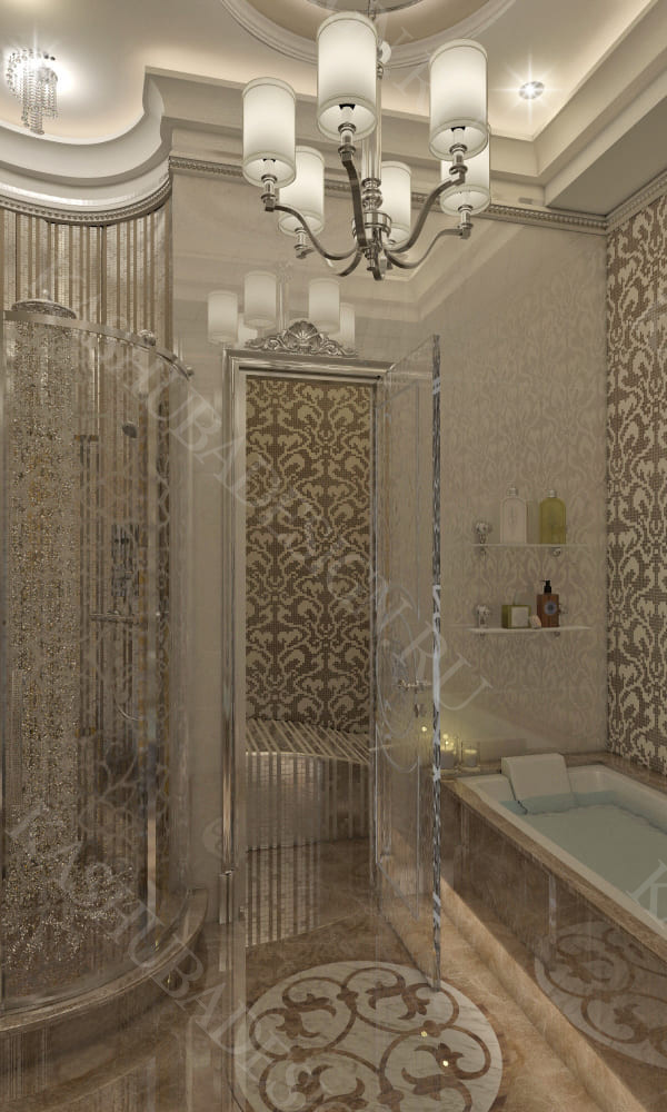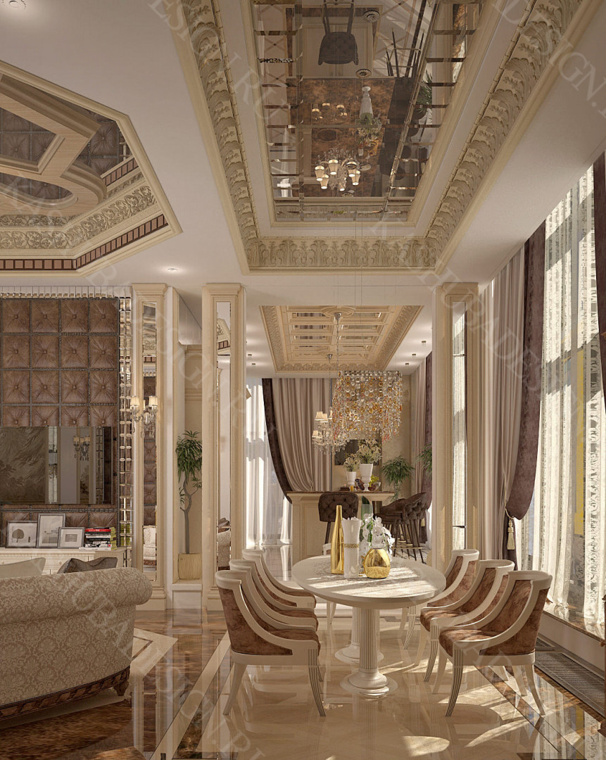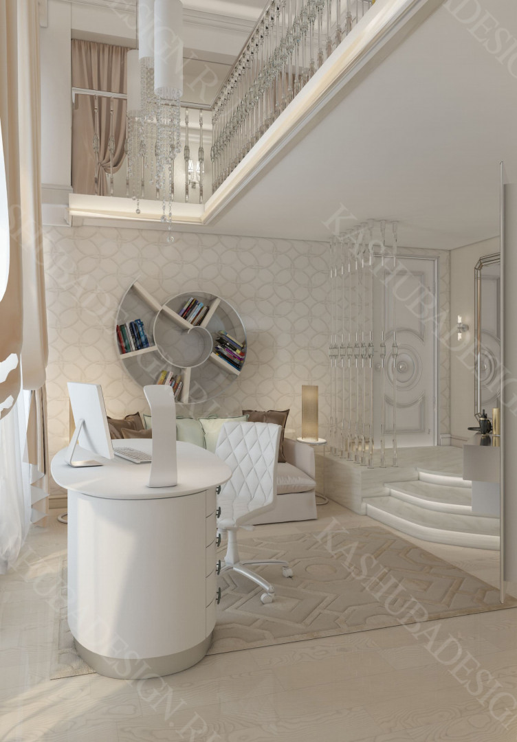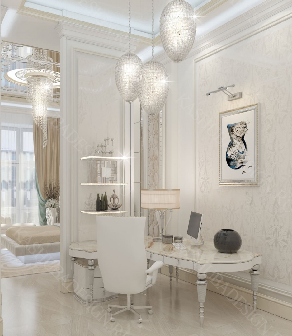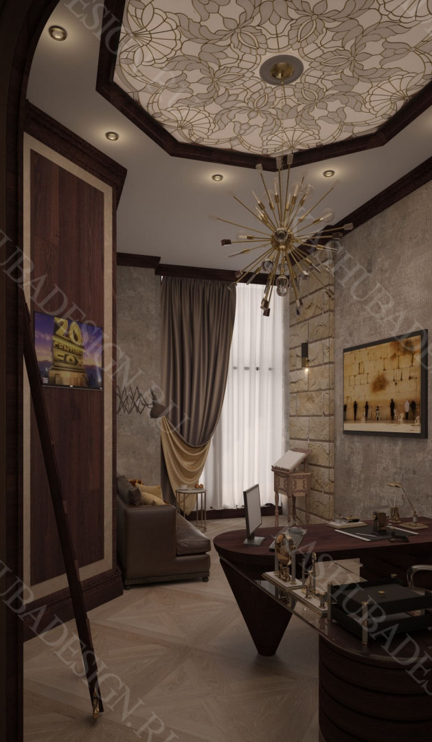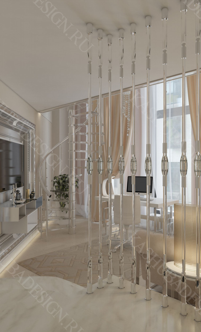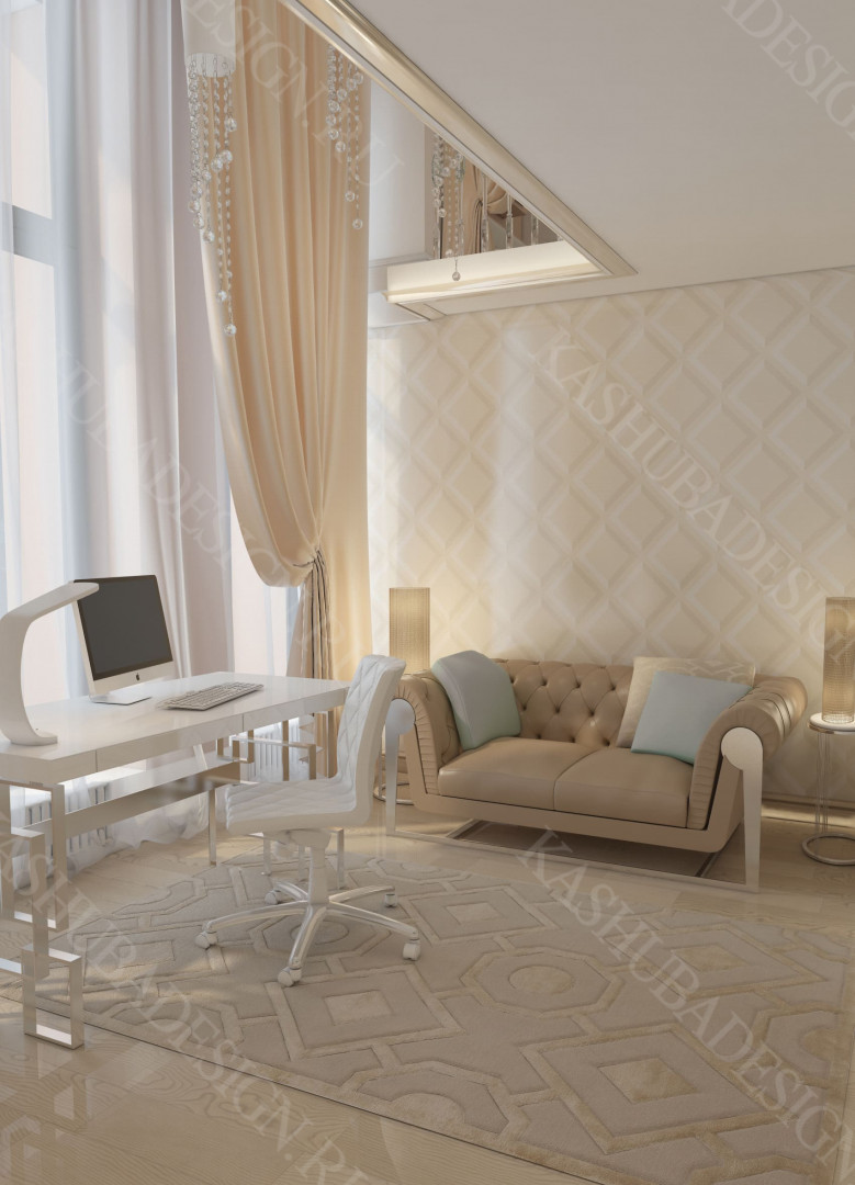 Из проекта квартиры в центре Москвы представляем: входную зону, гостиную-столовую и кухню, выполненные в едином классическом стиле, с элементами ар-деко. Кабинет также выполнен в этом стиле, но с элементами восточного стиля. Проект объединяет в единое целое сложные творческие поиски, развивающие богатый внутренний мир заказчика. Цветовая гамма объекта светлая, бежевая, с небольшими акцентами темно-коричневого цвета в элементах потолка, пола и текстиле. Напольное покрытие - мрамор, со вставкой паркета в зоне гостиной. Для зрительного увеличения объема помещений, применены элементы из тонированного зеркала - зеркальные дверцы шкафа и потолок в прихожей, декоративное обрамление телевизора в гостиной, отделка стены на кухне. Высота потолков позволила использовать длинные и объёмные люстры, придающие интерьеру парадность. Освещение помещений осуществляется за счет большого светового витража в технике Тиффани на потолке, люстры, и двух бра. Почти вдоль всех стен расположены шкафы из темного дерева для хранения книг, а возле окна расположен небольшой кожаный диван. Внутренние взаимосвязи предметов усиливают здоровый эффект красоты, комфорта и безопасности эксклюзивных интерьеров. Будет важна их ясная зрительская узнаваемость и запоминаемость.