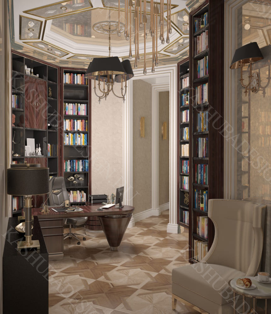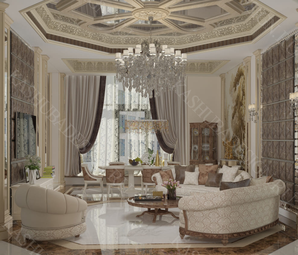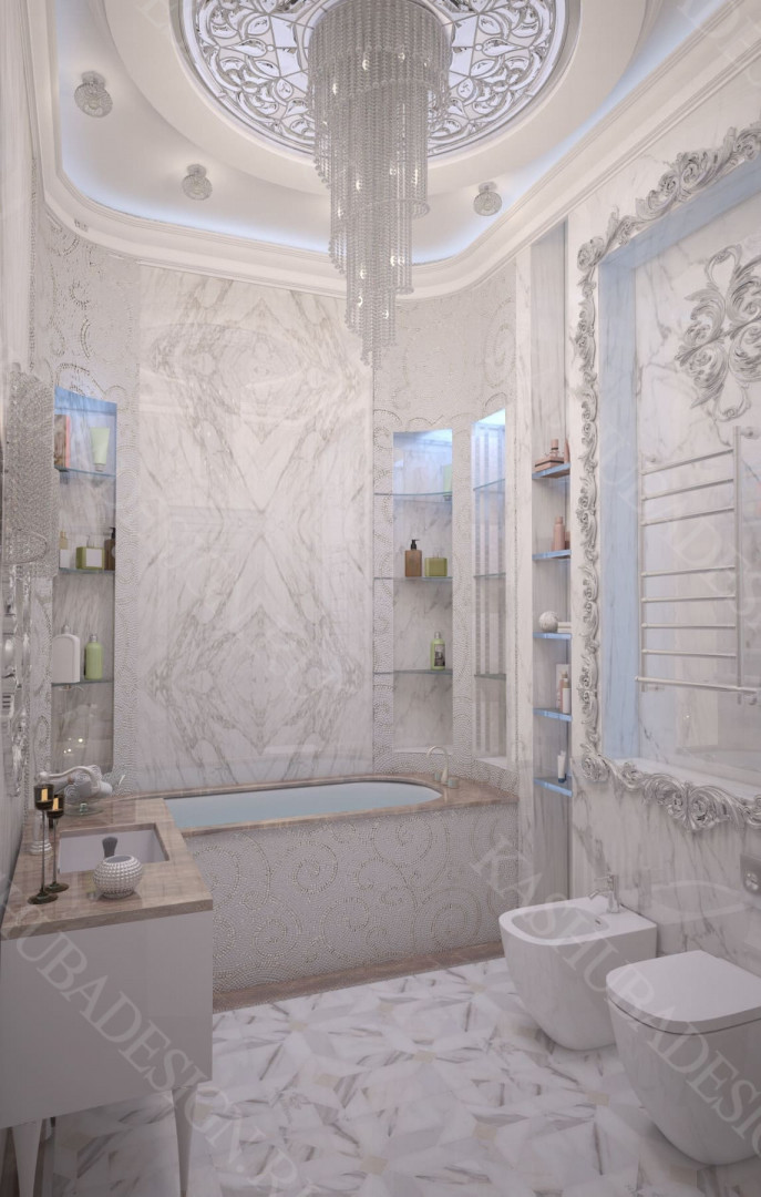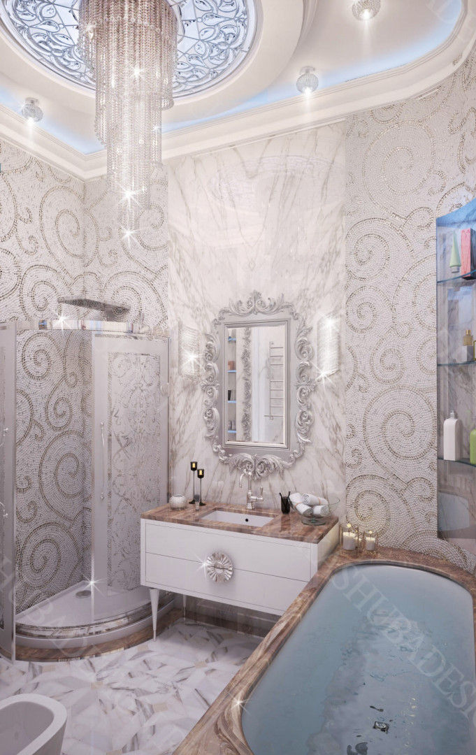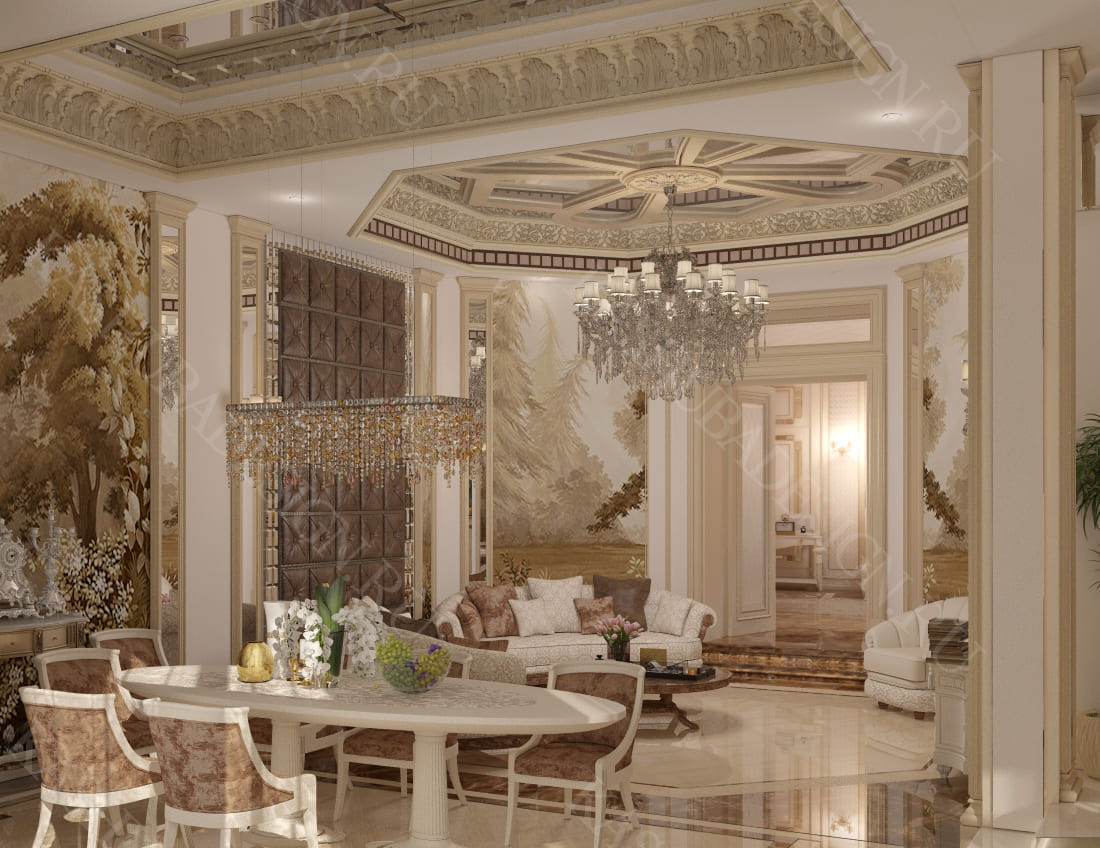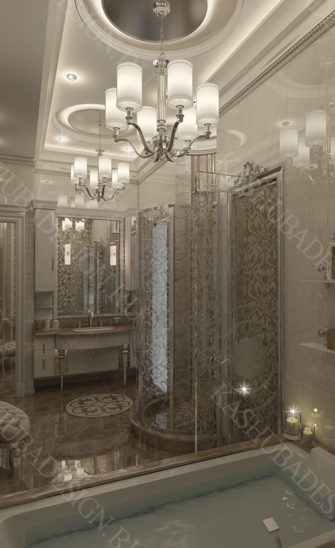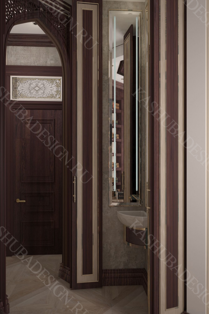 Из проекта квартиры в центре Москвы представляем: входную зону, гостиную-столовую и кухню, выполненные в едином классическом стиле, с элементами ар-деко. Кабинет также выполнен в этом стиле, но с элементами восточного стиля. Проект объединяет в единое целое сложные творческие поиски, развивающие богатый внутренний мир заказчика. Цветовая гамма объекта светлая, бежевая, с небольшими акцентами темно-коричневого цвета в элементах потолка, пола и текстиле. Напольное покрытие - мрамор, со вставкой паркета в зоне гостиной. Для зрительного увеличения объема помещений, применены элементы из тонированного зеркала - зеркальные дверцы шкафа и потолок в прихожей, декоративное обрамление телевизора в гостиной, отделка стены на кухне. Высота потолков позволила использовать длинные и объёмные люстры, придающие интерьеру парадность. Освещение помещений осуществляется за счет большого светового витража в технике Тиффани на потолке, люстры, и двух бра. Почти вдоль всех стен расположены шкафы из темного дерева для хранения книг, а возле окна расположен небольшой кожаный диван. Внутренние взаимосвязи предметов усиливают здоровый эффект красоты, комфорта и безопасности эксклюзивных интерьеров. Будет важна их ясная зрительская узнаваемость и запоминаемость.