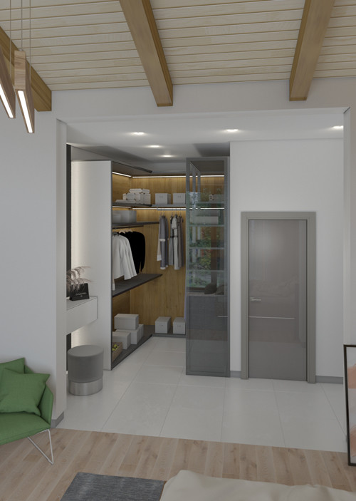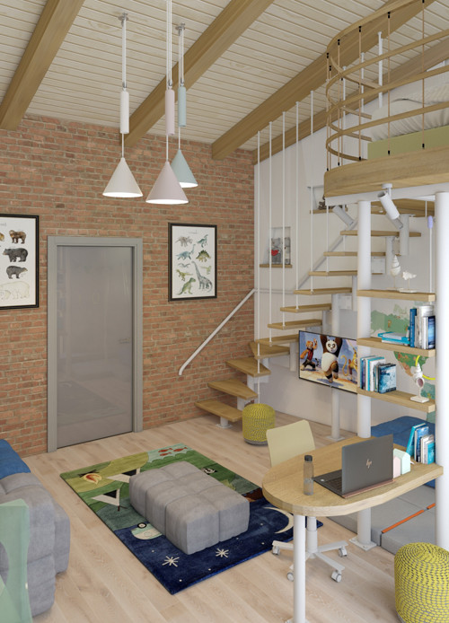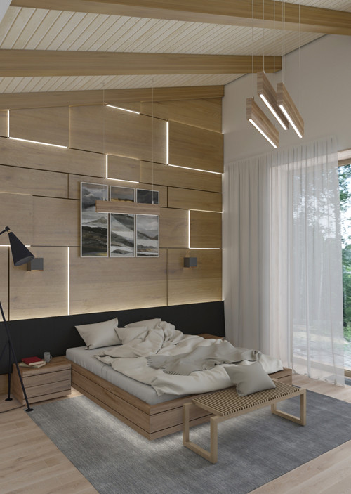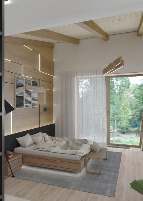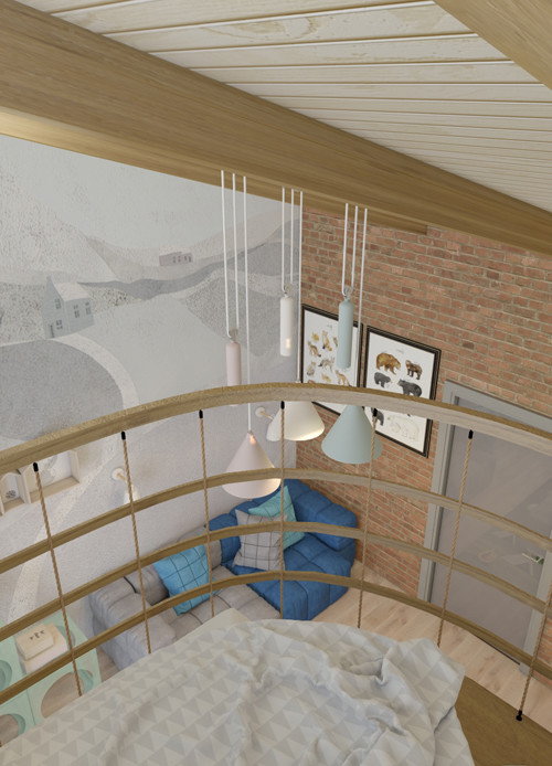 Дизайнеры бюро «KASHUBA DESIGN» разработали спальную зону дома (хозяйская спальня, детская и 2 гостевых спальни). В отделке помещений преобладают натуральные материалы: дерево, кирпич, покраска стен, в детской обои с интересным дизайном. Во всех помещениях находящихся под крышей несущей конструкции из клееного бруса являются не декоративными, а реальными конструктивными элементами здания, появляясь в интерьере они создают характерный для этого здания элемент интерьера. В детской разработали двухуровневое пространство для ребенка, с декоративной лестницей: кровать разместили на верхней антресоли, внизу расположился игровой уголок, рабочая зона и зона отдыха. Хозяйскую спальню сделали максимально открытой, объединив с гардеробной. По цветам в отделке помещений преобладают светлые тона, что делает пространство светлым и объемным. Во всех помещениях есть своя неповторяемая «изюминка»: необычно оформленная стена, интересные светильники, не обычной формы потолки, подсветки, столярные панели с подсветкой и т.д., что также характерно для стиля Лофт.