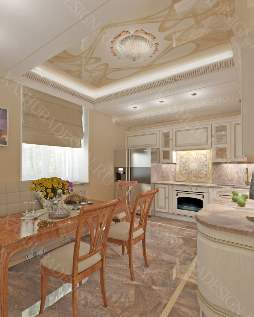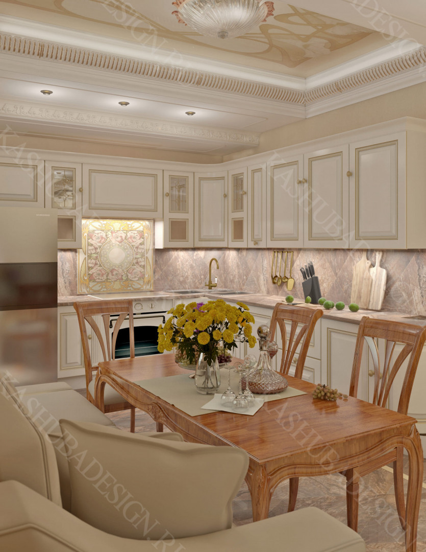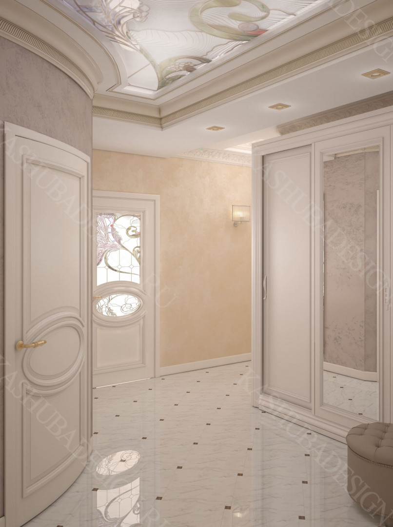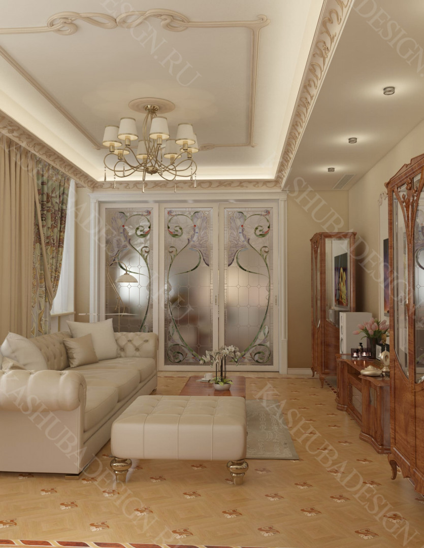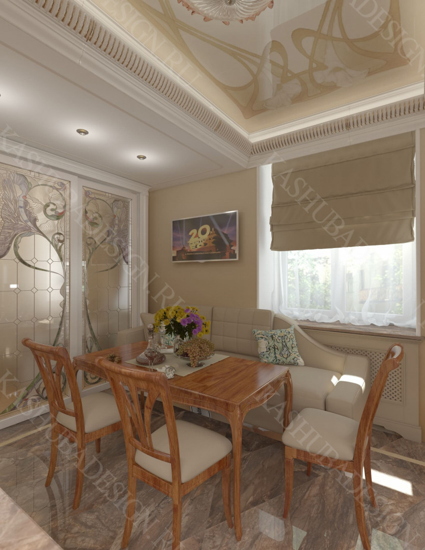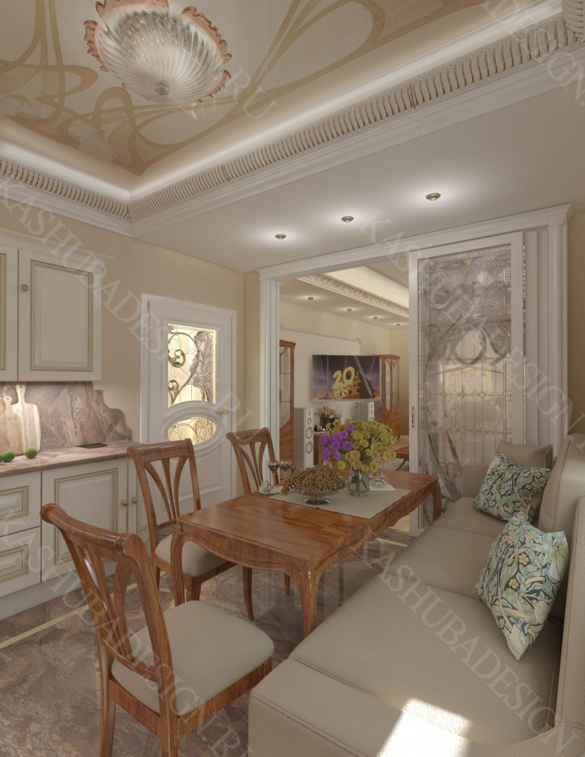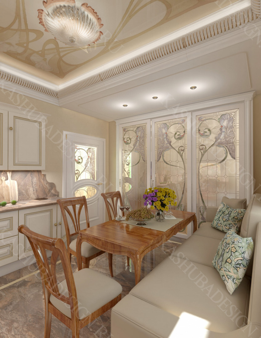 Как заявила одна заказчица: «Высокохудожественный дизайн интерьера от Вашего бюро – это аккумулятор красивой энергии, и каждый созданный Вами эксклюзивный объект, заряженная батарея комфорта и безопасности, всегда готовая к подключению. Силовое поле комфортного интерьера – произведения искусства, даёт прилив сил каждому». Сказанное можно отнести к квартире общей площадью 118 м2, расположенной на 1 этаже многоквартирного дома. Она состоит из входной зоны со шкафом, кухни, отделённой от гостиной трехстворчатыми раздвижными дверями с витражами. Выделена детская спальня и небольшая гардеробная, гостевой санузел отделён от постирочной раскладной дверью. Блок молодых хозяев - спальня и большой санузел с ванной (гидромассажем), просторной гардеробной с окном. Потолки оформлены росписями и гипсовой лепниной с элементами орнаментов ар-нуво, на полу лежит паркет и керамогранит, в хозяйском санузле мозаика. На стенах декоративная штукатурка, обои, панно из гипсовой лепнины. В гостиной расположен электрокамин в мраморном портале. Значительное внимание уделено световому и цветовому комфорту, освещению помещений, т.к. перед домом много деревьев загораживающих солнечный свет. Двери с витражами и окно в санузле с витражом, способствуют увеличению потока естественного освещения. Использованы энергоэффективные светодиодные закарнизные подсветки, потолочные витражи, точечные светильники и люстры. Для того, чтобы с улицы не было видно интерьеров квартиры, в окнах применены стекла со специальном покрытием.