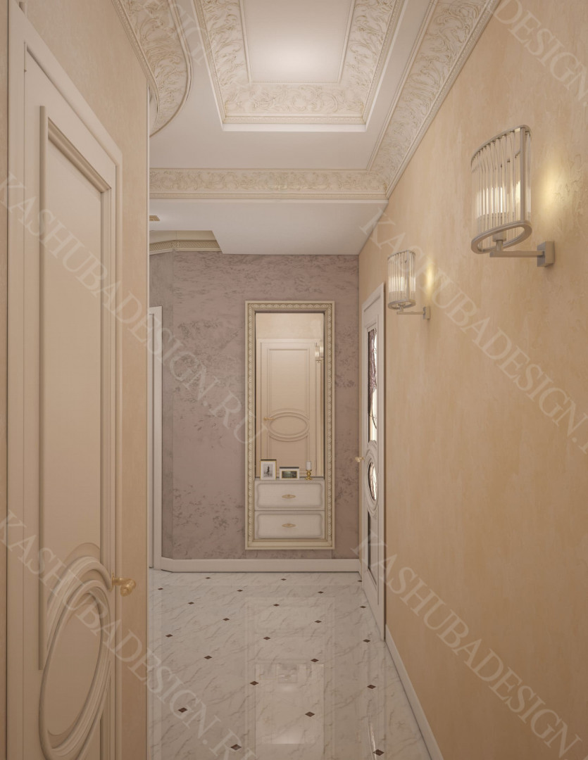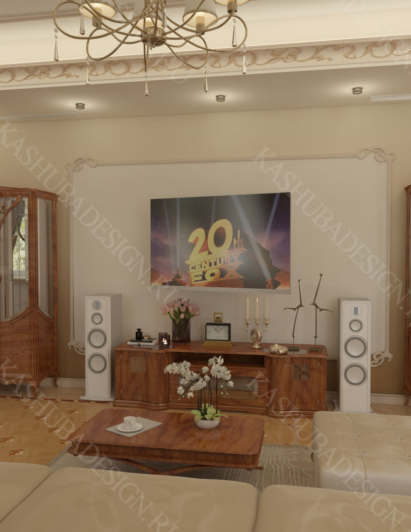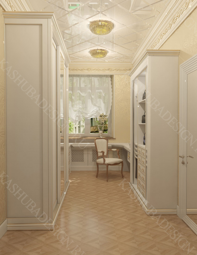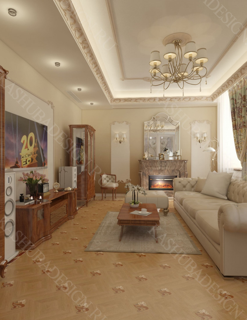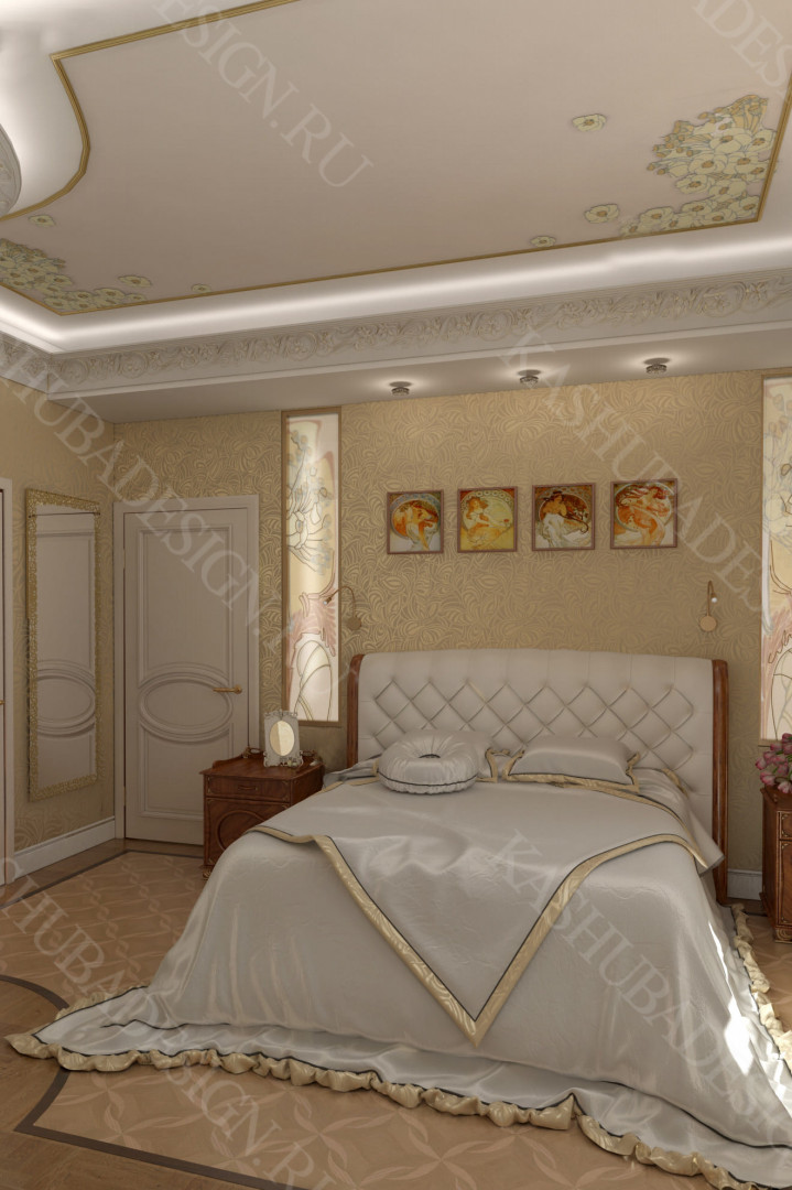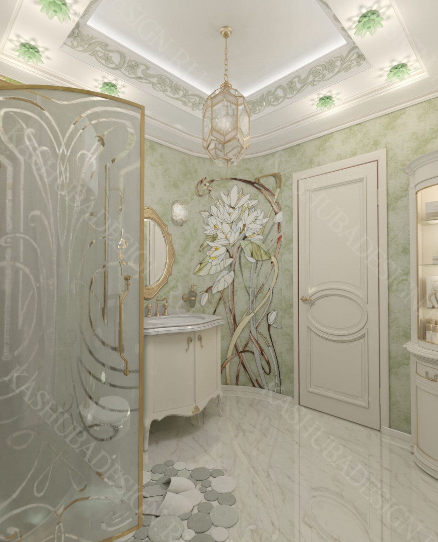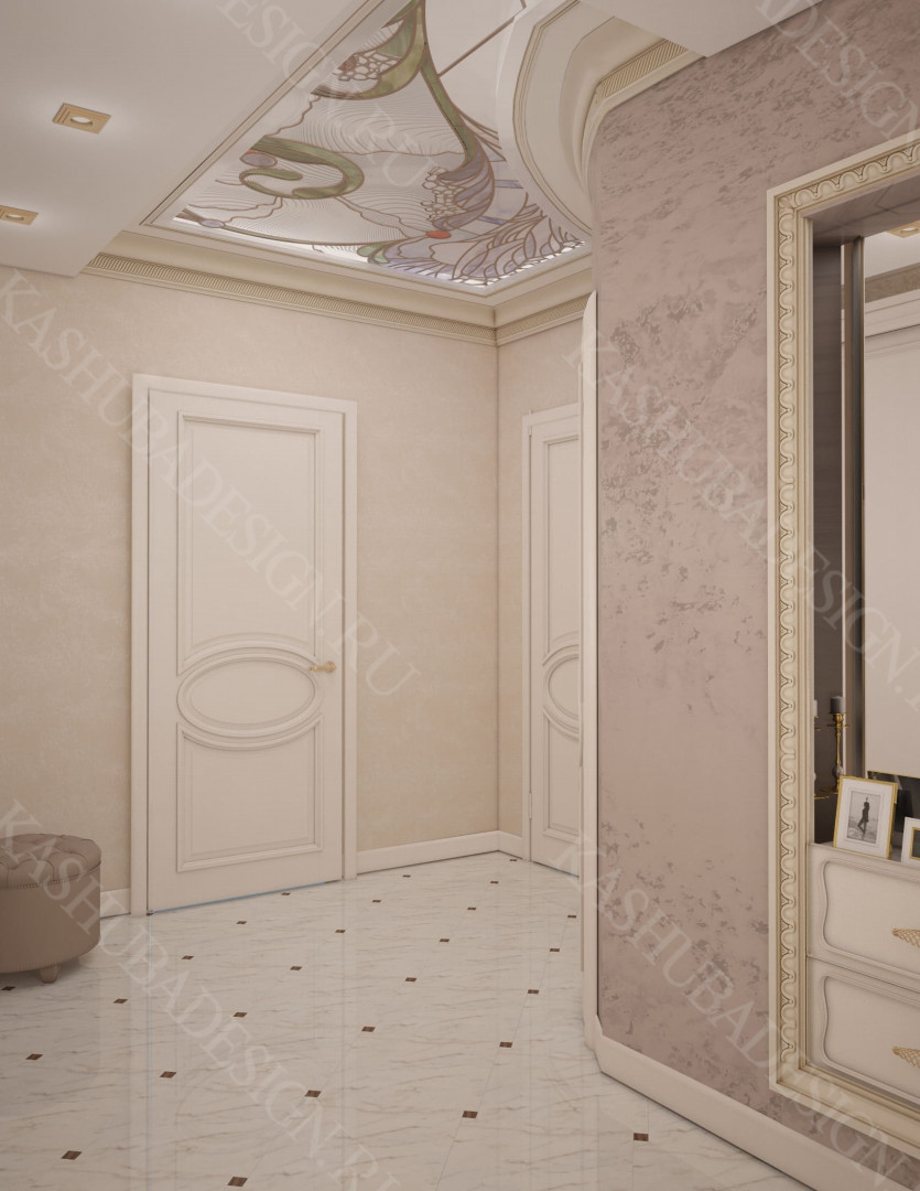 Как заявила одна заказчица: «Высокохудожественный дизайн интерьера от Вашего бюро – это аккумулятор красивой энергии, и каждый созданный Вами эксклюзивный объект, заряженная батарея комфорта и безопасности, всегда готовая к подключению. Силовое поле комфортного интерьера – произведения искусства, даёт прилив сил каждому». Сказанное можно отнести к квартире общей площадью 118 м2, расположенной на 1 этаже многоквартирного дома. Она состоит из входной зоны со шкафом, кухни, отделённой от гостиной трехстворчатыми раздвижными дверями с витражами. Выделена детская спальня и небольшая гардеробная, гостевой санузел отделён от постирочной раскладной дверью. Блок молодых хозяев - спальня и большой санузел с ванной (гидромассажем), просторной гардеробной с окном. Потолки оформлены росписями и гипсовой лепниной с элементами орнаментов ар-нуво, на полу лежит паркет и керамогранит, в хозяйском санузле мозаика. На стенах декоративная штукатурка, обои, панно из гипсовой лепнины. В гостиной расположен электрокамин в мраморном портале. Значительное внимание уделено световому и цветовому комфорту, освещению помещений, т.к. перед домом много деревьев загораживающих солнечный свет. Двери с витражами и окно в санузле с витражом, способствуют увеличению потока естественного освещения. Использованы энергоэффективные светодиодные закарнизные подсветки, потолочные витражи, точечные светильники и люстры. Для того, чтобы с улицы не было видно интерьеров квартиры, в окнах применены стекла со специальном покрытием.