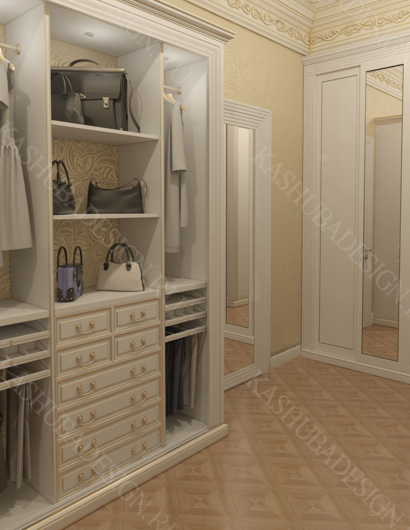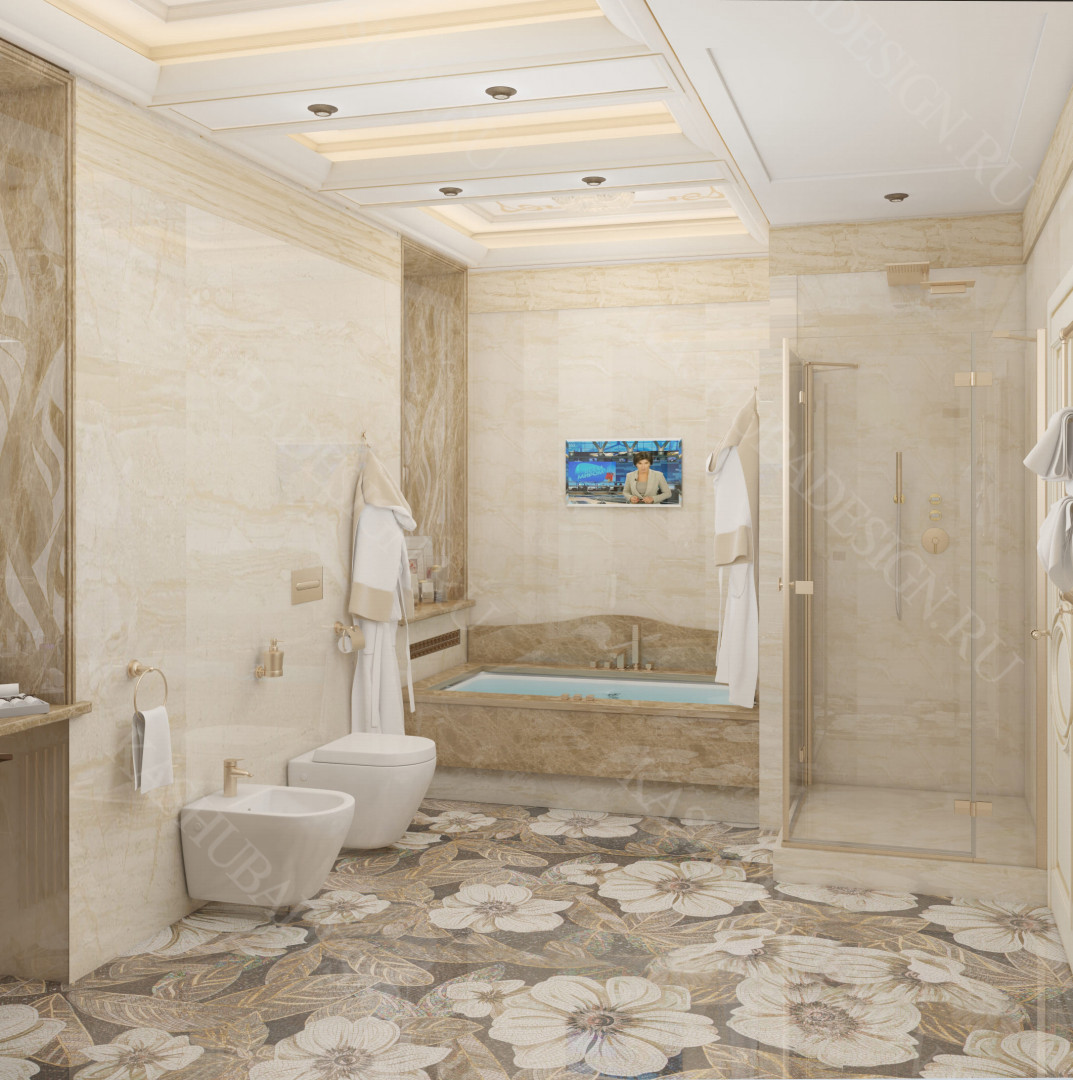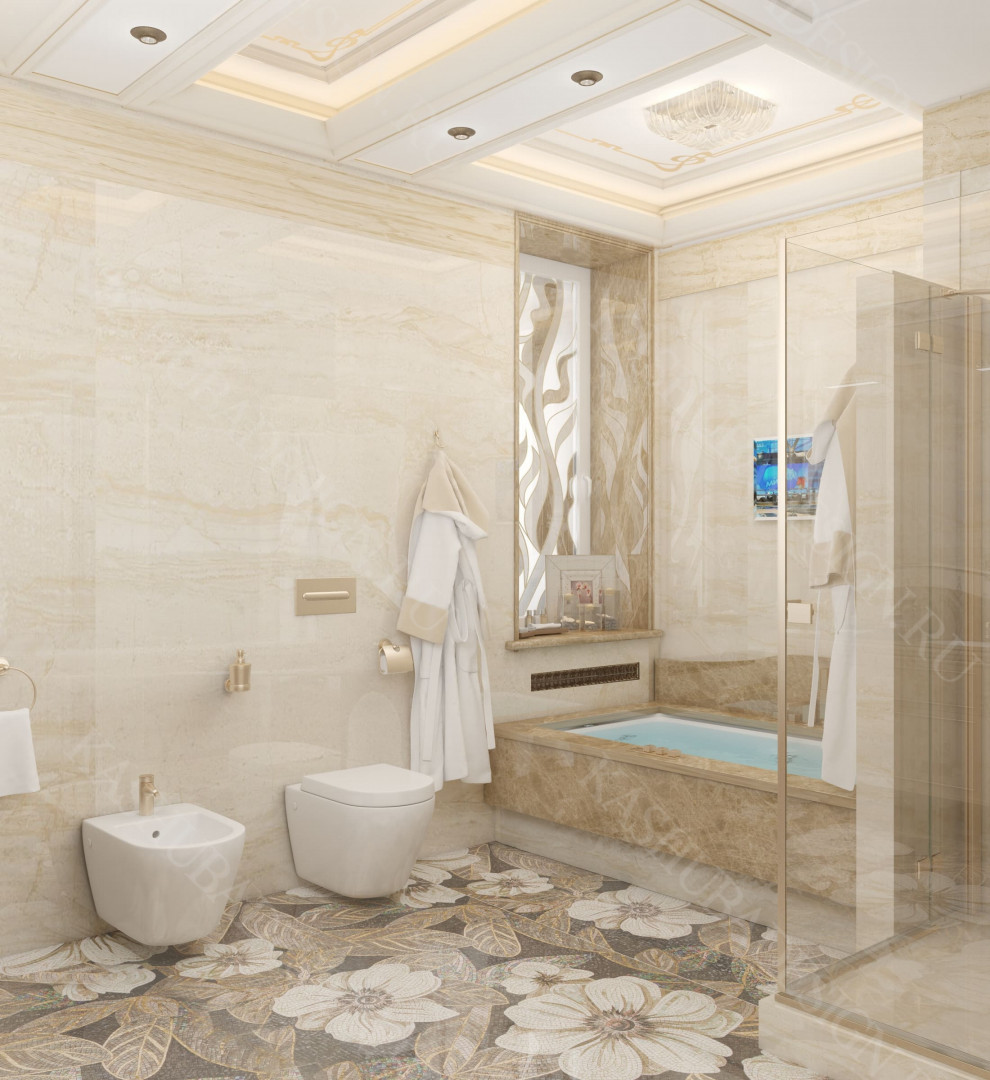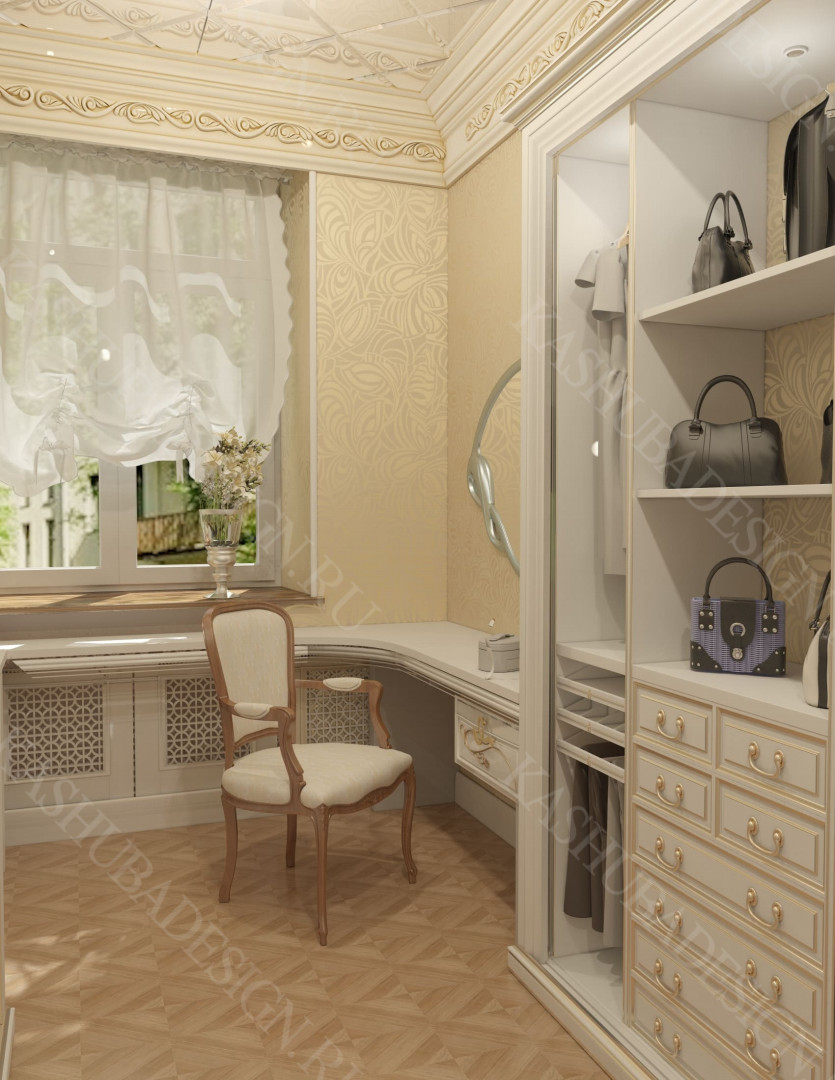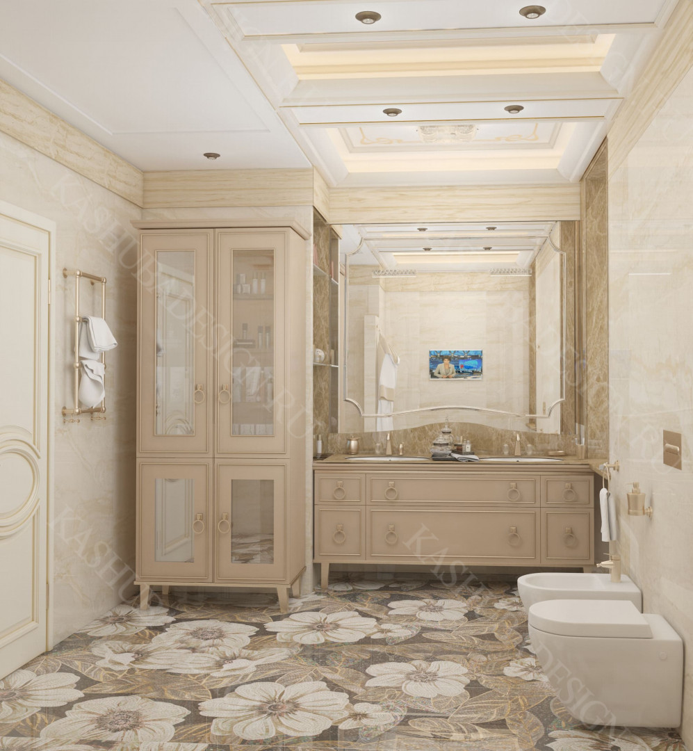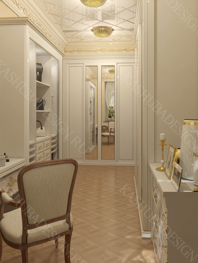 Как заявила одна заказчица: «Высокохудожественный дизайн интерьера от Вашего бюро – это аккумулятор красивой энергии, и каждый созданный Вами эксклюзивный объект, заряженная батарея комфорта и безопасности, всегда готовая к подключению. Силовое поле комфортного интерьера – произведения искусства, даёт прилив сил каждому». Сказанное можно отнести к квартире общей площадью 118 м2, расположенной на 1 этаже многоквартирного дома. Она состоит из входной зоны со шкафом, кухни, отделённой от гостиной трехстворчатыми раздвижными дверями с витражами. Выделена детская спальня и небольшая гардеробная, гостевой санузел отделён от постирочной раскладной дверью. Блок молодых хозяев - спальня и большой санузел с ванной (гидромассажем), просторной гардеробной с окном. Потолки оформлены росписями и гипсовой лепниной с элементами орнаментов ар-нуво, на полу лежит паркет и керамогранит, в хозяйском санузле мозаика. На стенах декоративная штукатурка, обои, панно из гипсовой лепнины. В гостиной расположен электрокамин в мраморном портале. Значительное внимание уделено световому и цветовому комфорту, освещению помещений, т.к. перед домом много деревьев загораживающих солнечный свет. Двери с витражами и окно в санузле с витражом, способствуют увеличению потока естественного освещения. Использованы энергоэффективные светодиодные закарнизные подсветки, потолочные витражи, точечные светильники и люстры. Для того, чтобы с улицы не было видно интерьеров квартиры, в окнах применены стекла со специальном покрытием.