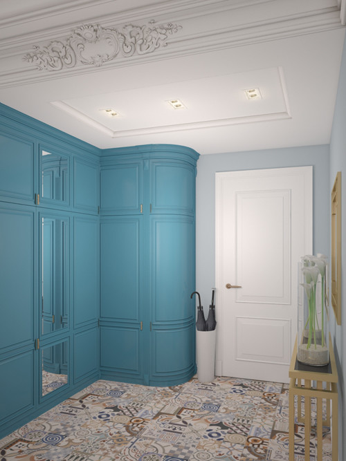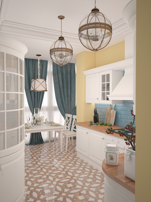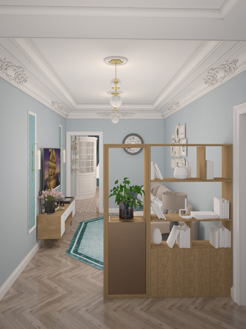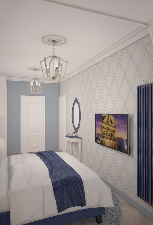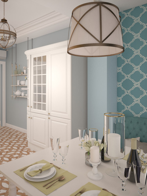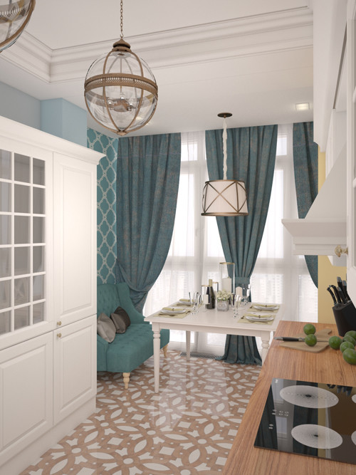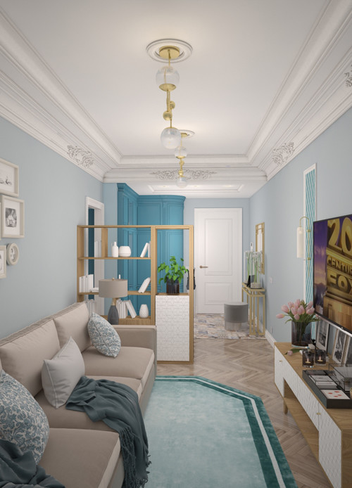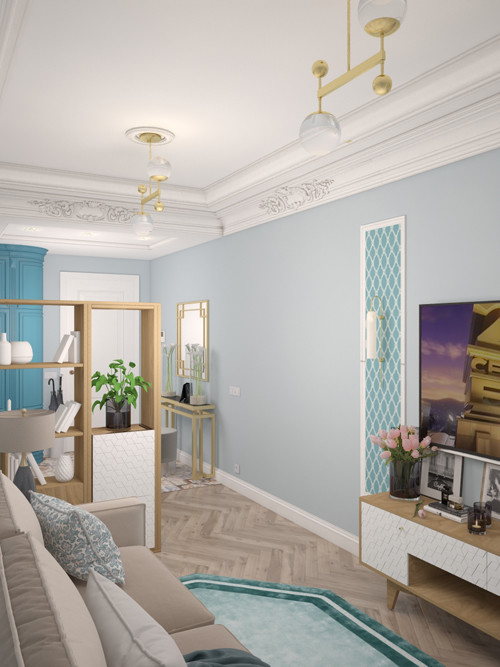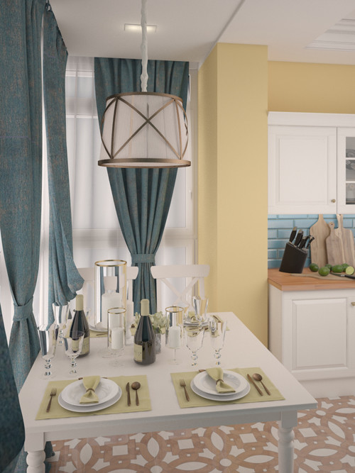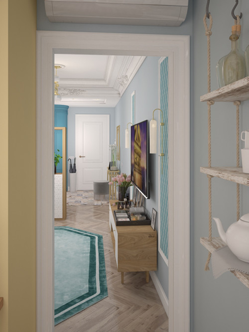 Для квартиры выбрана смелая цветовая гамма (оттенки желтого, синего), при этом смотрится гармонично и уютно. В интерьере отлично сочетаются современные решения с «винтажными» предметами: использованы мебель и предметы декора стилизованные под 60 – ые. Значимую роль в проекте уделили освещению –выбрали интересные и необычные осветительные приборы. Люстры однозначно смотрятся достаточно стильно и обыгрывают общую стилистическую задумку интерьера, создавая вокруг себя атмосферу тепла и уюта.