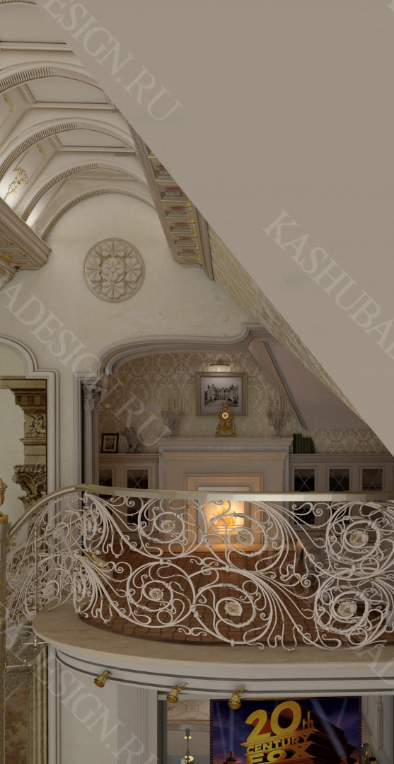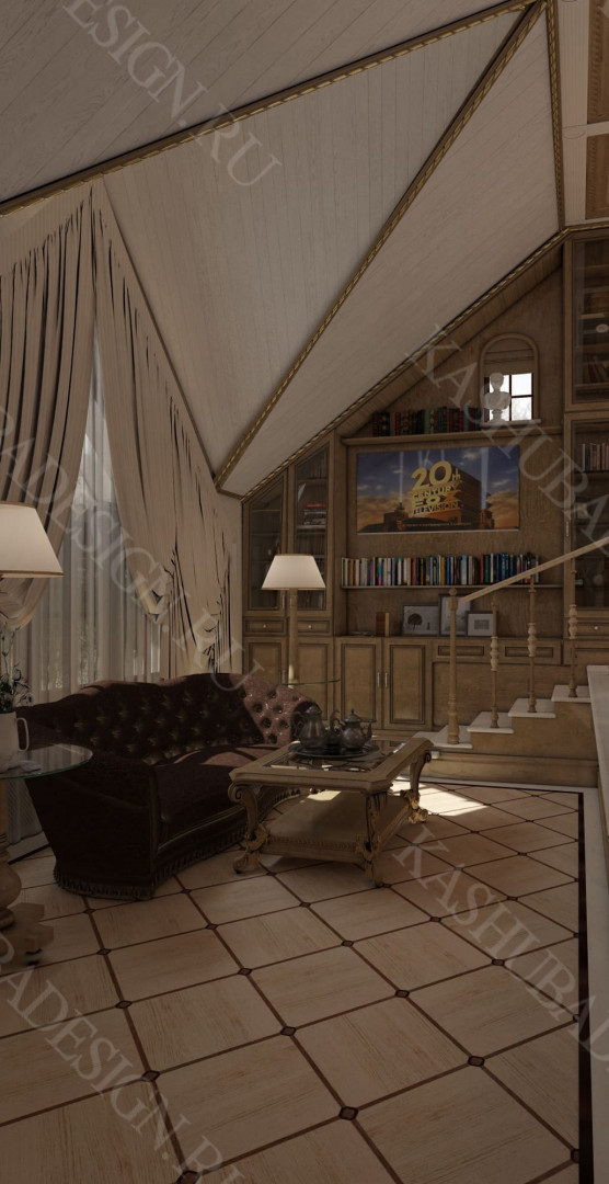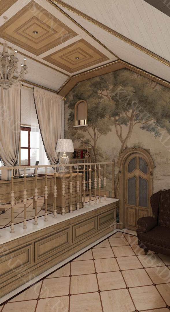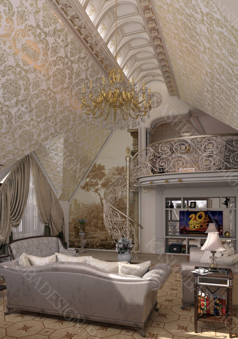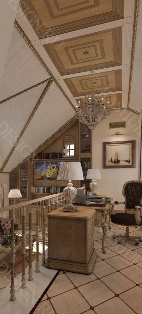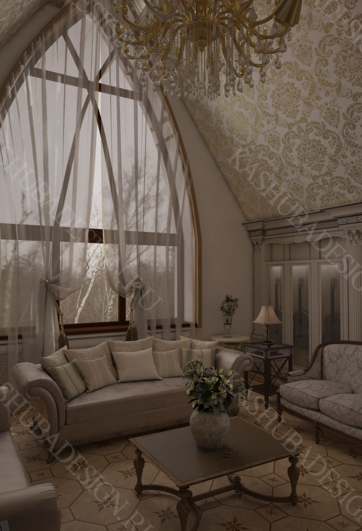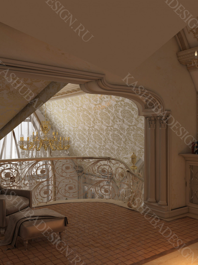 Комплекс помещений мансардного этажа для семейной пары в доме площадью 1700м2 : спальня, гостиная- кухня и санузел - выполнены в классическом стиле. Особенностью объекта являются высокие потолки со скатами крыши и большие стрельчатые окна в готическом стиле. Дизайнеры в полной мере использовали предоставленные им условия архитектуры. Таким образом в гостиной, совмещенной с кухней, появился потолок в столярном исполнении с щередующимися кессонами и балками. Балки завершаются кронштейнами и своей формой подчеркивают монументальность окна. Чтобы данная конструкция не утяжеляла потолок, все элементы покрыты ажурной резьбой с позолотой, создавая тем самым эффект кружева. Столярному потолку вторят и панели на стенах, которые своими пилястрами поддерживают ритм балок. Скаты крыши обтянуты шелковой тканью, что в свою очередь тоже придает помещению легкость.