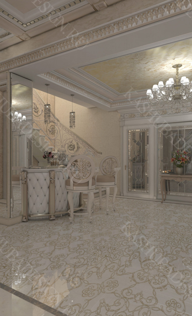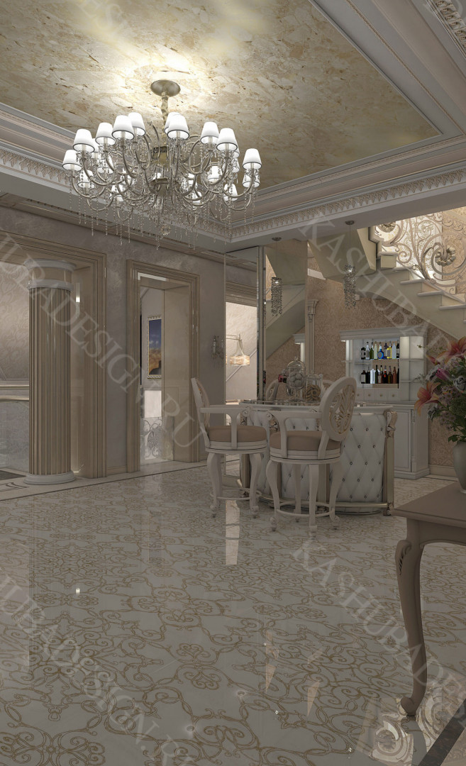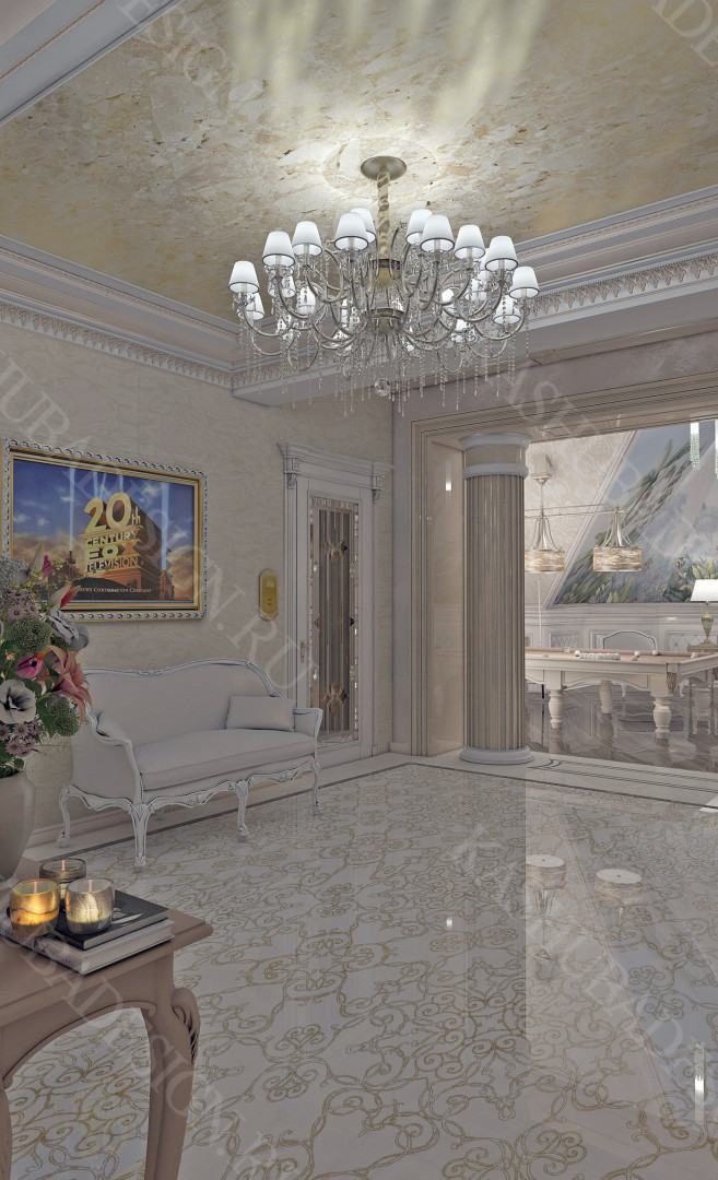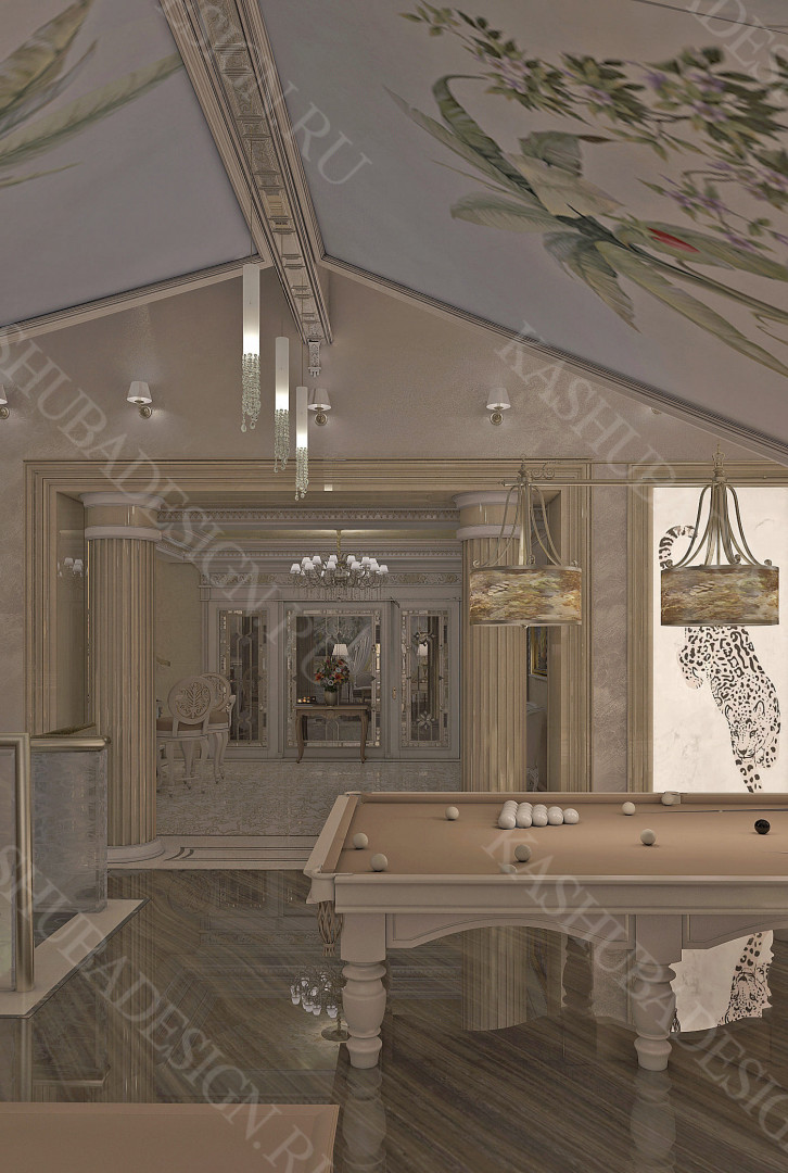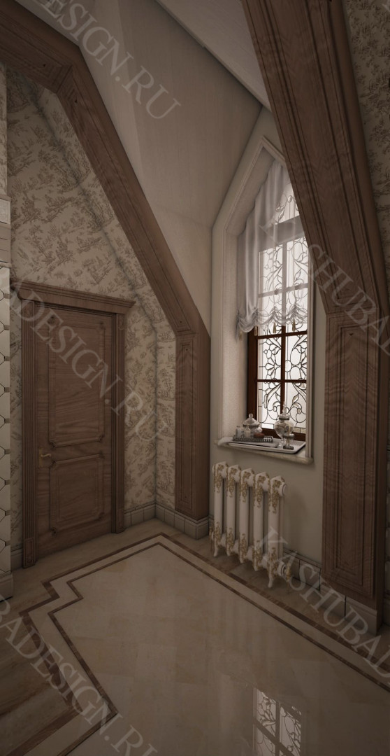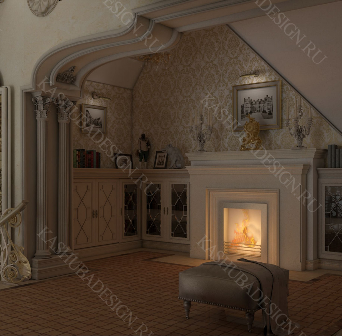 Комплекс помещений мансардного этажа для семейной пары в доме площадью 1700м2 : спальня, гостиная- кухня и санузел - выполнены в классическом стиле. Особенностью объекта являются высокие потолки со скатами крыши и большие стрельчатые окна в готическом стиле. Дизайнеры в полной мере использовали предоставленные им условия архитектуры. Таким образом в гостиной, совмещенной с кухней, появился потолок в столярном исполнении с щередующимися кессонами и балками. Балки завершаются кронштейнами и своей формой подчеркивают монументальность окна. Чтобы данная конструкция не утяжеляла потолок, все элементы покрыты ажурной резьбой с позолотой, создавая тем самым эффект кружева. Столярному потолку вторят и панели на стенах, которые своими пилястрами поддерживают ритм балок. Скаты крыши обтянуты шелковой тканью, что в свою очередь тоже придает помещению легкость.