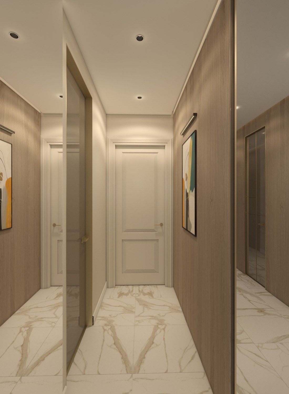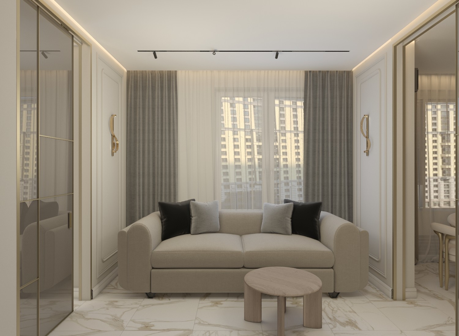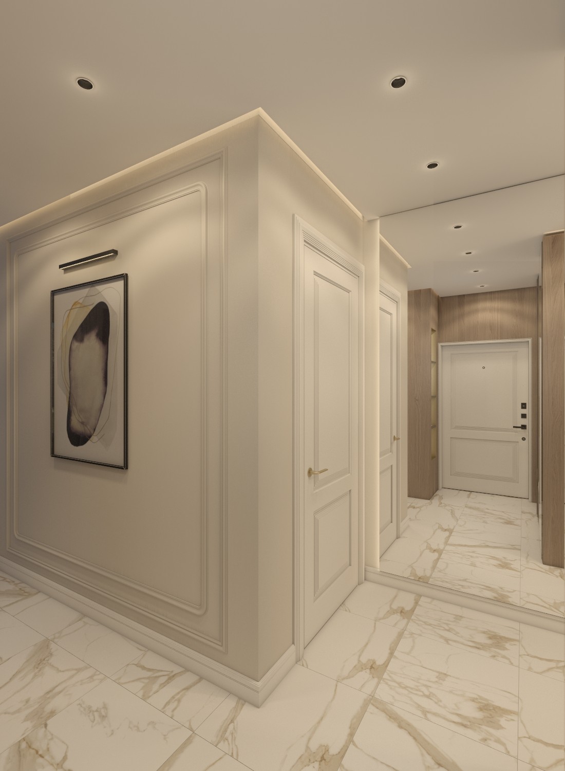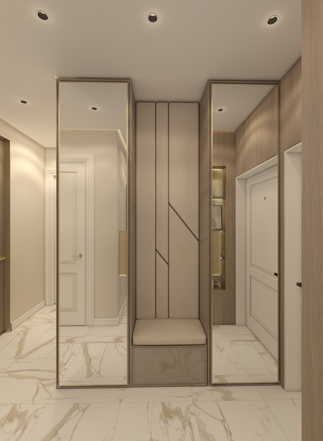 Дизайн квартиры в современном стиле с элементами легкой классики (неоклассика). Сдержанная роскошь и элегантная простота – так можно охарактеризовать интерьер квартиры. Интерьер гармоничный и уютный в бежевой гамме, наполненный динамикой, свежестью и оригинальностью. В отделке помещений преобладают натуральные материалы: шпонированные панели, гипсовая лепнина, керамогранит, латунные элементы, натуральные ткани. Много поверхностей с различными текстурами. В интерьере много зеркал, что придает объем квартире.