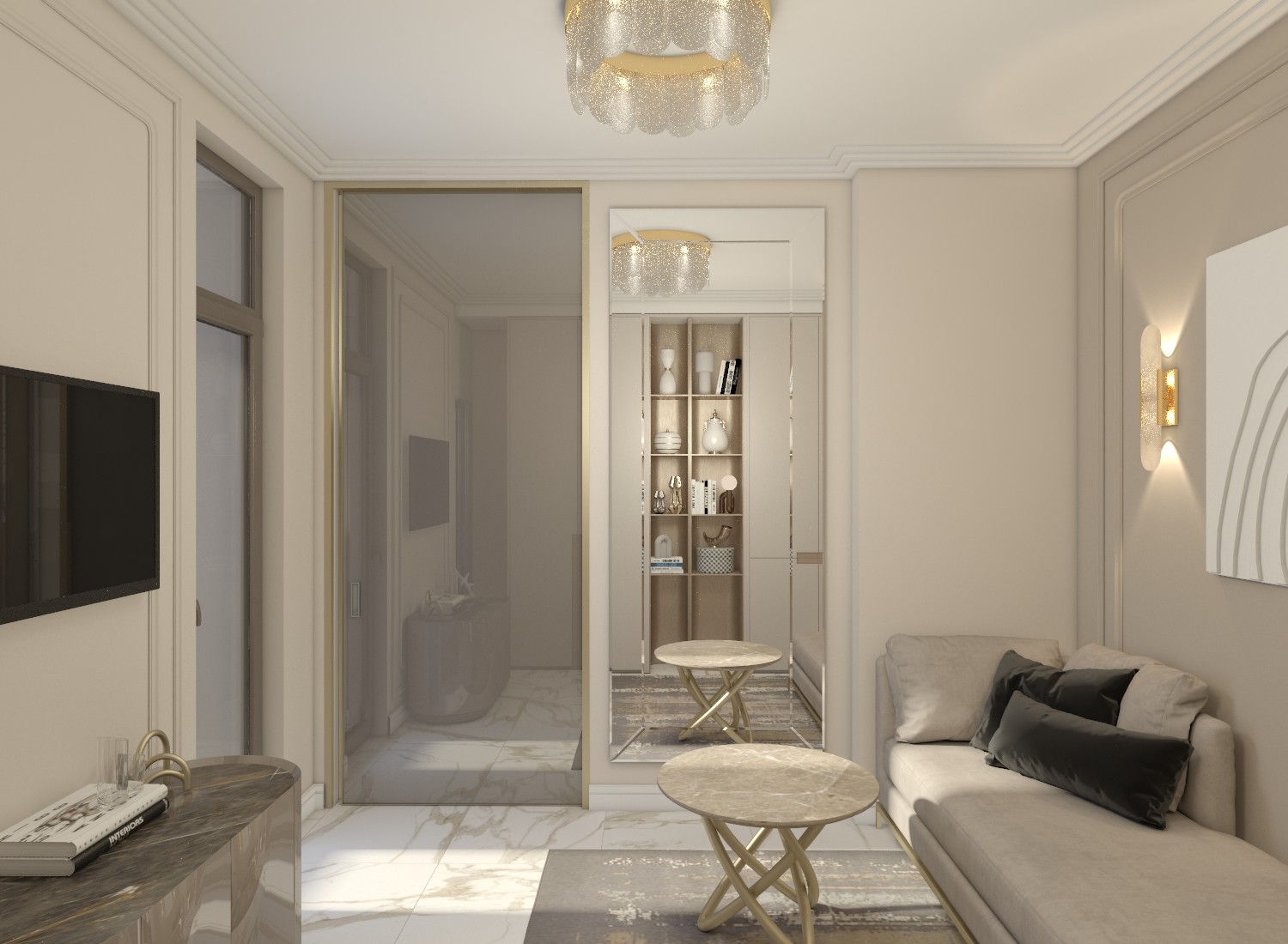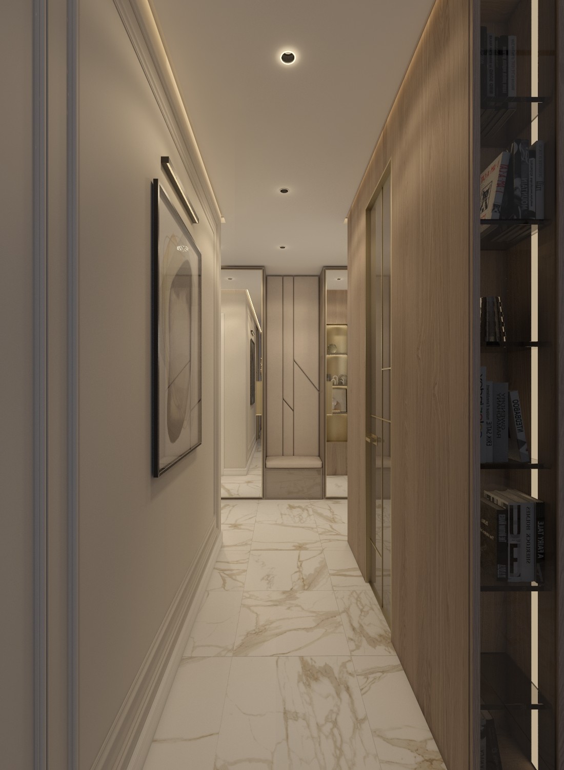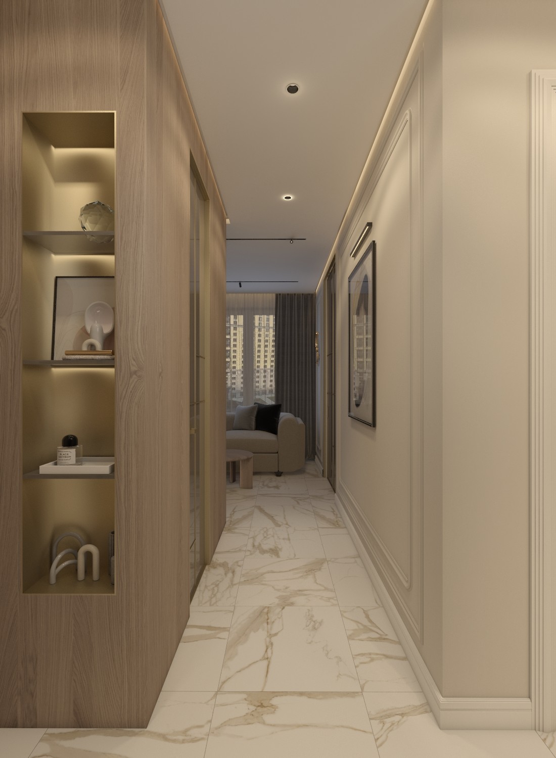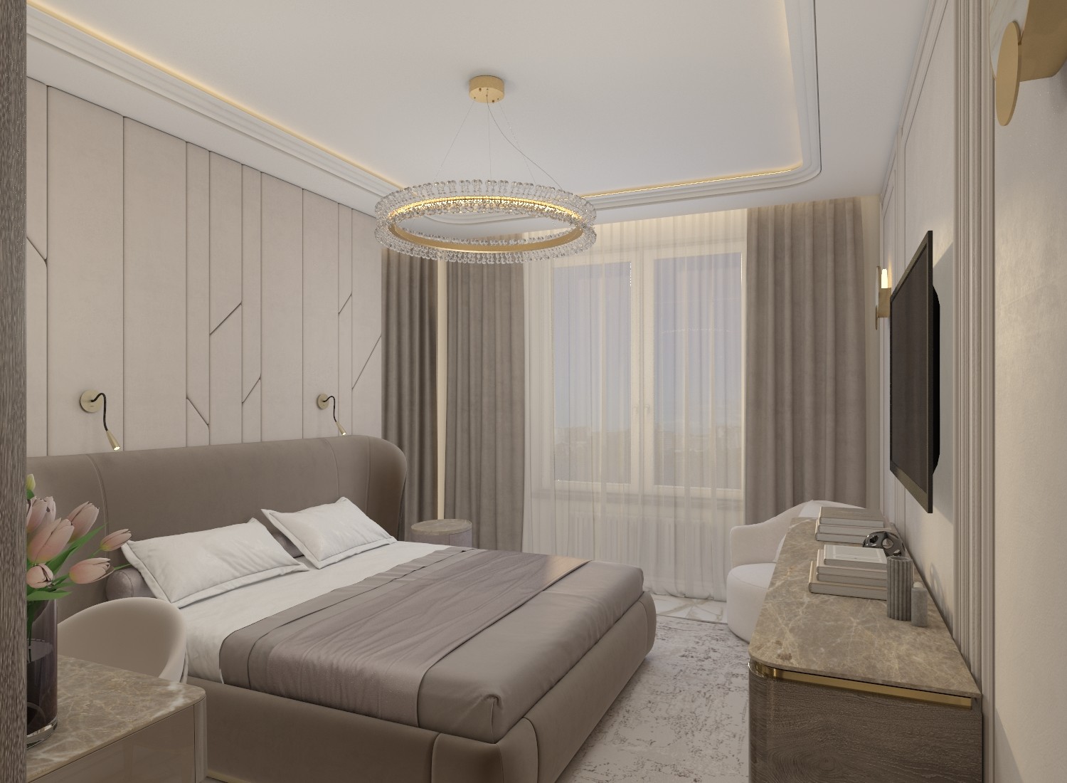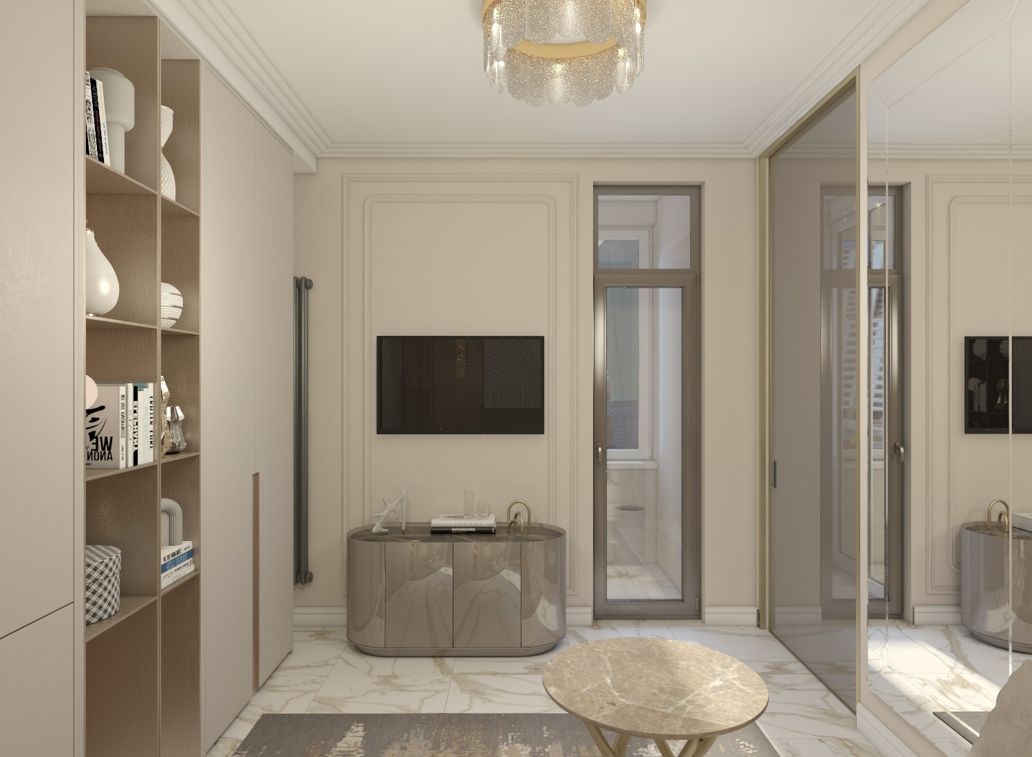Дизайн квартиры в современном стиле с элементами легкой классики (неоклассика). Сдержанная роскошь и элегантная простота – так можно охарактеризовать интерьер квартиры. Интерьер гармоничный и уютный в бежевой гамме, наполненный динамикой, свежестью и оригинальностью. В отделке помещений преобладают натуральные материалы: шпонированные панели, гипсовая лепнина, керамогранит, латунные элементы, натуральные ткани. Много поверхностей с различными текстурами. В интерьере много зеркал, что придает объем квартире.