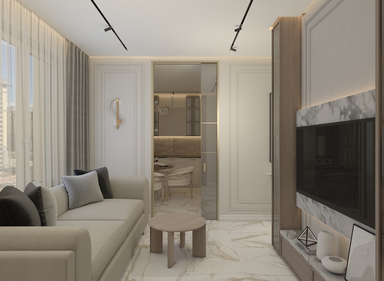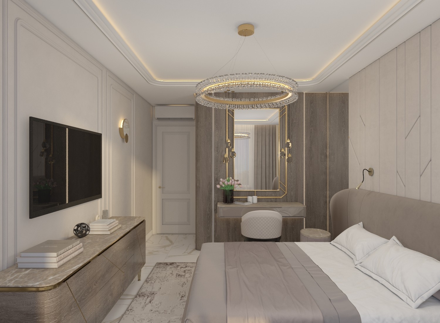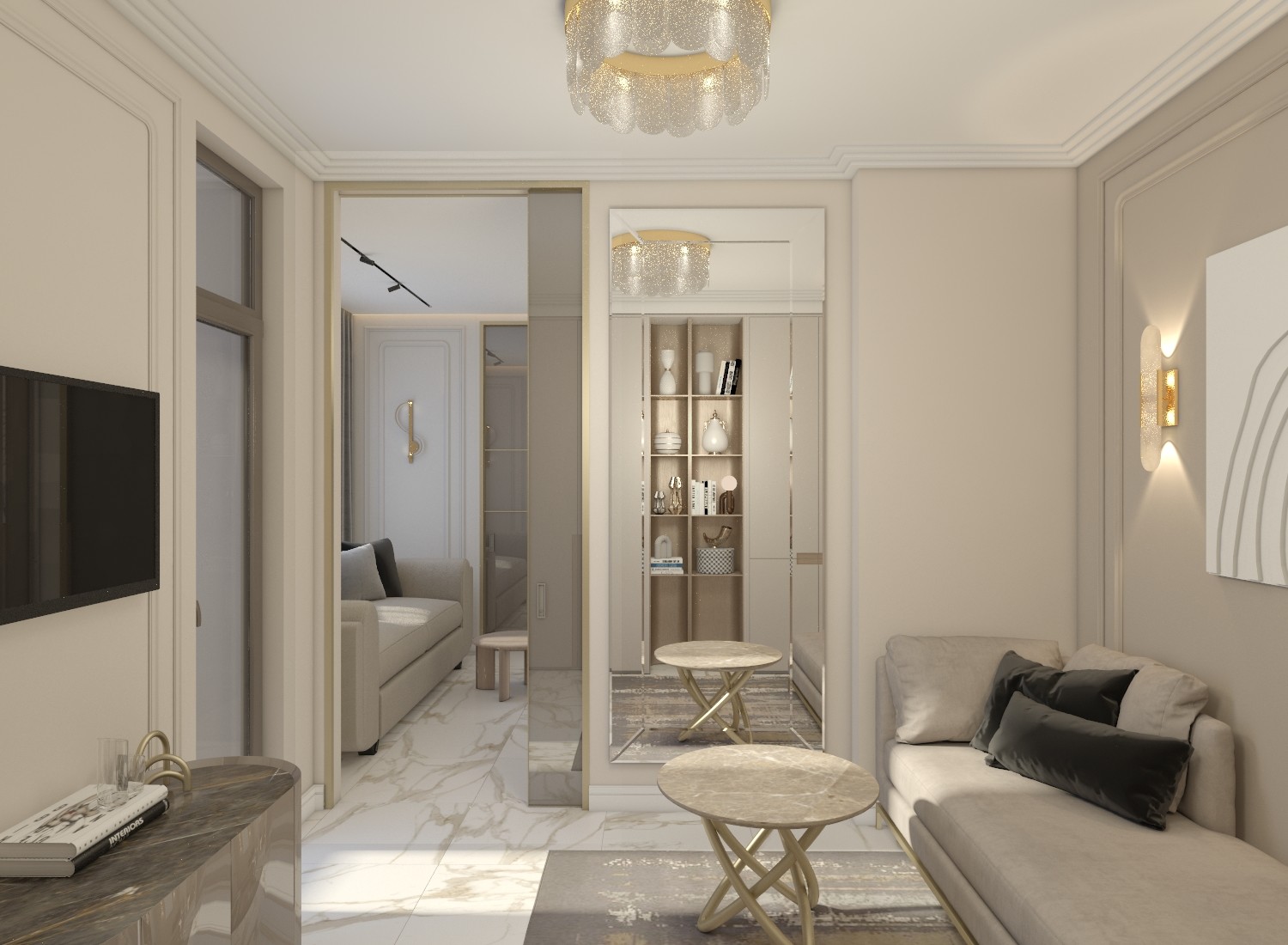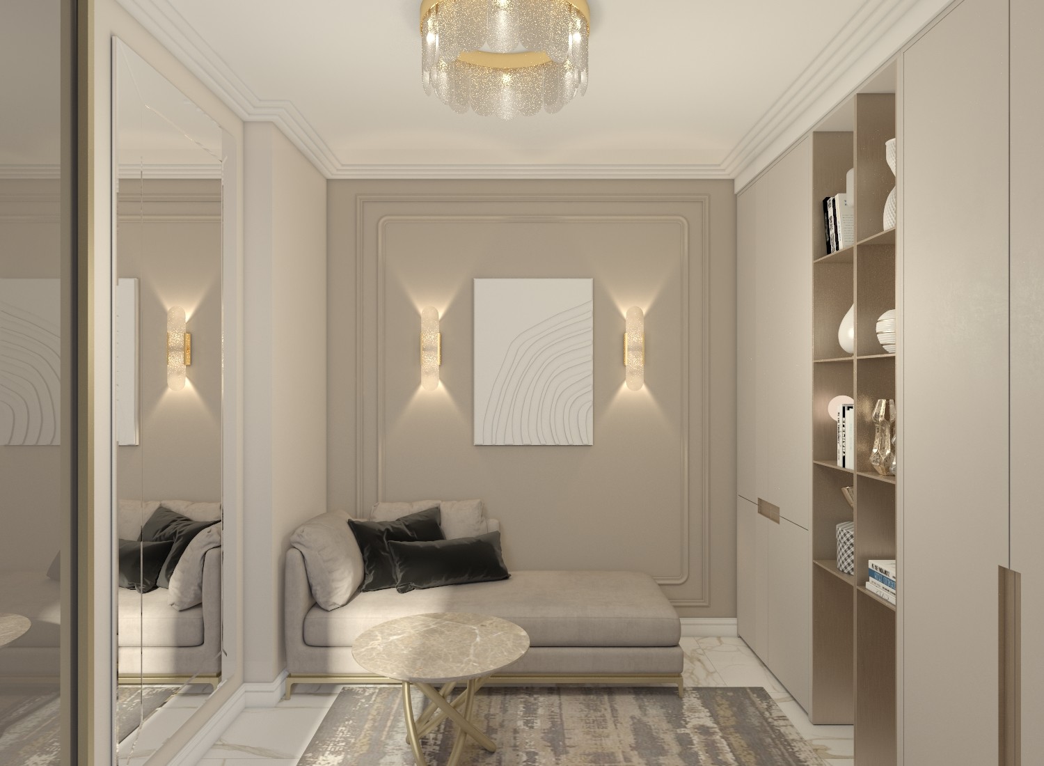Дизайн квартиры в современном стиле с элементами легкой классики (неоклассика). Сдержанная роскошь и элегантная простота – так можно охарактеризовать интерьер квартиры. Интерьер гармоничный и уютный в бежевой гамме, наполненный динамикой, свежестью и оригинальностью. В отделке помещений преобладают натуральные материалы: шпонированные панели, гипсовая лепнина, керамогранит, латунные элементы, натуральные ткани. Много поверхностей с различными текстурами. В интерьере много зеркал, что придает объем квартире.