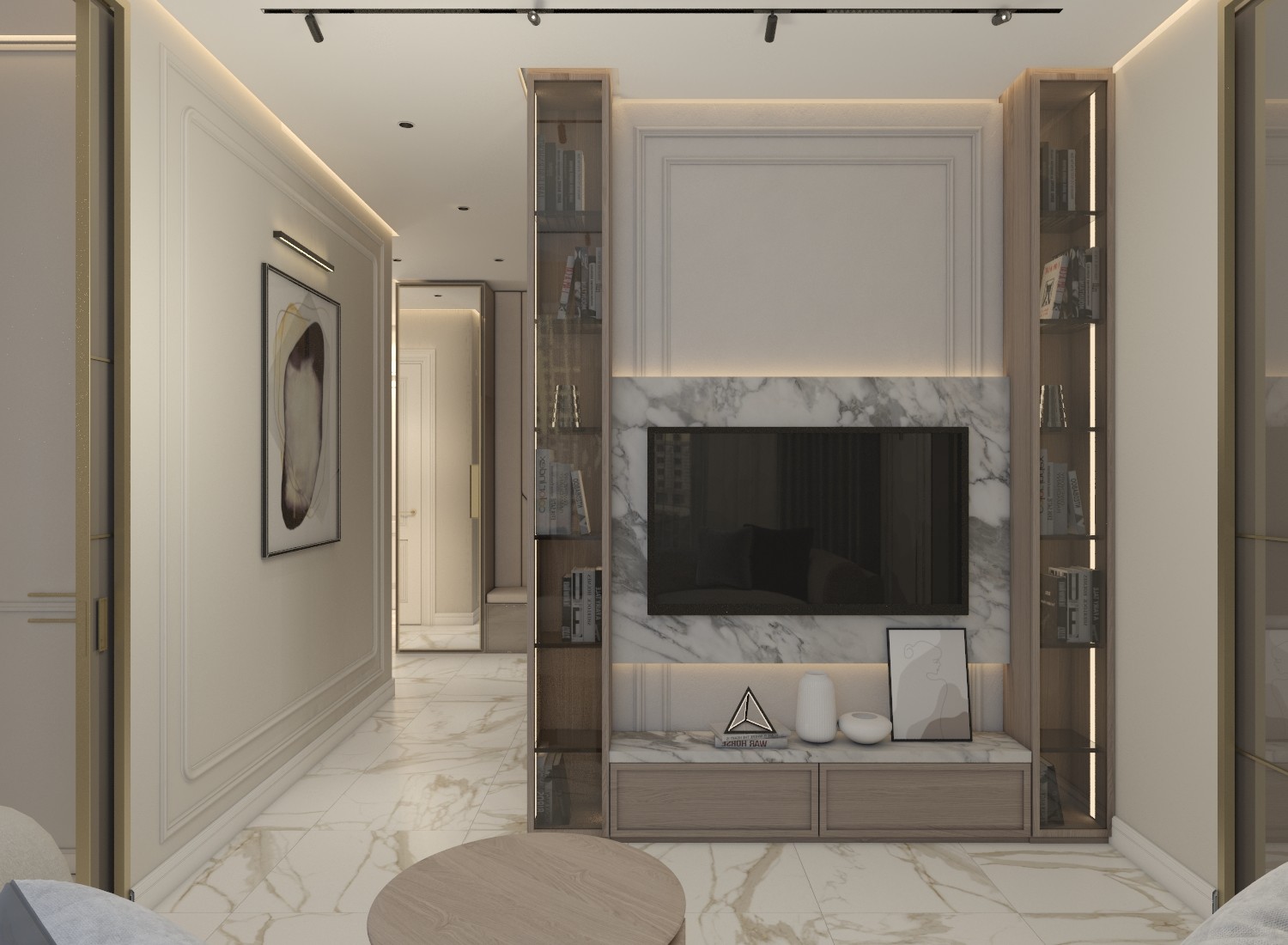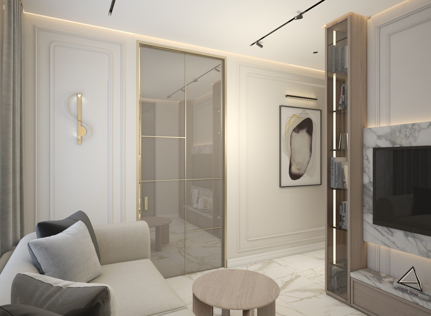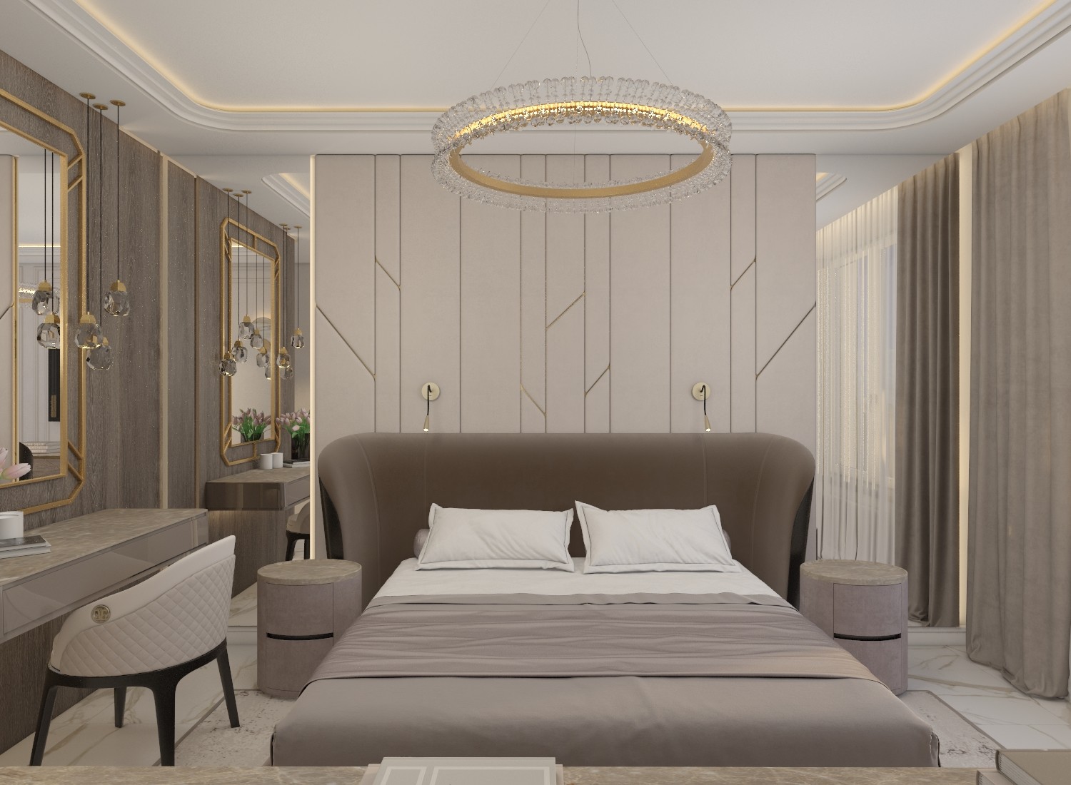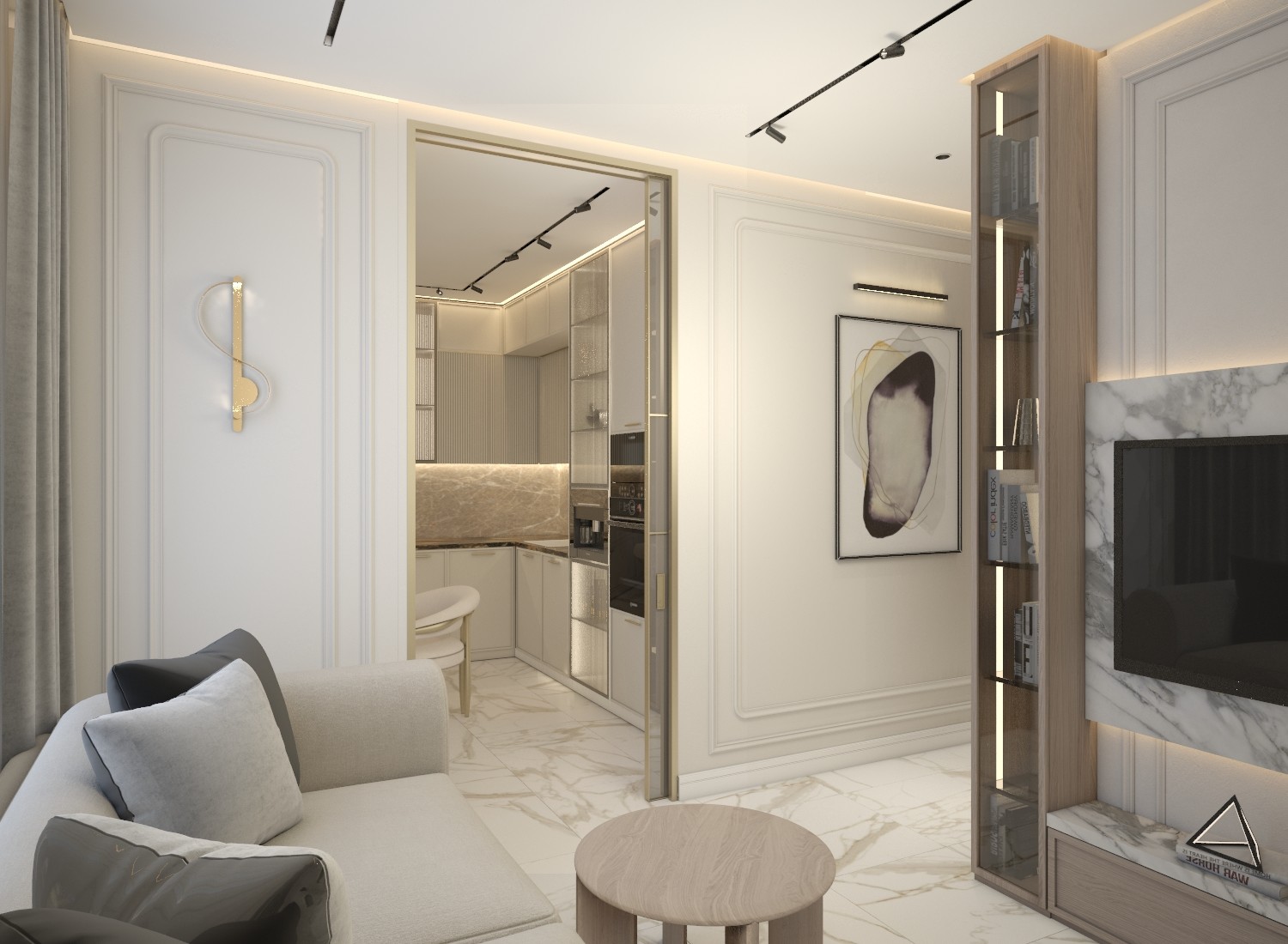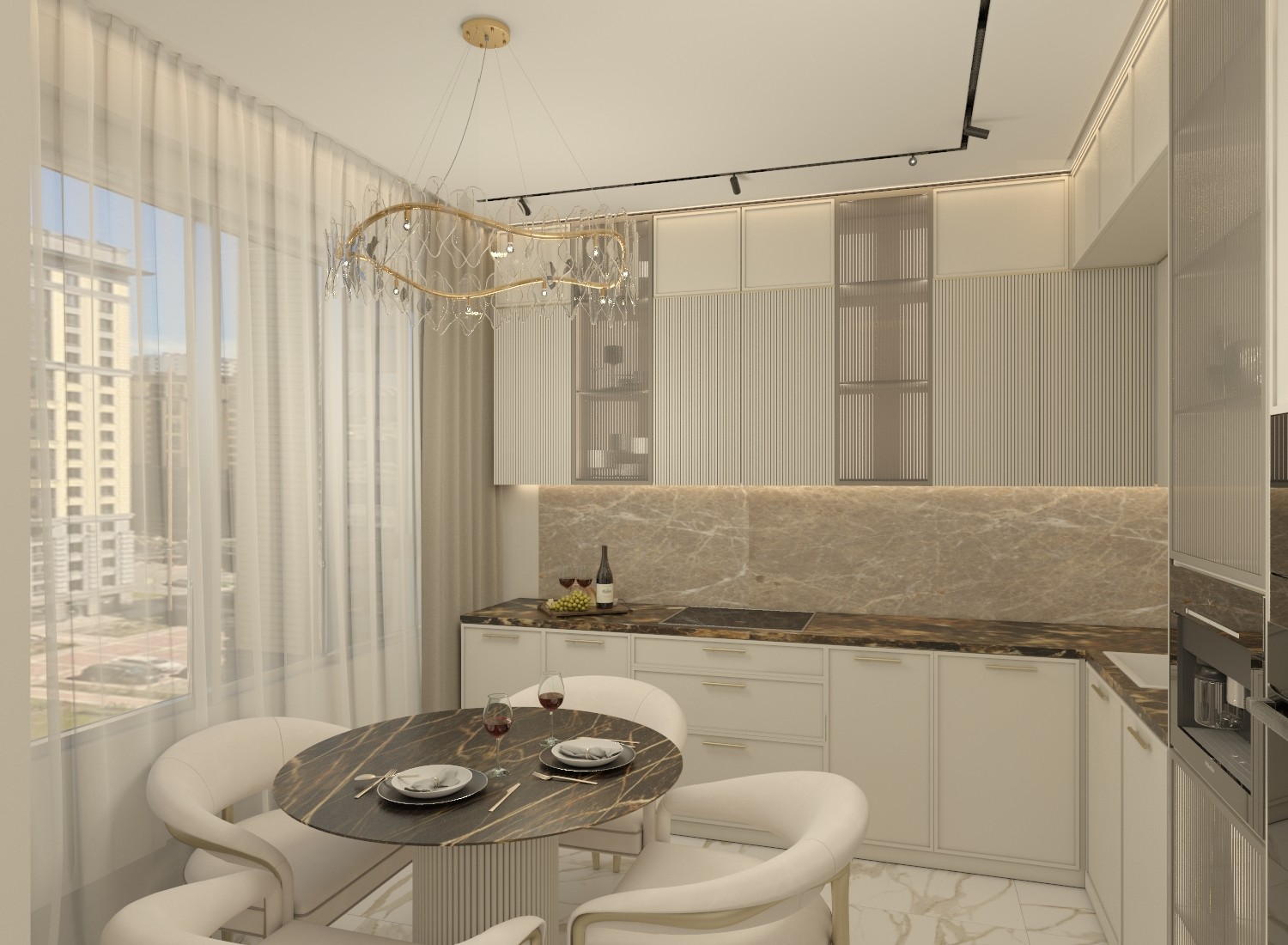 Дизайн квартиры в современном стиле с элементами легкой классики (неоклассика). Сдержанная роскошь и элегантная простота – так можно охарактеризовать интерьер квартиры. Интерьер гармоничный и уютный в бежевой гамме, наполненный динамикой, свежестью и оригинальностью. В отделке помещений преобладают натуральные материалы: шпонированные панели, гипсовая лепнина, керамогранит, латунные элементы, натуральные ткани. Много поверхностей с различными текстурами. В интерьере много зеркал, что придает объем квартире.