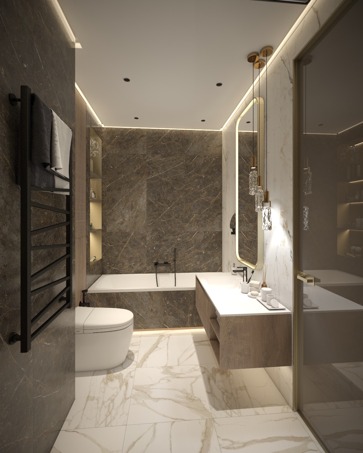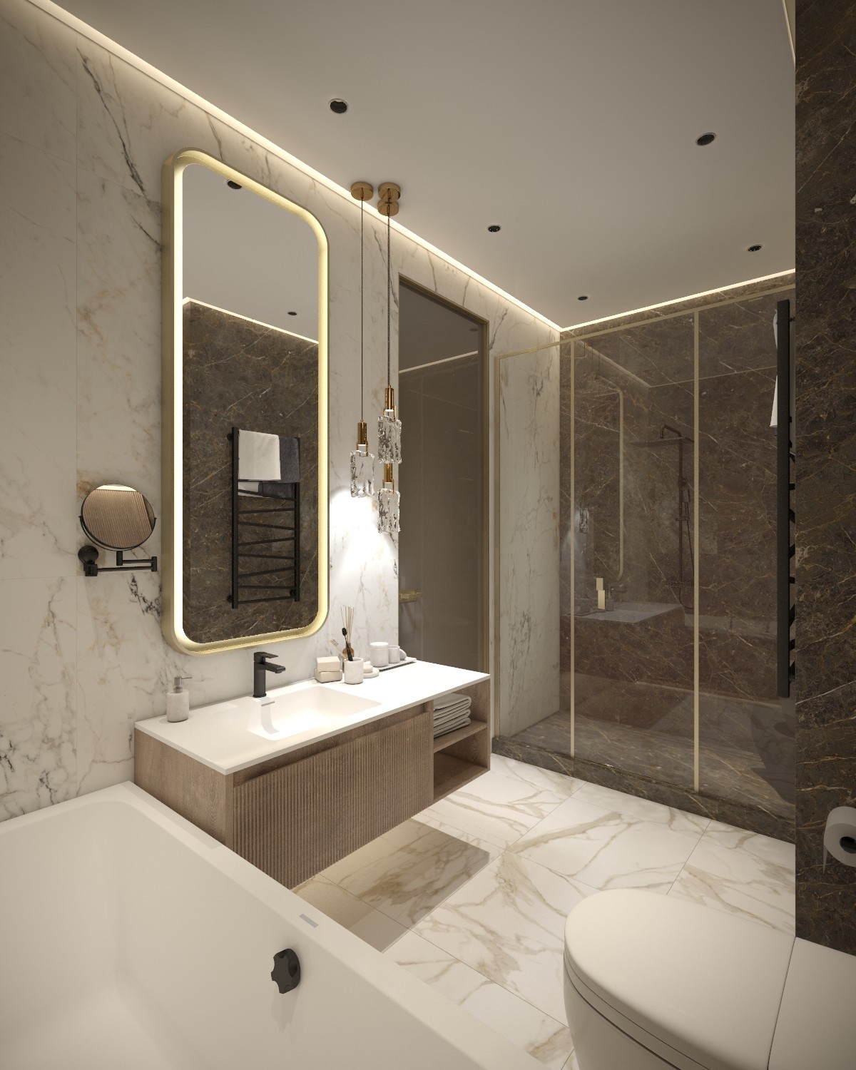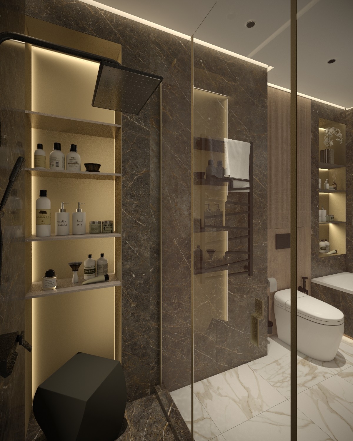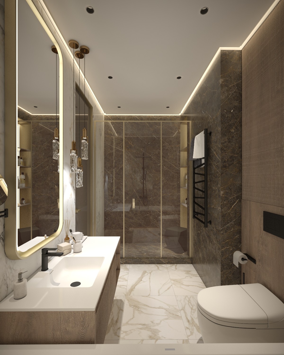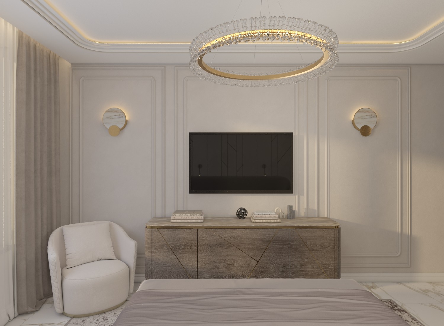 В интерьерах квартиры применяются различные типы освещения: натяжной парящий потолок с подсветкой по периметру, потолочные треки, встроенные светильники, подсветки картин, люстры, бра, подсветка штор, подсветка мебели, стеновых панелей. Для интерьеров подобраны интересные дизайнерские светильники.