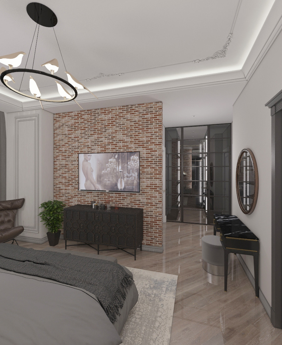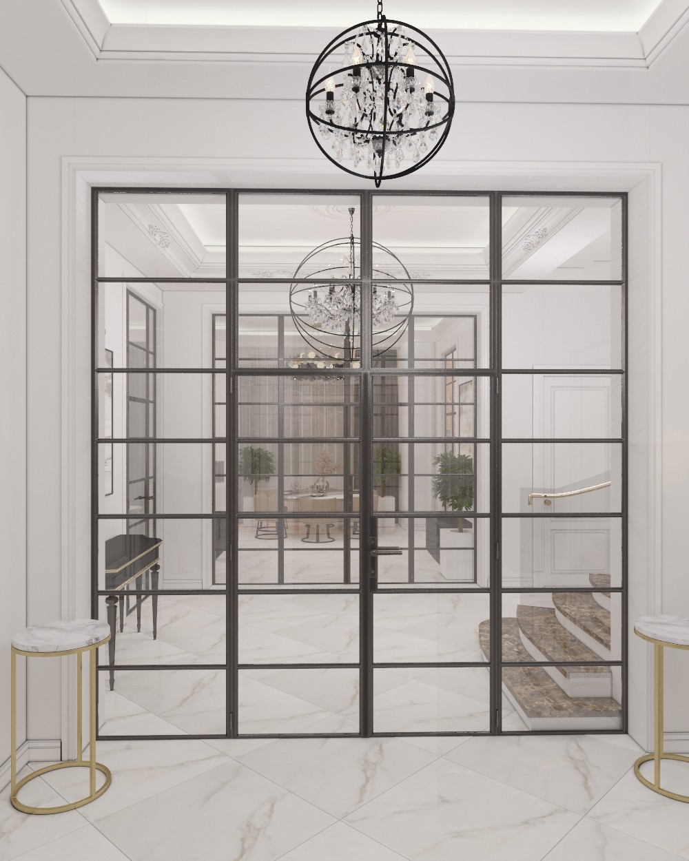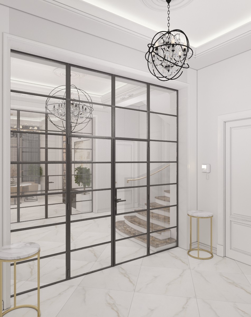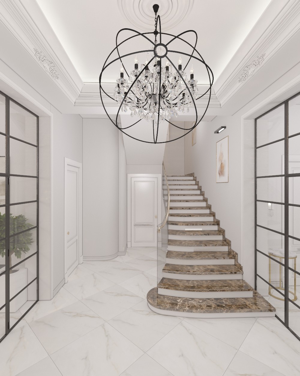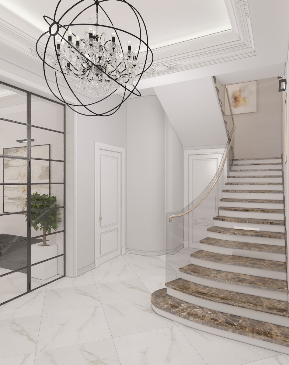 Высота потолков около 4 м. В помещениях предусмотрены различные виды освещение - настенные бра, закарнизная подсветка, потолочное освещение. Дизайн иньтерьеров дома построен на контрасте светлого и темного. Основу палитры составляют нейтральные естественные оттенки. В отделке помещений преобладают натуральные материалы: керамогранит, мрамор, деревянные полы, отделка декоративным кирпичом, латунные элементы, стекло. Зонирование помещений на 1 этаже предусмотрено за счет стеклянных перегородок в стиле лофт. Стеклянные перегородки - это не только способ зонирования пространства, но и элемент декора. Также этот прием использован в мастер спальне на 2 этаже: зонирование спальни и гардеробной.