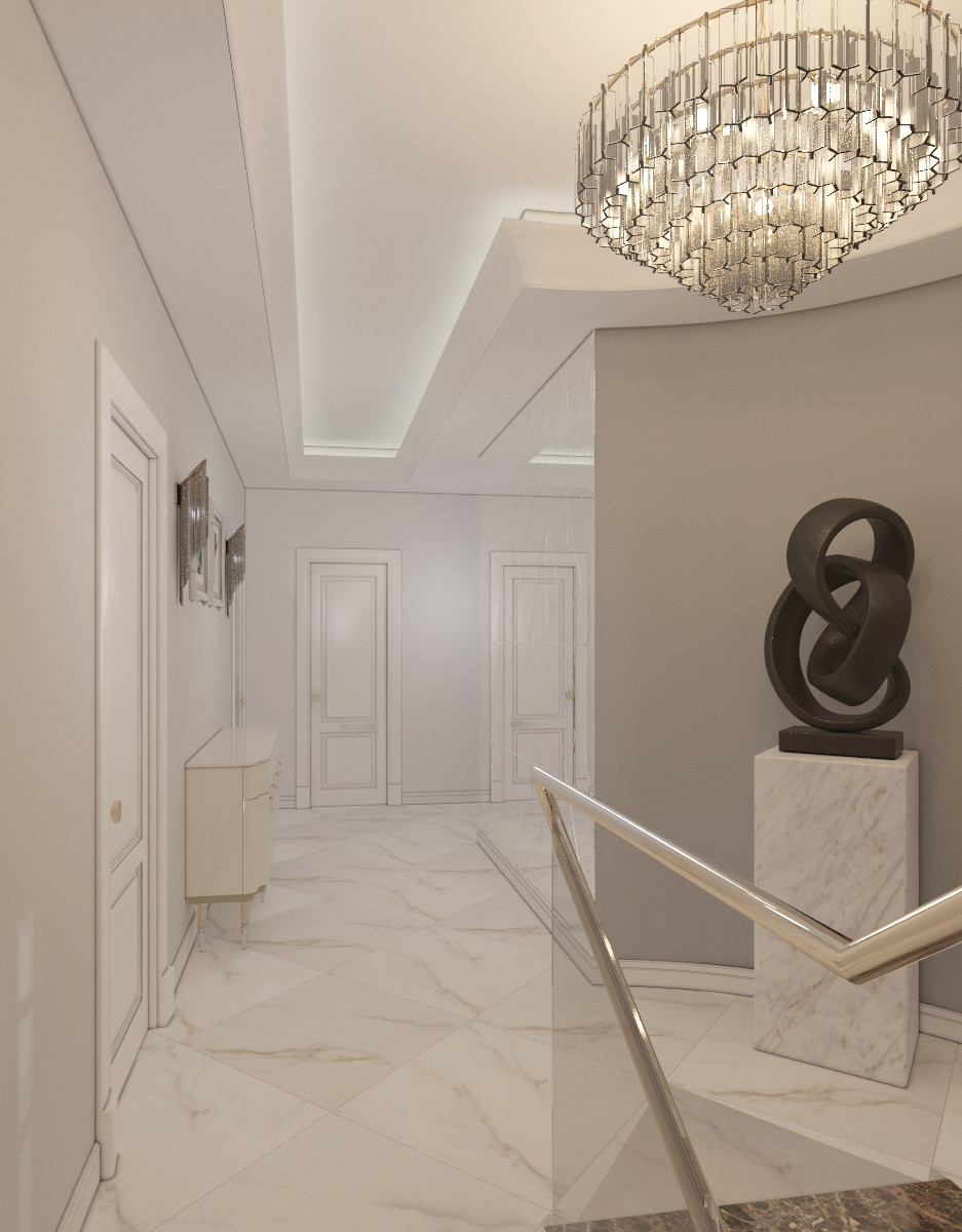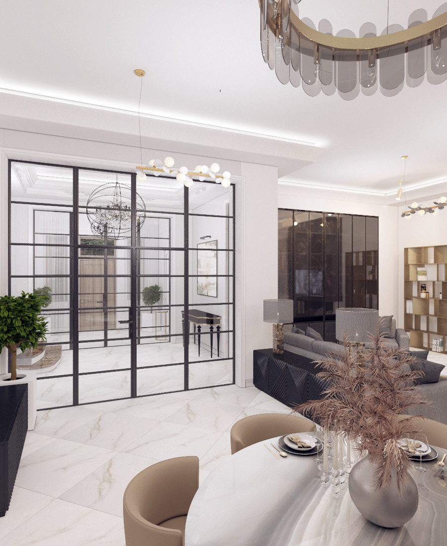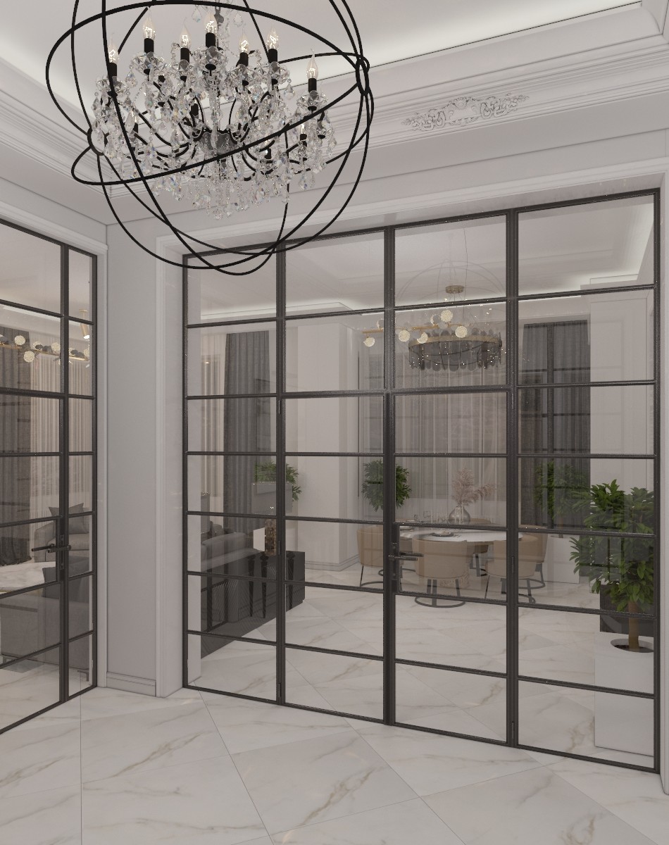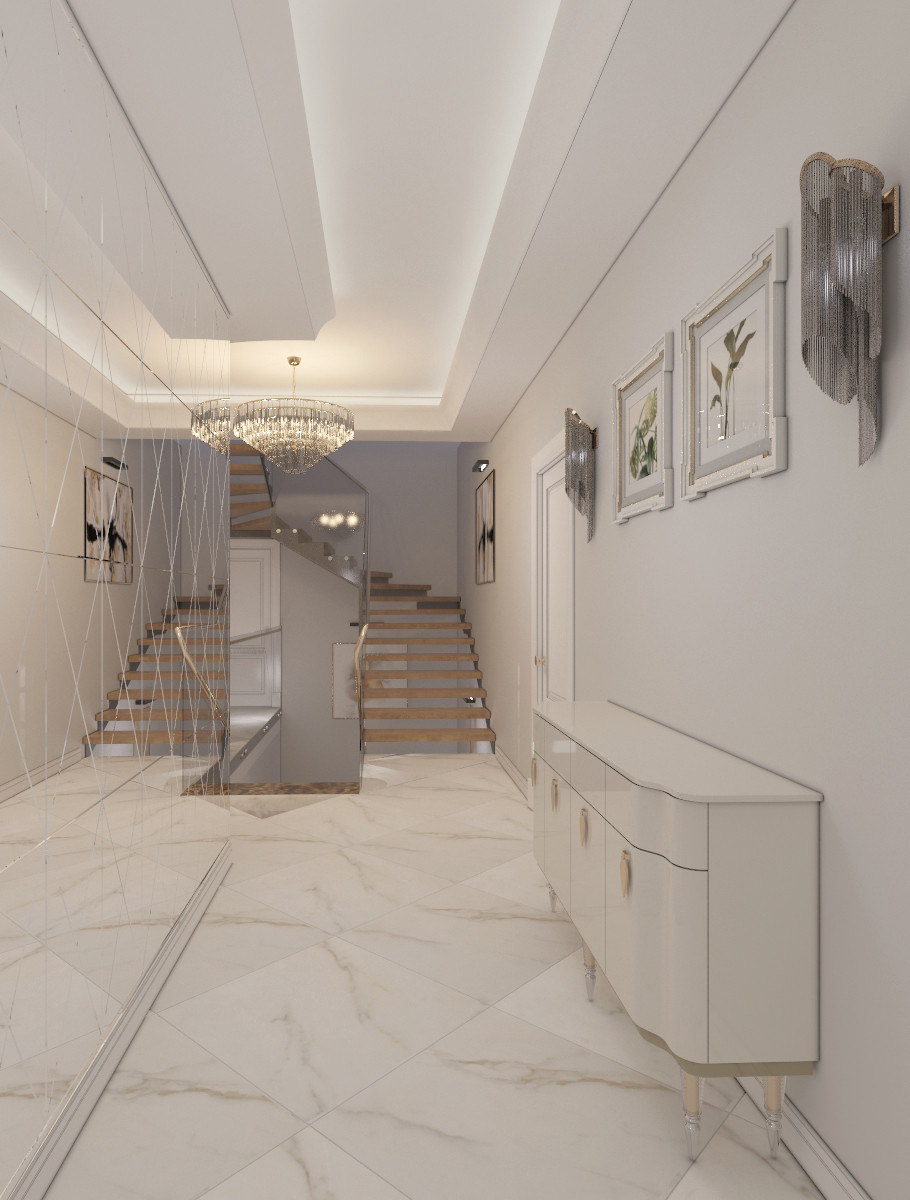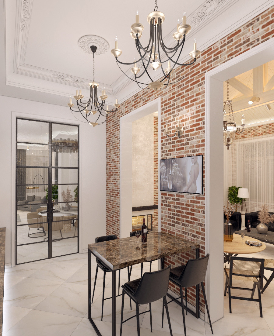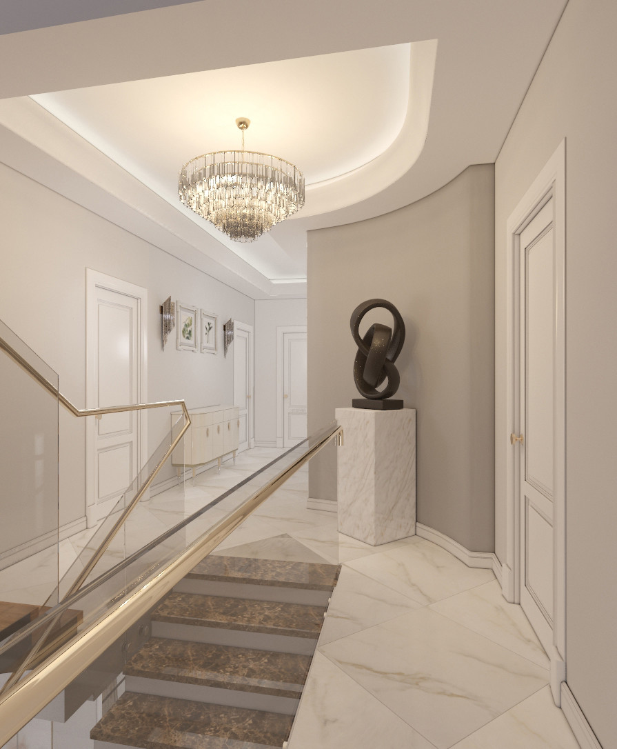 Высота потолков около 4 м. В помещениях предусмотрены различные виды освещение - настенные бра, закарнизная подсветка, потолочное освещение. Дизайн иньтерьеров дома построен на контрасте светлого и темного. Основу палитры составляют нейтральные естественные оттенки. В отделке помещений преобладают натуральные материалы: керамогранит, мрамор, деревянные полы, отделка декоративным кирпичом, латунные элементы, стекло. Зонирование помещений на 1 этаже предусмотрено за счет стеклянных перегородок в стиле лофт. Стеклянные перегородки - это не только способ зонирования пространства, но и элемент декора. Также этот прием использован в мастер спальне на 2 этаже: зонирование спальни и гардеробной.