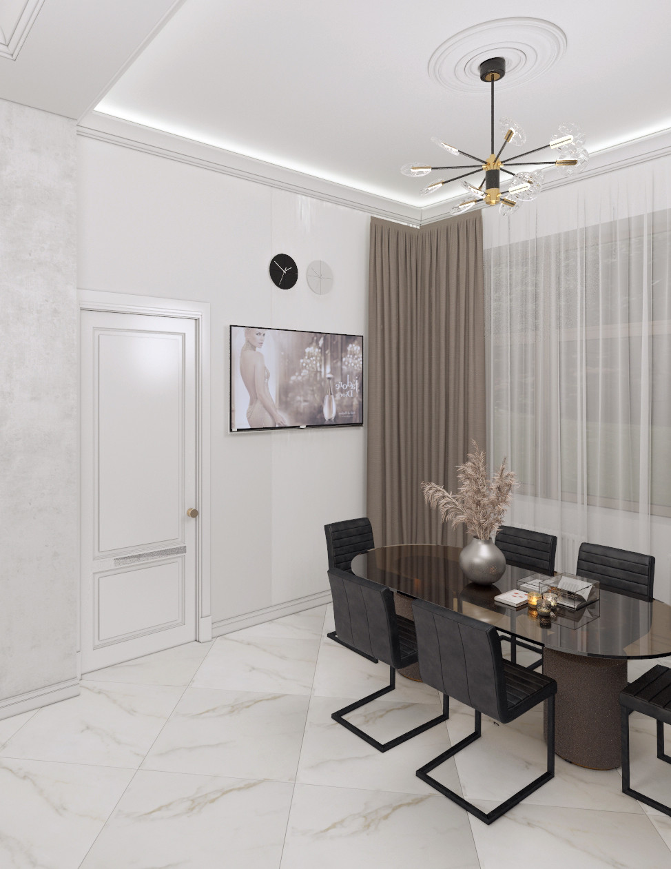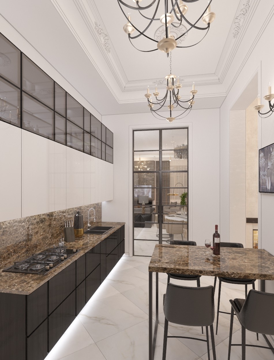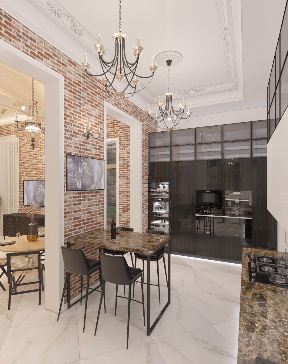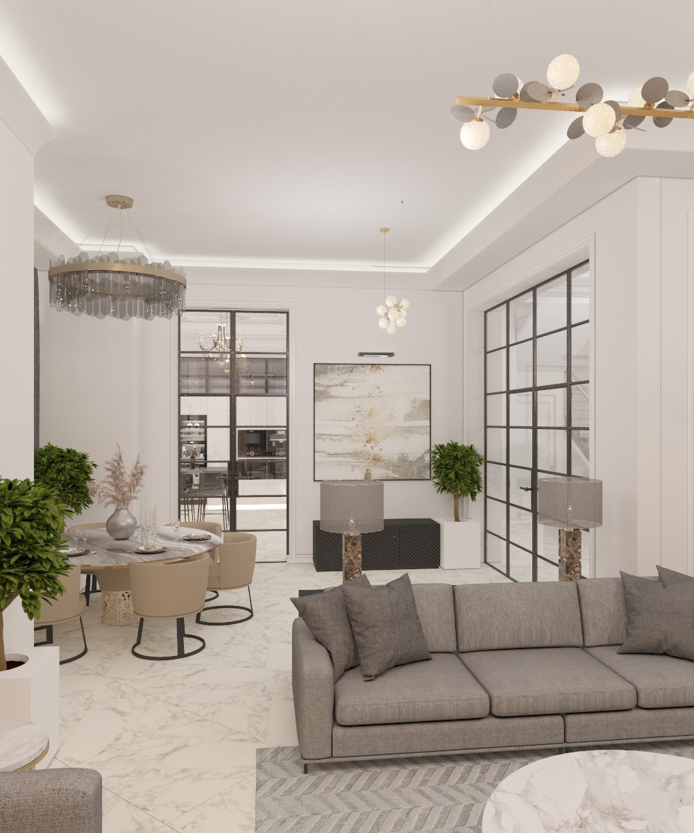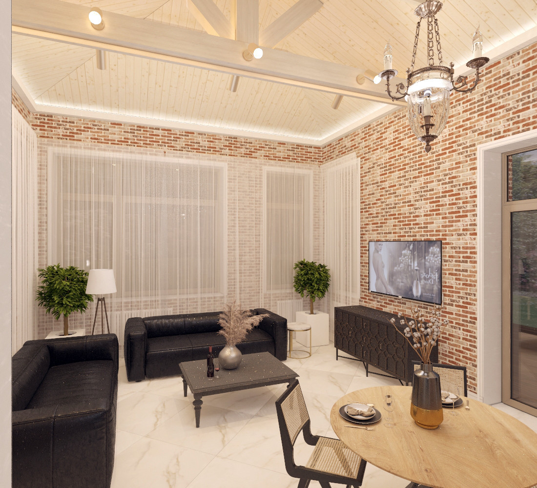 Высота потолков около 4 м. В помещениях предусмотрены различные виды освещение - настенные бра, закарнизная подсветка, потолочное освещение. Дизайн иньтерьеров дома построен на контрасте светлого и темного. Основу палитры составляют нейтральные естественные оттенки. В отделке помещений преобладают натуральные материалы: керамогранит, мрамор, деревянные полы, отделка декоративным кирпичом, латунные элементы, стекло. Зонирование помещений на 1 этаже предусмотрено за счет стеклянных перегородок в стиле лофт. Стеклянные перегородки - это не только способ зонирования пространства, но и элемент декора. Также этот прием использован в мастер спальне на 2 этаже: зонирование спальни и гардеробной.