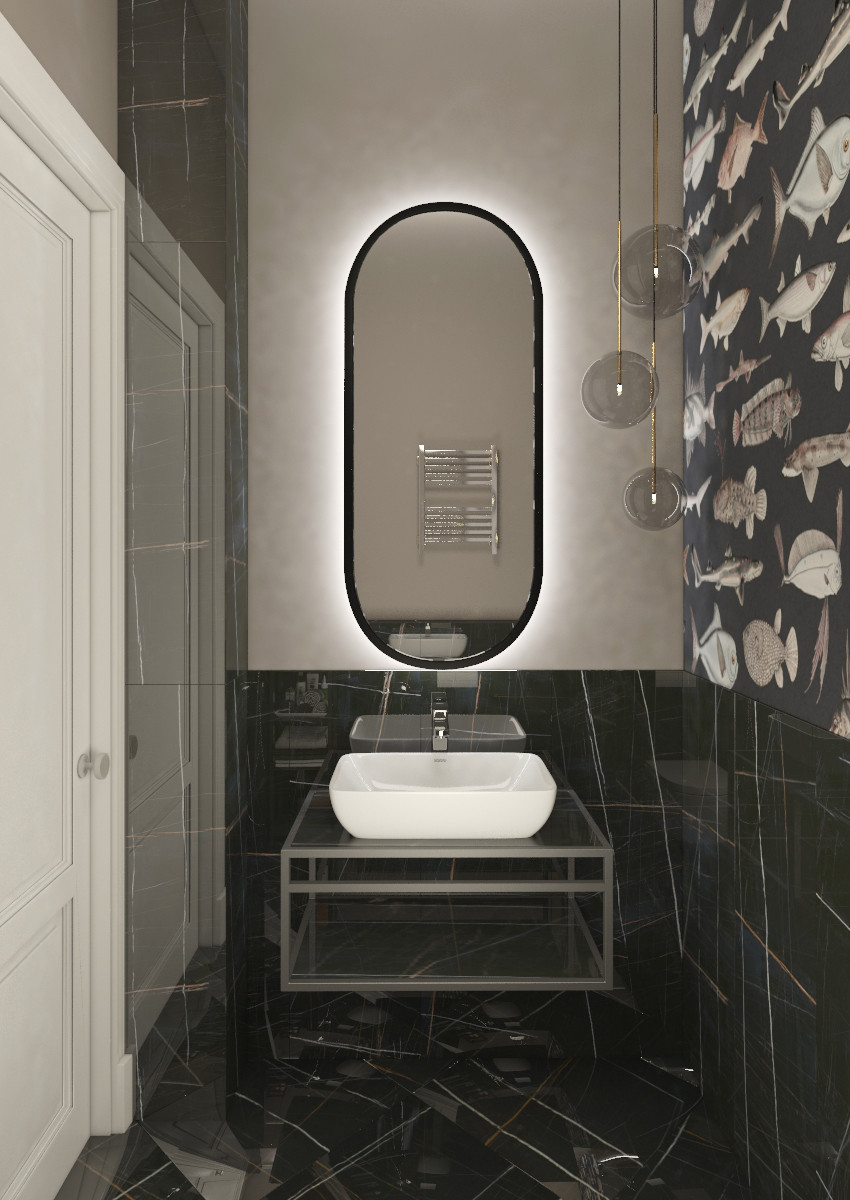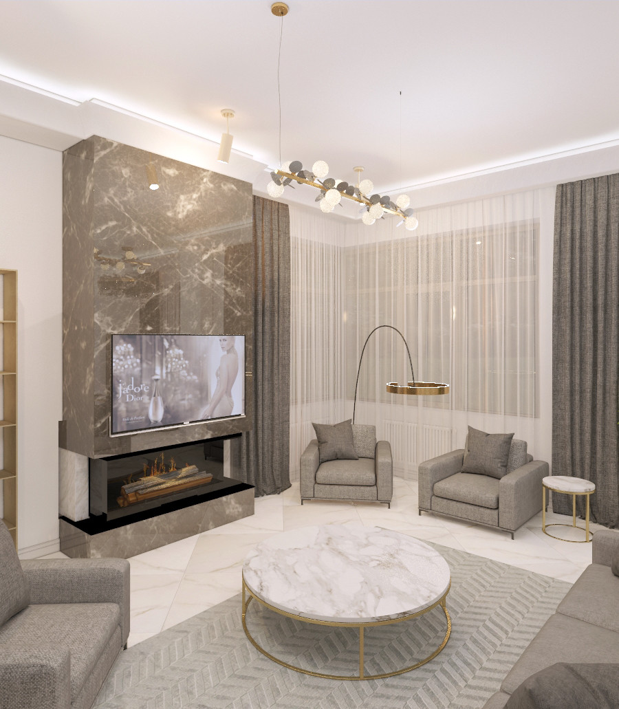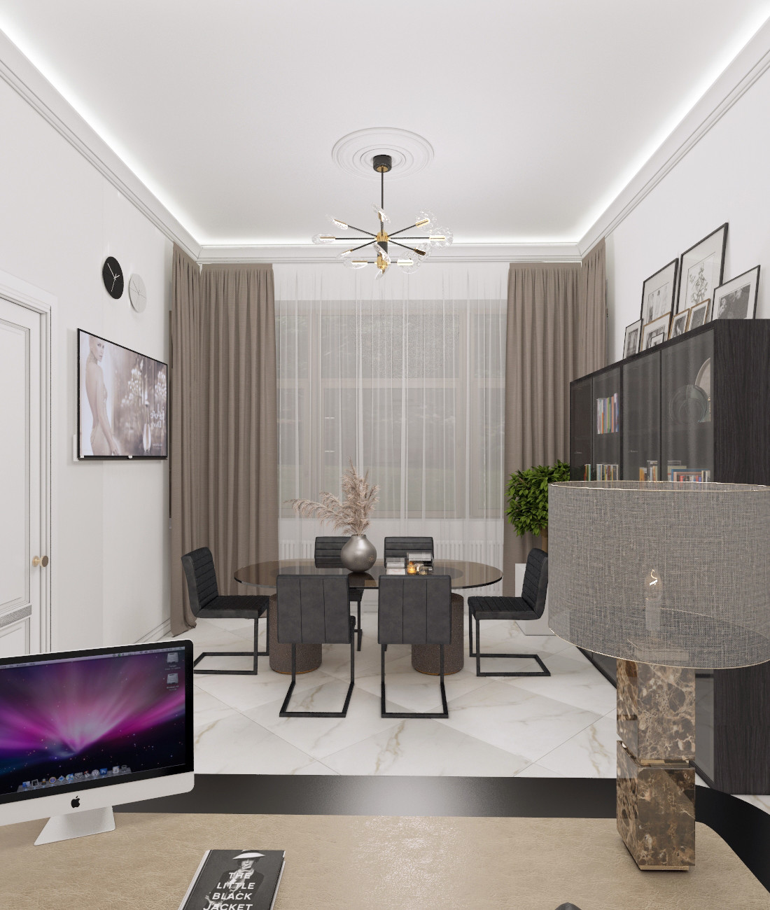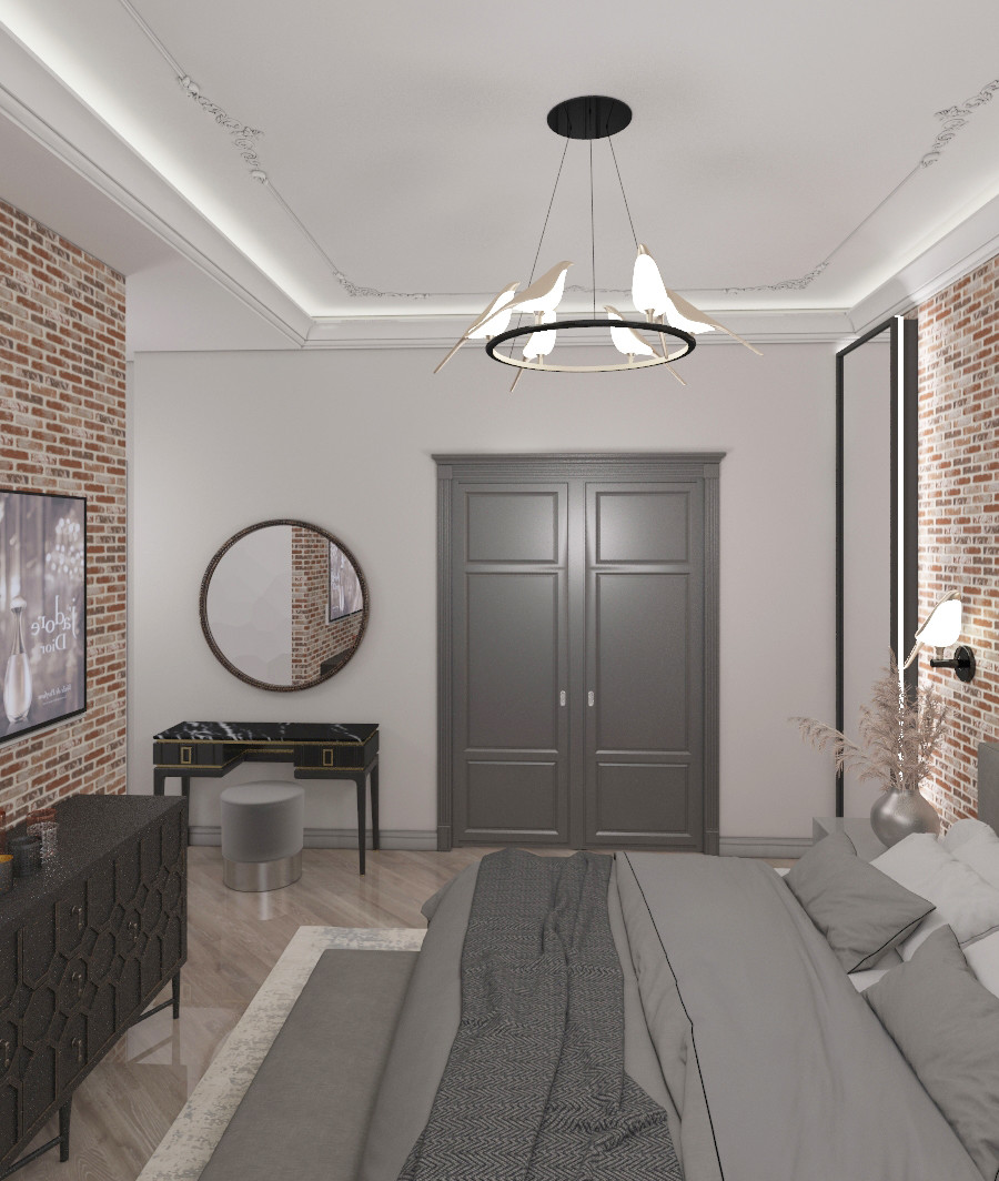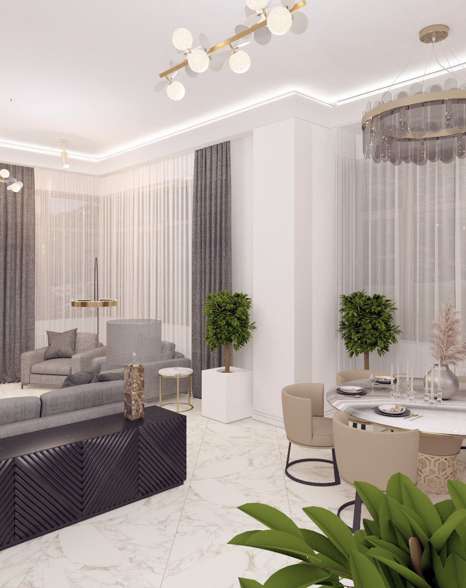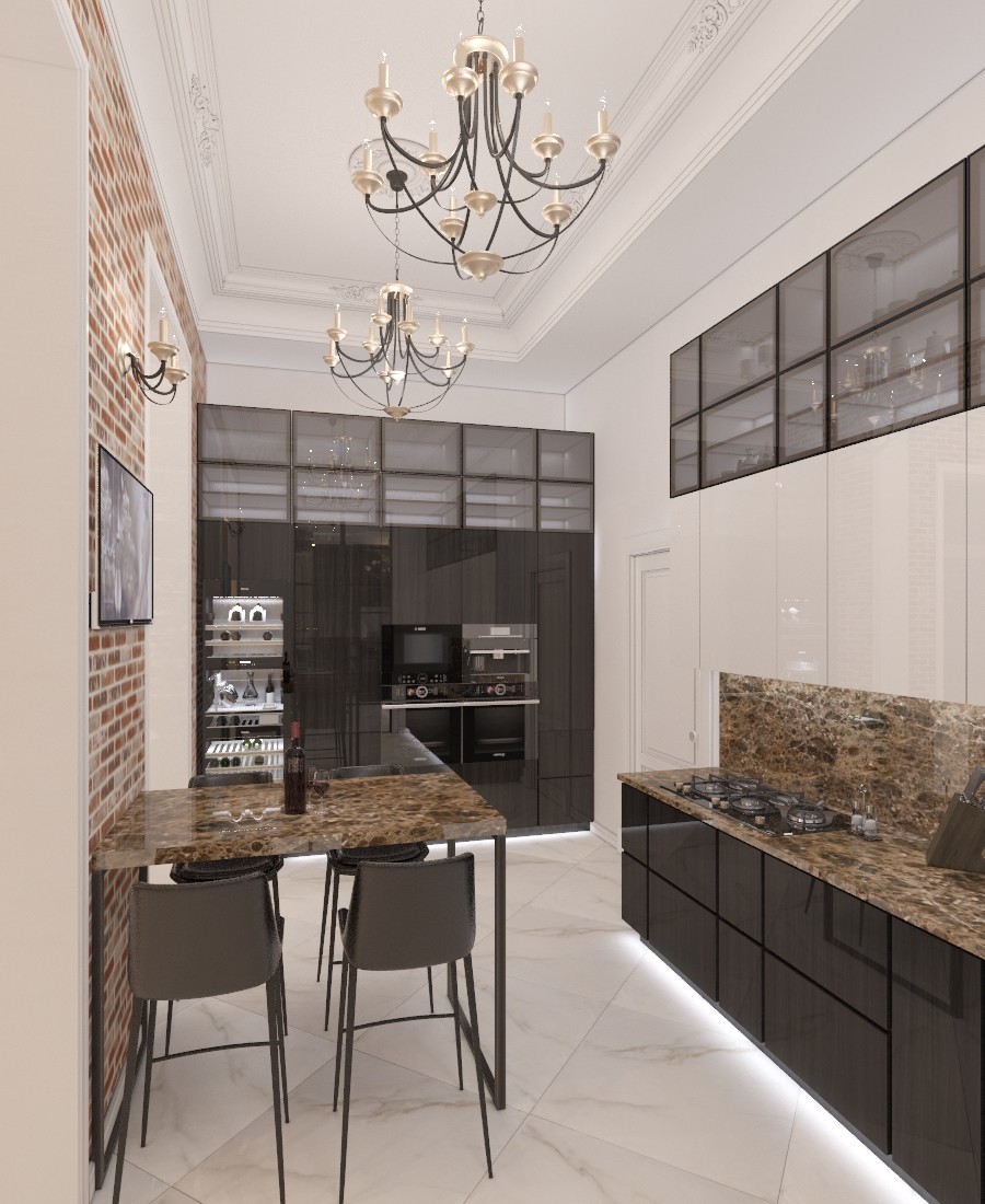 Высота потолков около 4 м. В помещениях предусмотрены различные виды освещение - настенные бра, закарнизная подсветка, потолочное освещение. Дизайн иньтерьеров дома построен на контрасте светлого и темного. Основу палитры составляют нейтральные естественные оттенки. В отделке помещений преобладают натуральные материалы: керамогранит, мрамор, деревянные полы, отделка декоративным кирпичом, латунные элементы, стекло. Зонирование помещений на 1 этаже предусмотрено за счет стеклянных перегородок в стиле лофт. Стеклянные перегородки - это не только способ зонирования пространства, но и элемент декора. Также этот прием использован в мастер спальне на 2 этаже: зонирование спальни и гардеробной.