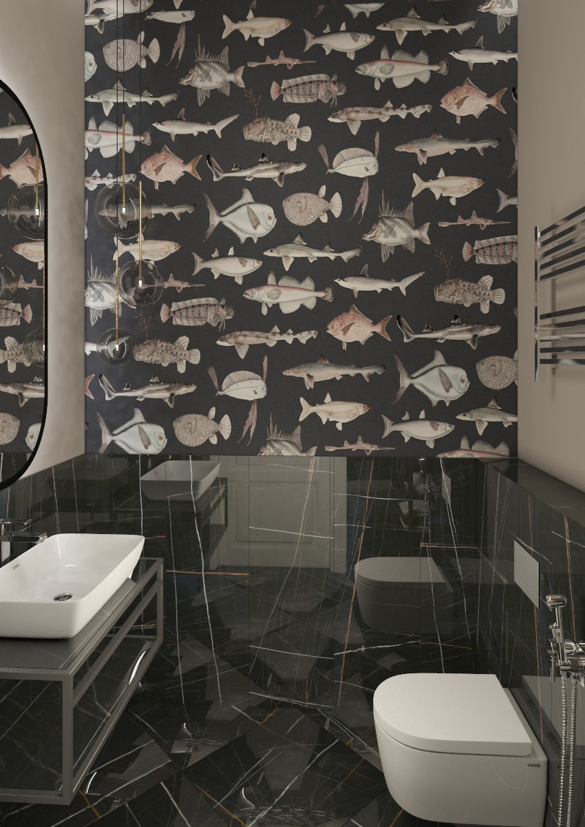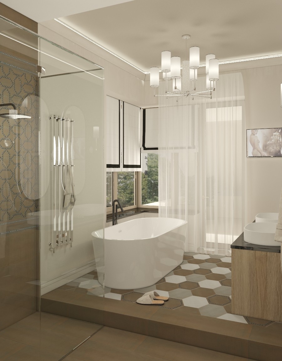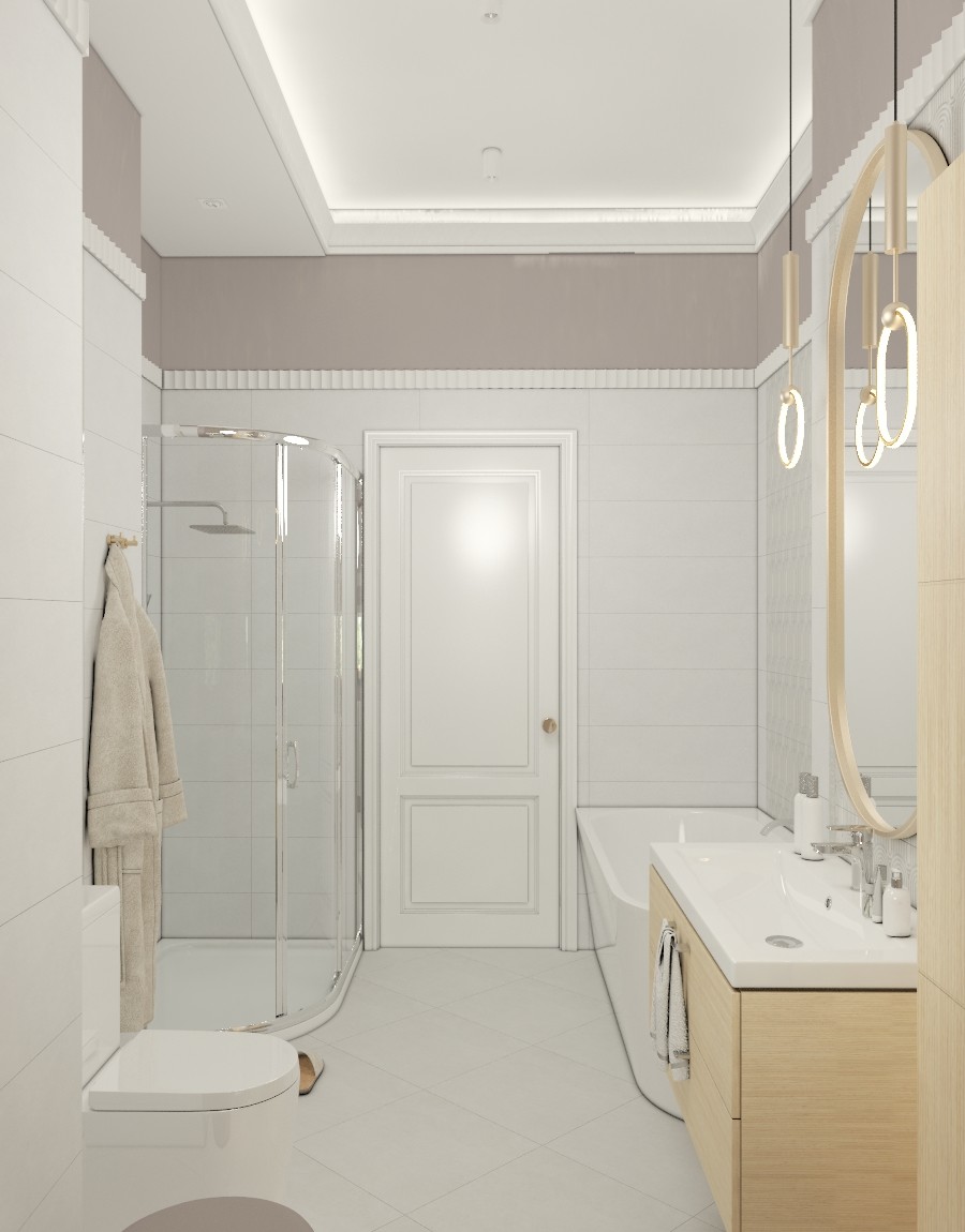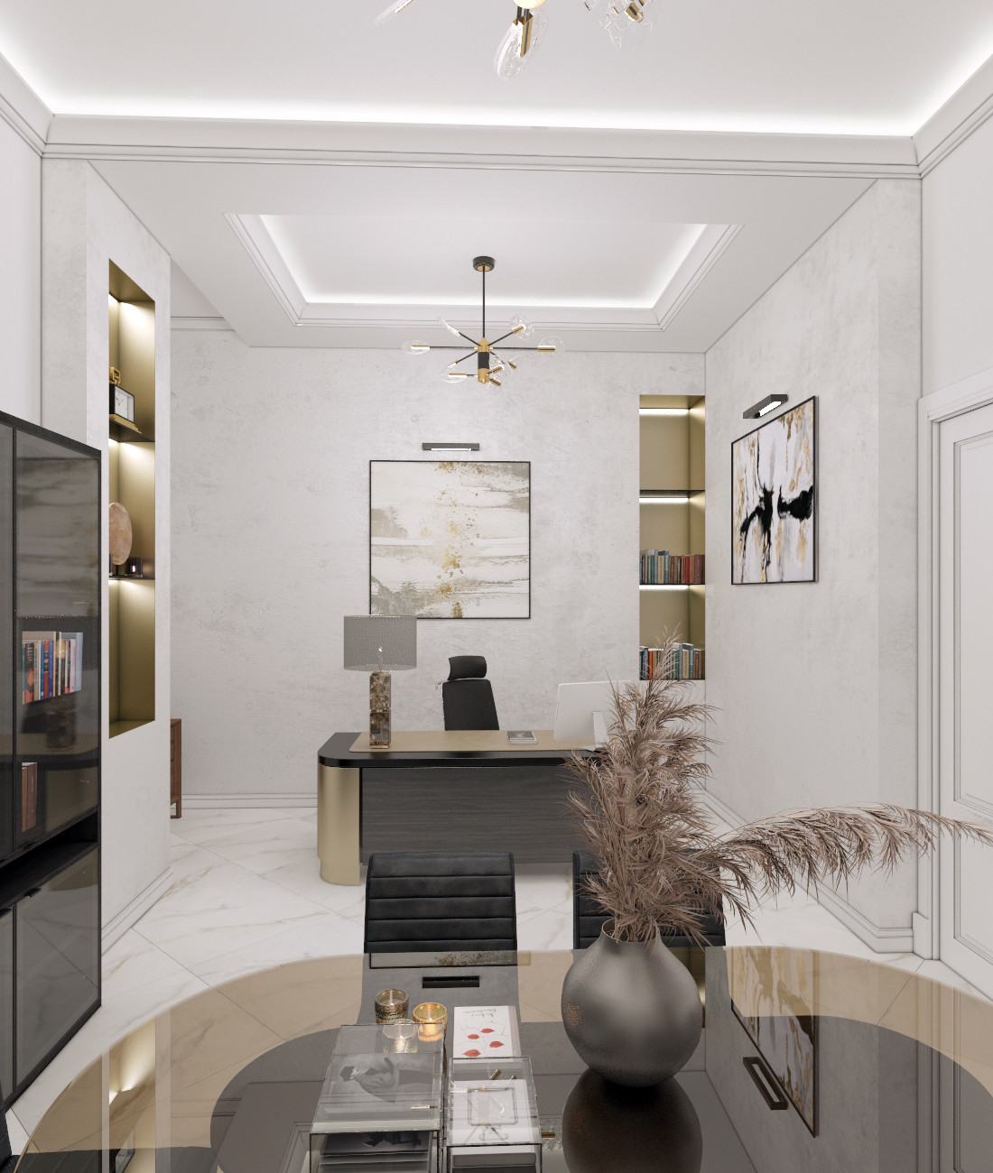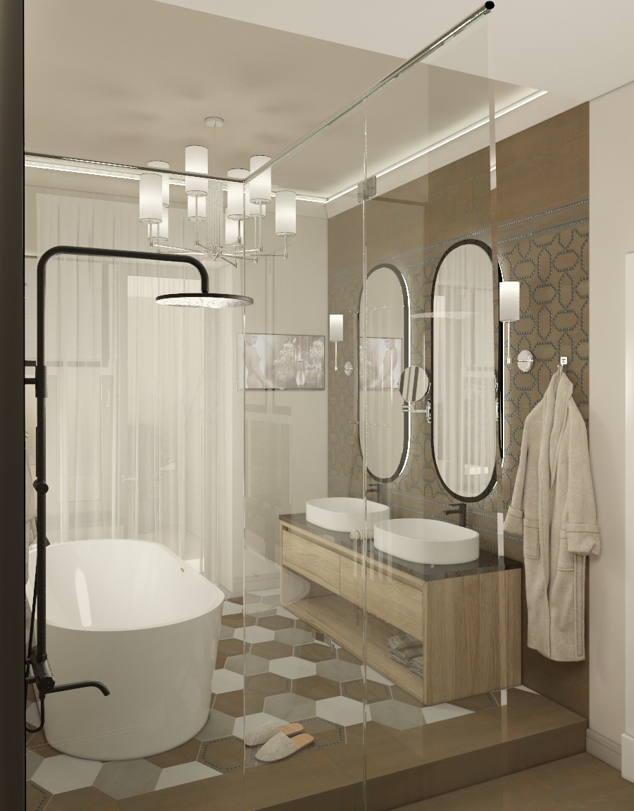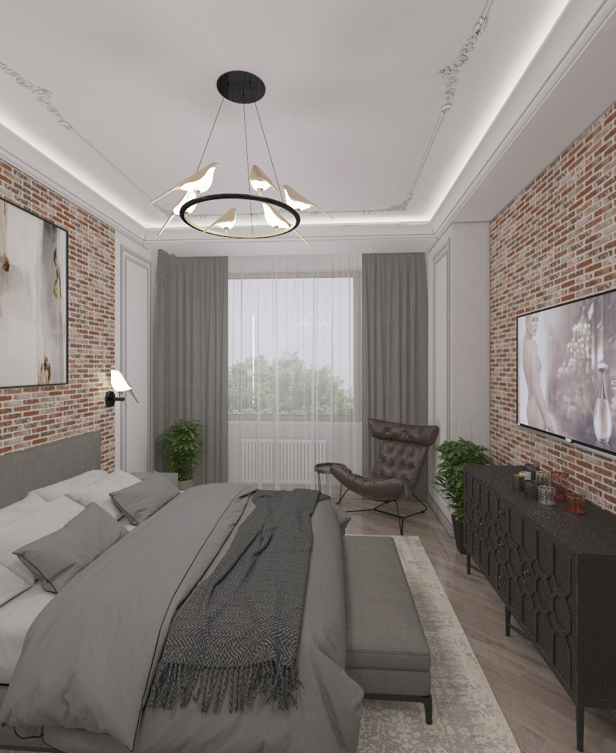 Высота потолков около 4 м. В помещениях предусмотрены различные виды освещение - настенные бра, закарнизная подсветка, потолочное освещение. Дизайн иньтерьеров дома построен на контрасте светлого и темного. Основу палитры составляют нейтральные естественные оттенки. В отделке помещений преобладают натуральные материалы: керамогранит, мрамор, деревянные полы, отделка декоративным кирпичом, латунные элементы, стекло. Зонирование помещений на 1 этаже предусмотрено за счет стеклянных перегородок в стиле лофт. Стеклянные перегородки - это не только способ зонирования пространства, но и элемент декора. Также этот прием использован в мастер спальне на 2 этаже: зонирование спальни и гардеробной.