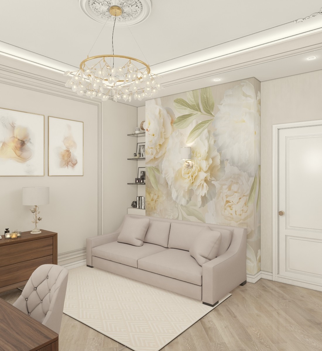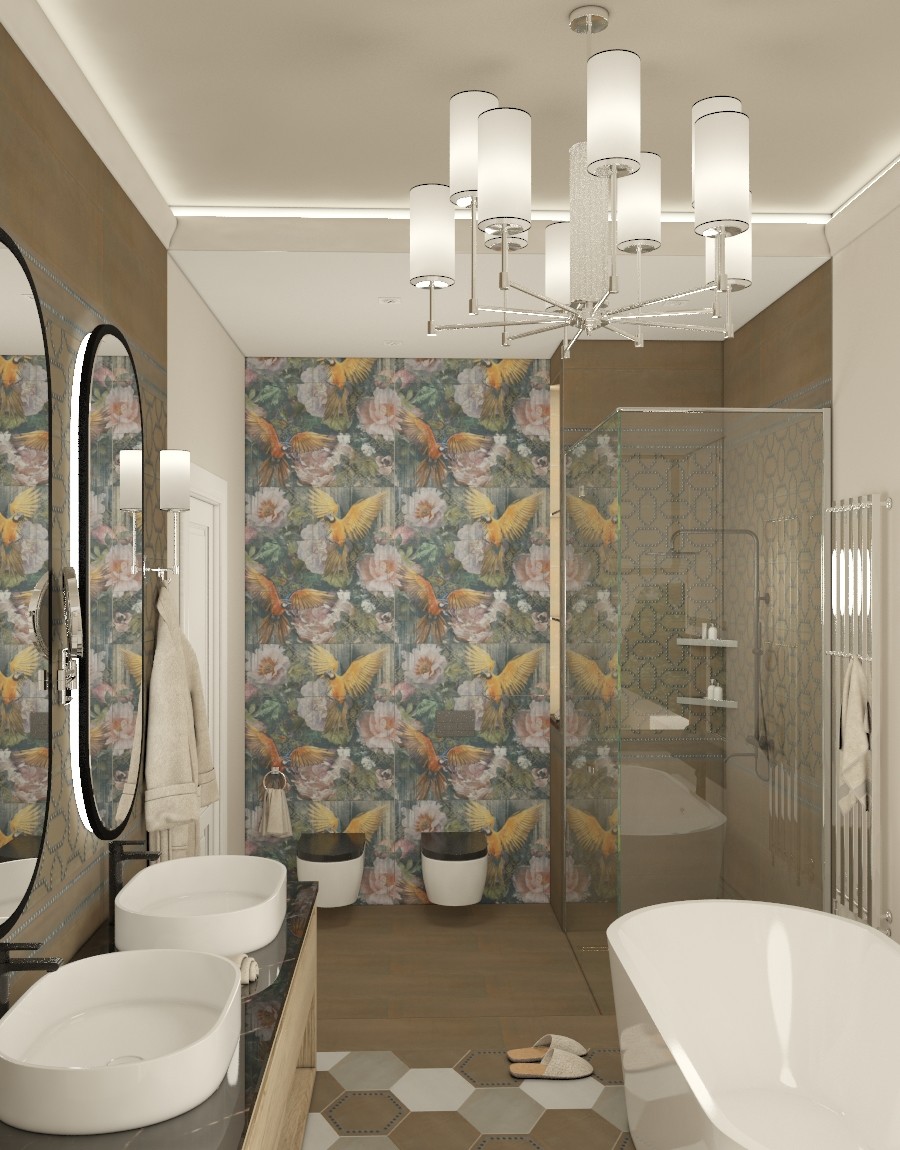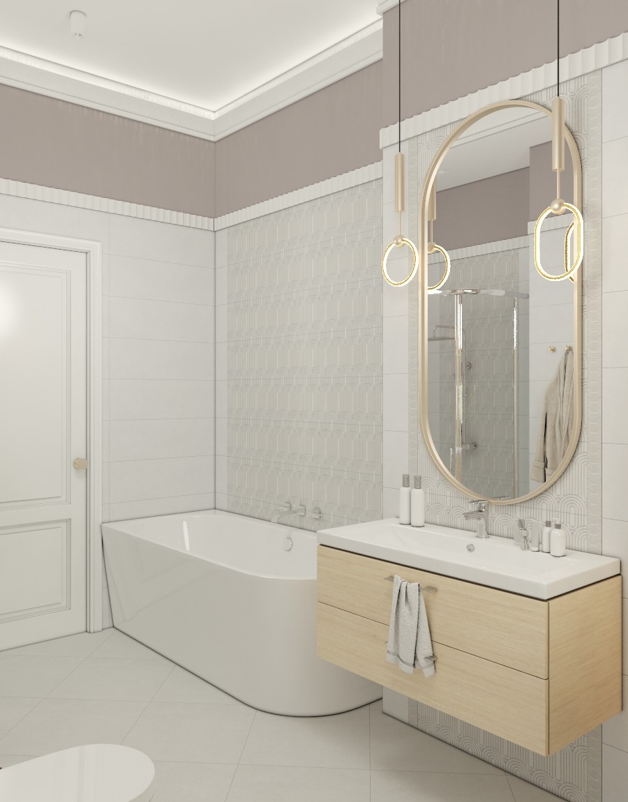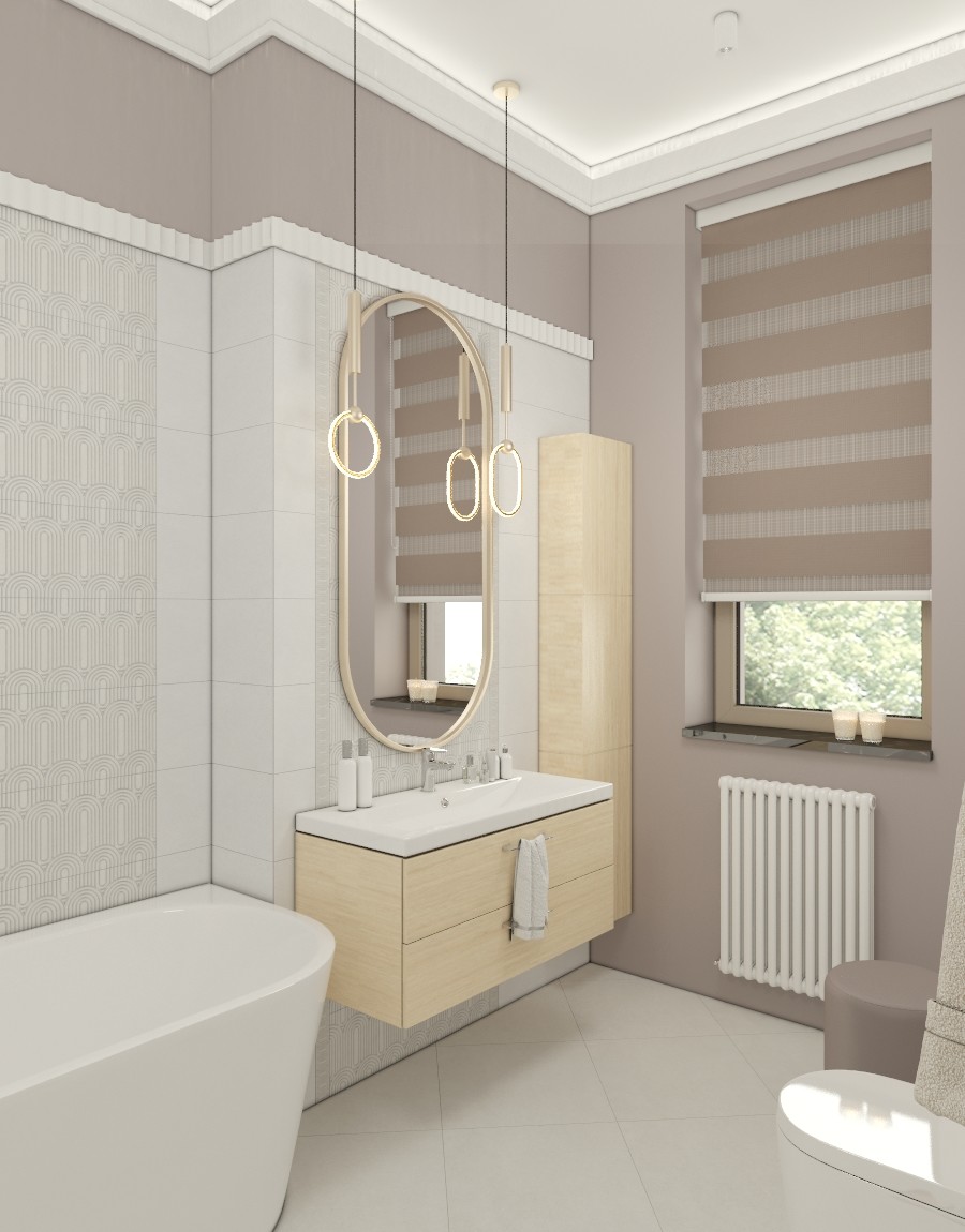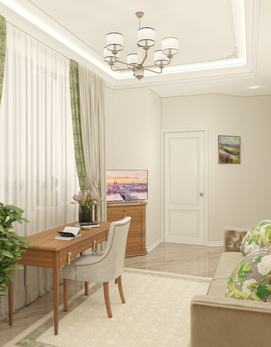 Высота потолков около 4 м. В помещениях предусмотрены различные виды освещение - настенные бра, закарнизная подсветка, потолочное освещение. Дизайн иньтерьеров дома построен на контрасте светлого и темного. Основу палитры составляют нейтральные естественные оттенки. В отделке помещений преобладают натуральные материалы: керамогранит, мрамор, деревянные полы, отделка декоративным кирпичом, латунные элементы, стекло. Зонирование помещений на 1 этаже предусмотрено за счет стеклянных перегородок в стиле лофт. Стеклянные перегородки - это не только способ зонирования пространства, но и элемент декора. Также этот прием использован в мастер спальне на 2 этаже: зонирование спальни и гардеробной.