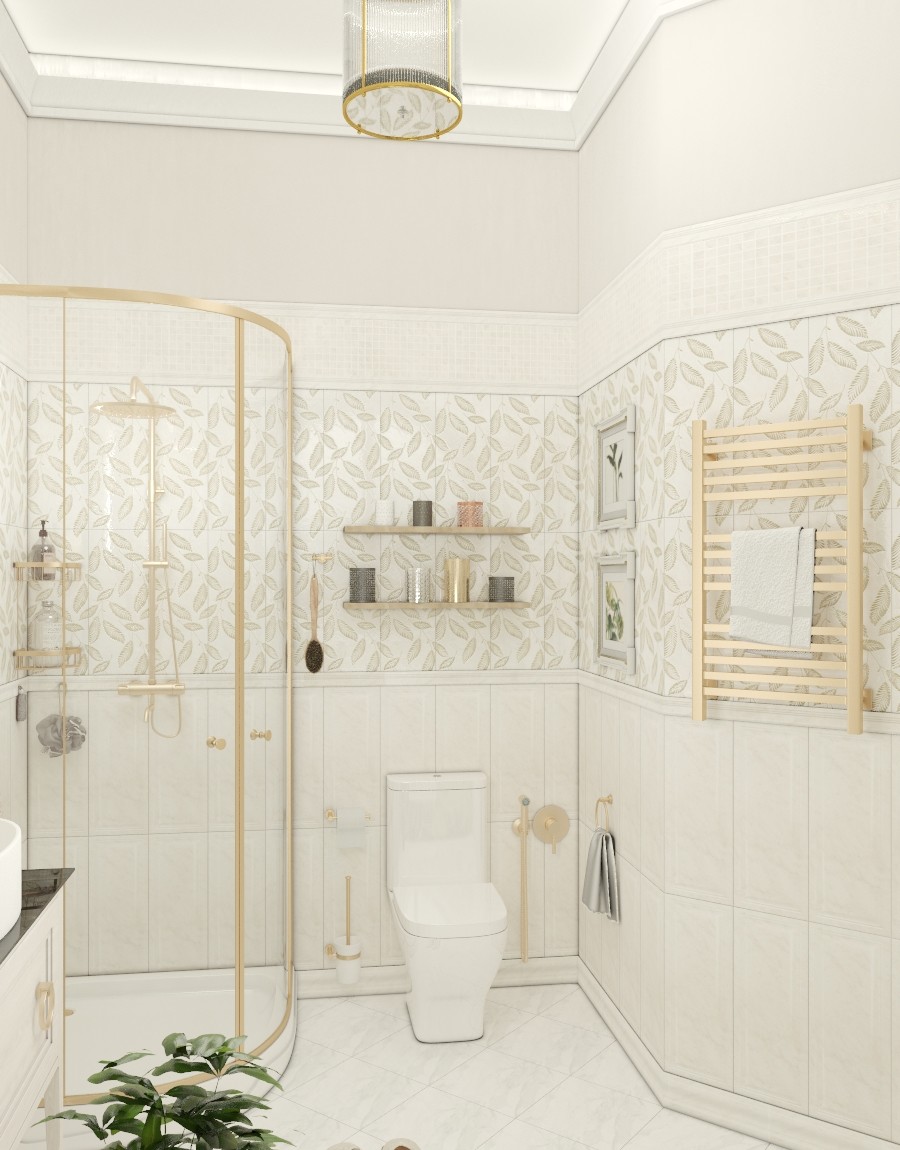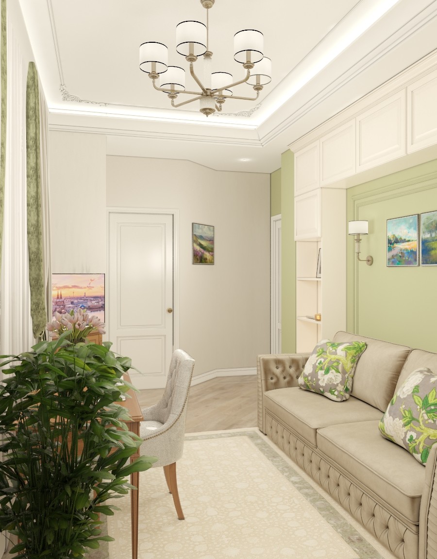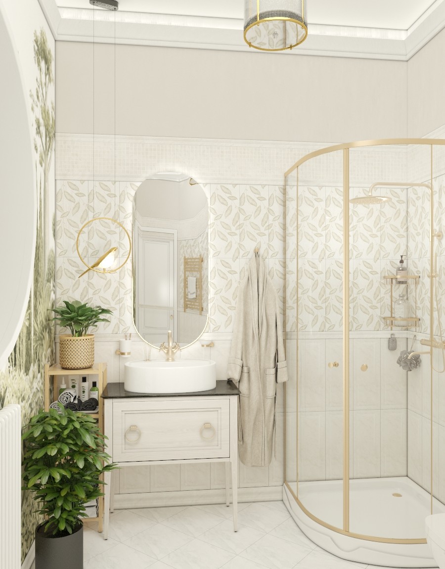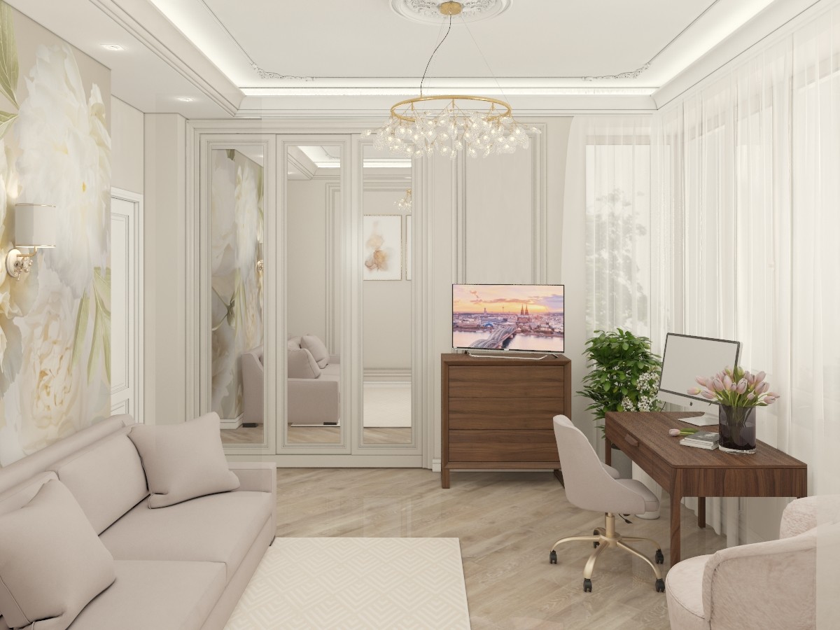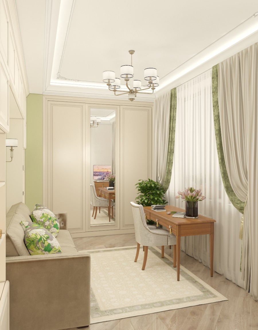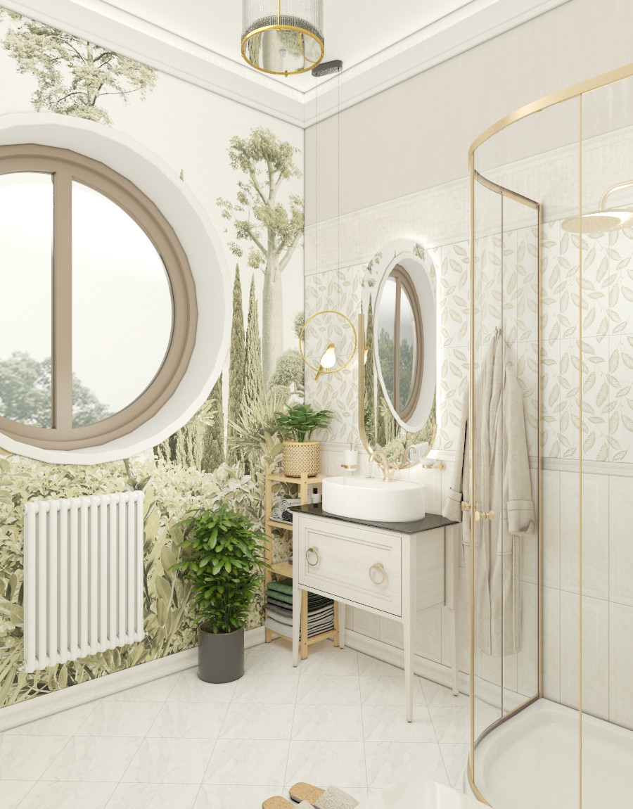 Высота потолков около 4 м. В помещениях предусмотрены различные виды освещение - настенные бра, закарнизная подсветка, потолочное освещение. Дизайн иньтерьеров дома построен на контрасте светлого и темного. Основу палитры составляют нейтральные естественные оттенки. В отделке помещений преобладают натуральные материалы: керамогранит, мрамор, деревянные полы, отделка декоративным кирпичом, латунные элементы, стекло. Зонирование помещений на 1 этаже предусмотрено за счет стеклянных перегородок в стиле лофт. Стеклянные перегородки - это не только способ зонирования пространства, но и элемент декора. Также этот прием использован в мастер спальне на 2 этаже: зонирование спальни и гардеробной.